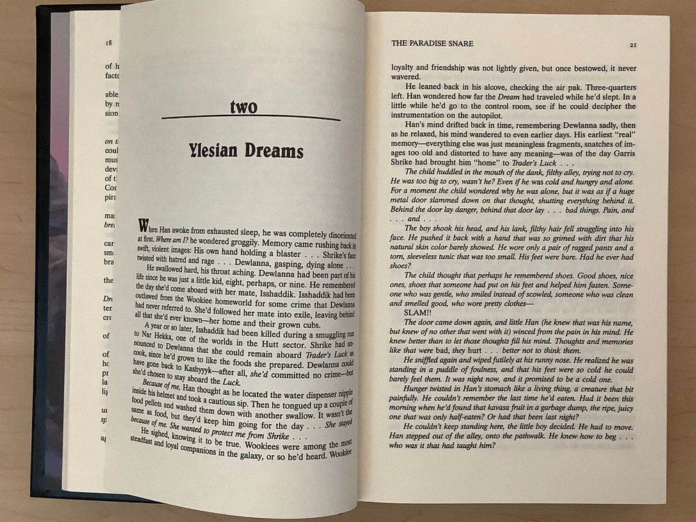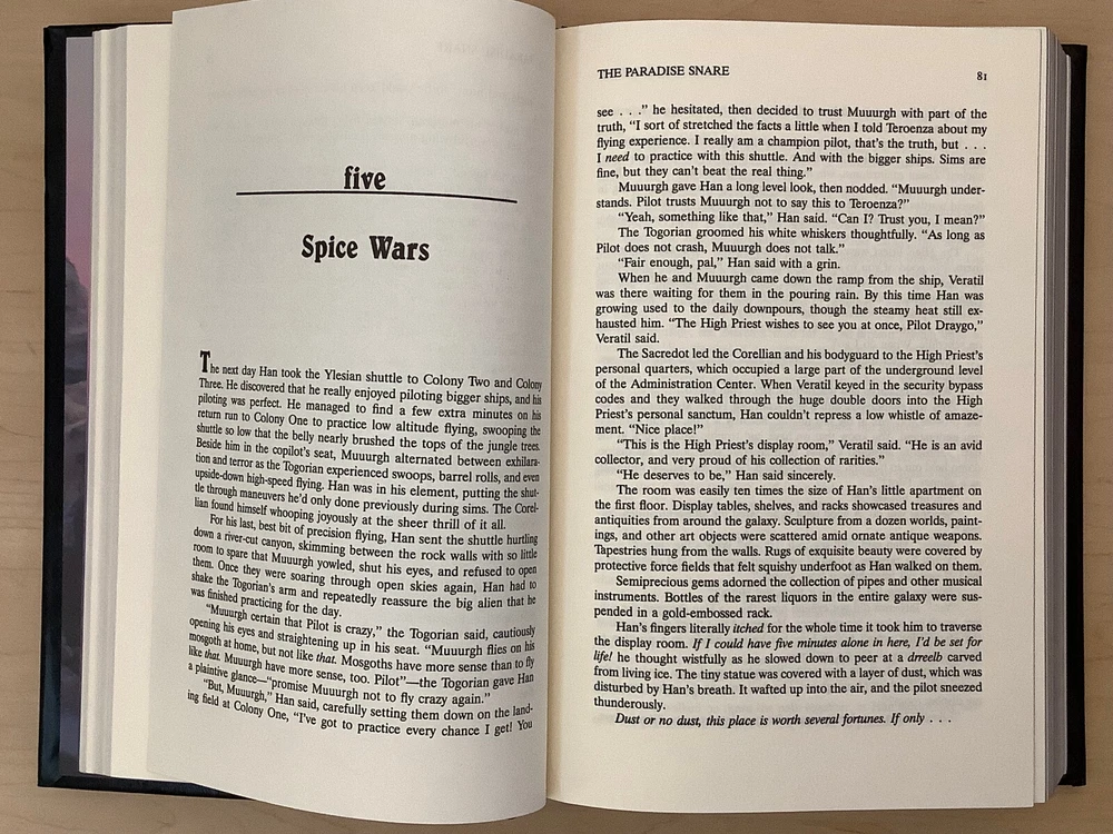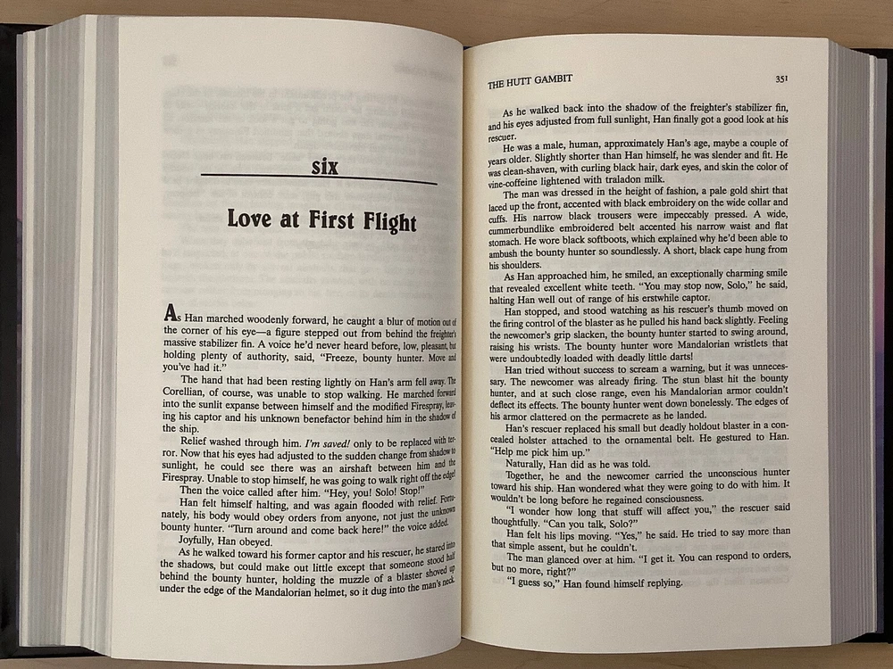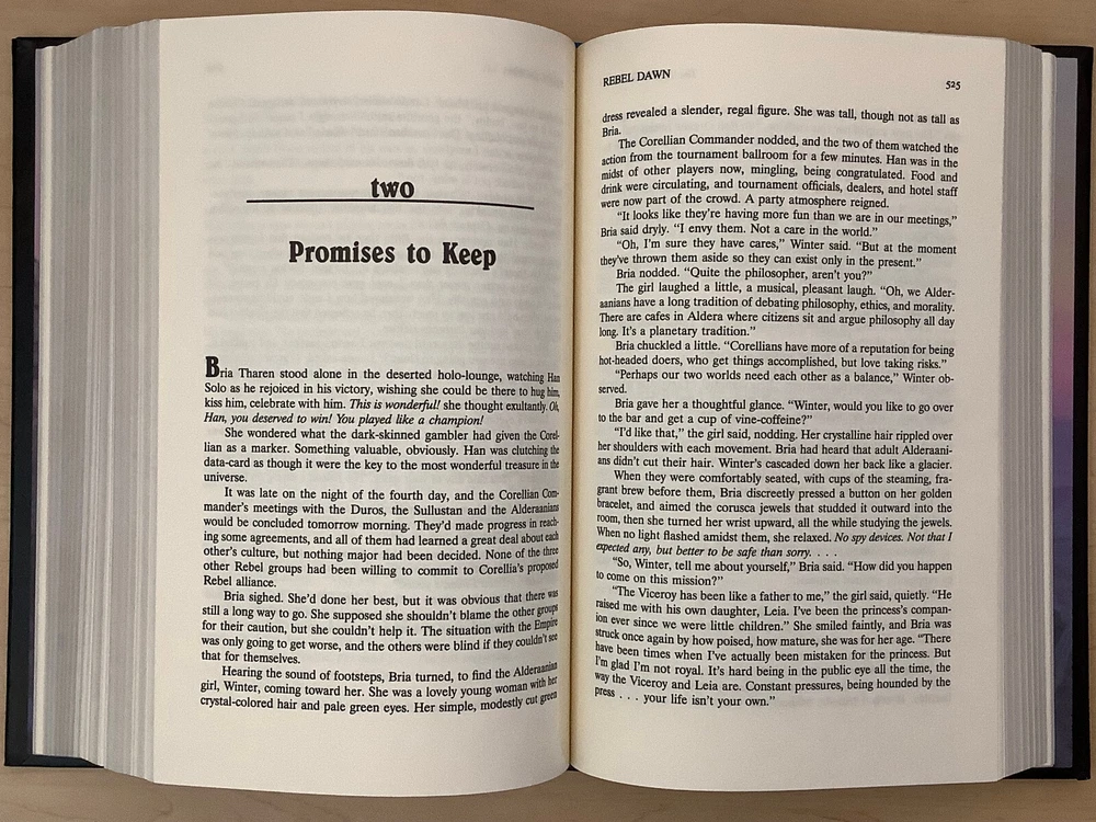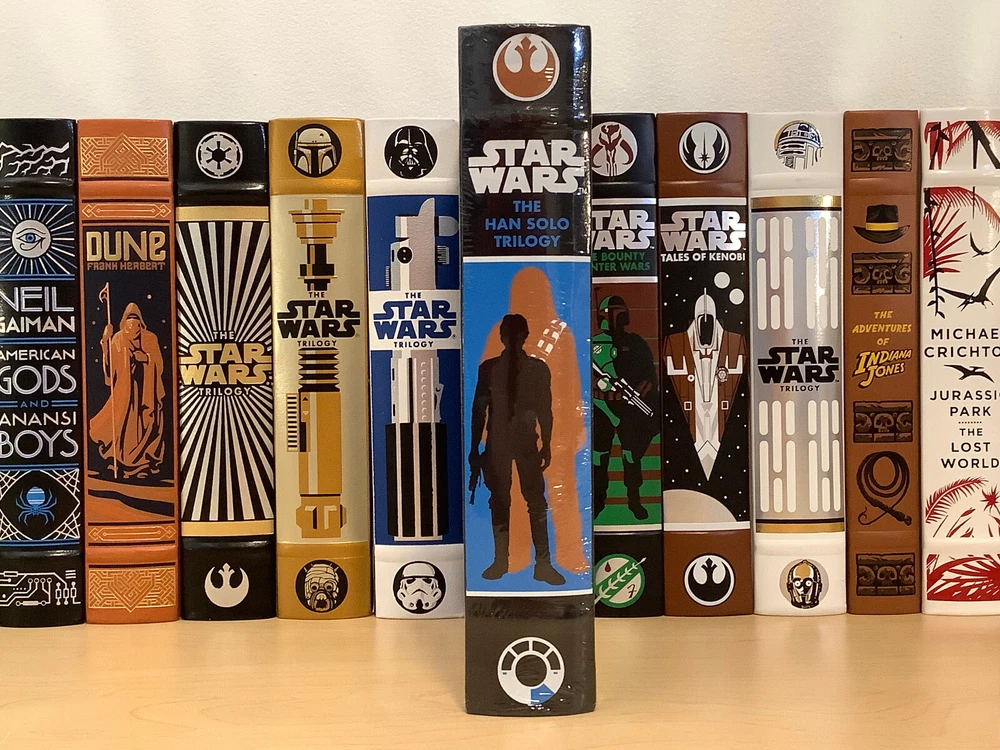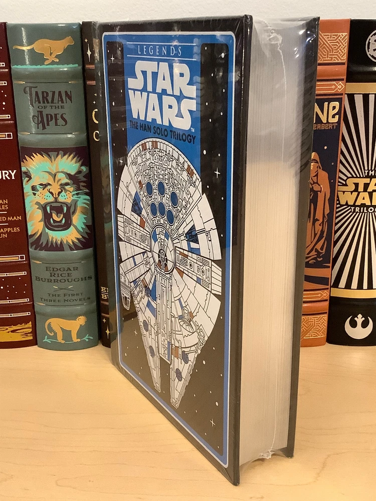 The Han Solo Trilogy by A.C. Crispin - Legends Star Wars bound in leather, with silver edged pages and a ribbon marker contents: The Paradise Snare The Hutt Gambit Rebel Dawn Item Condition: This is a sealed, unread leatherbound hardcover. The seal is beginning to open and there are some minor flaws to the silver page edging. The spine and corners are mildly bumped. Dimensions are approx: 9.25 x 6.25" x 1.75" This book will ship in a box with bubble wrap. Photos #1-8 are of the actual book that will be shipped, the rest are examples of the book from an open copy.