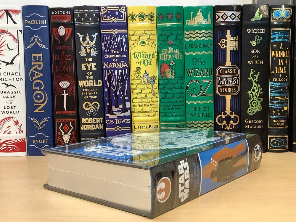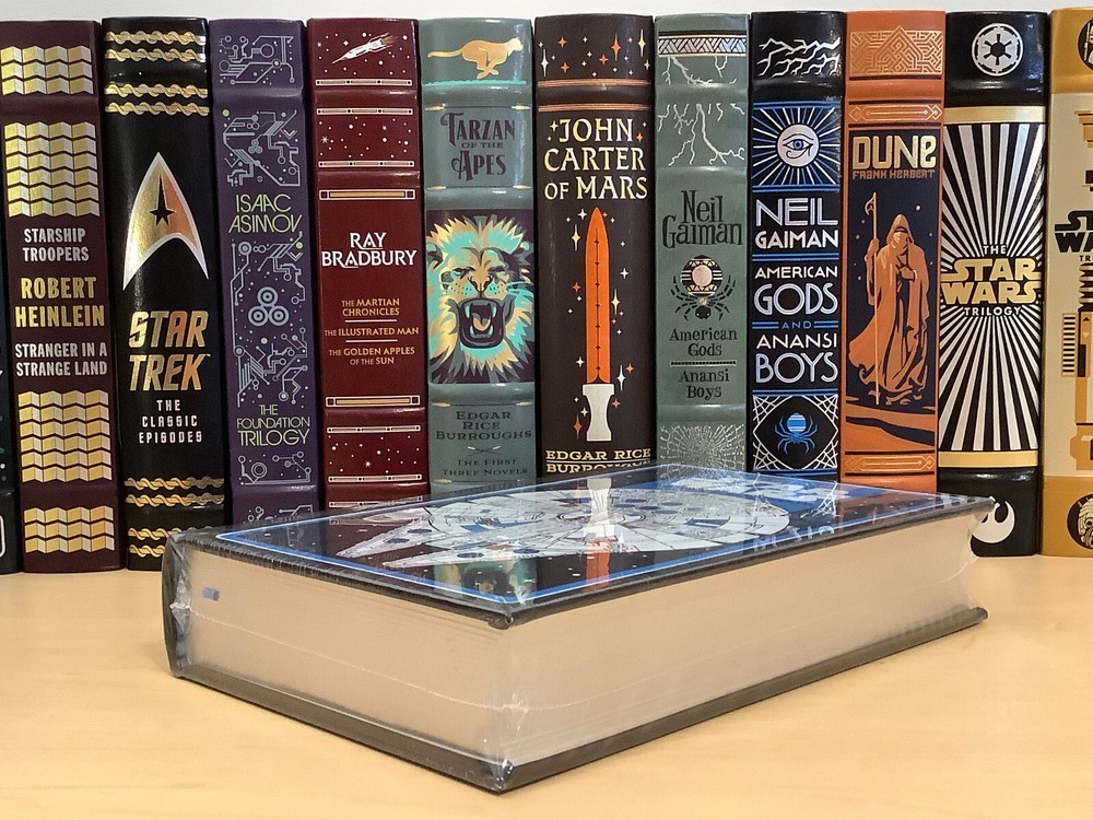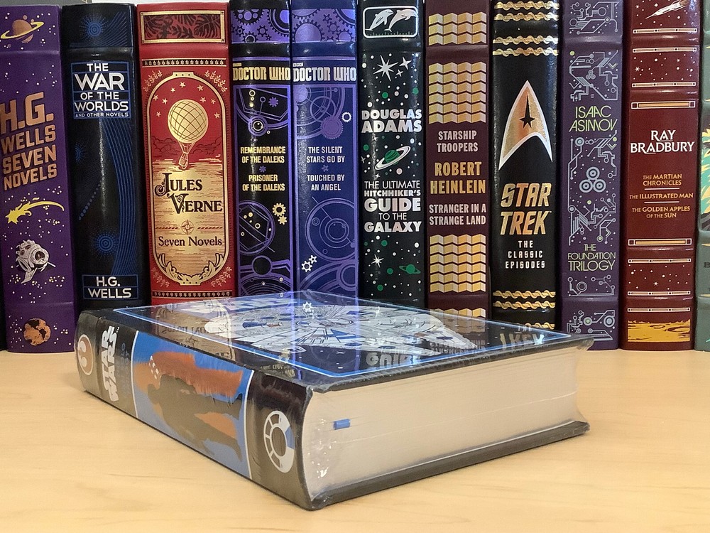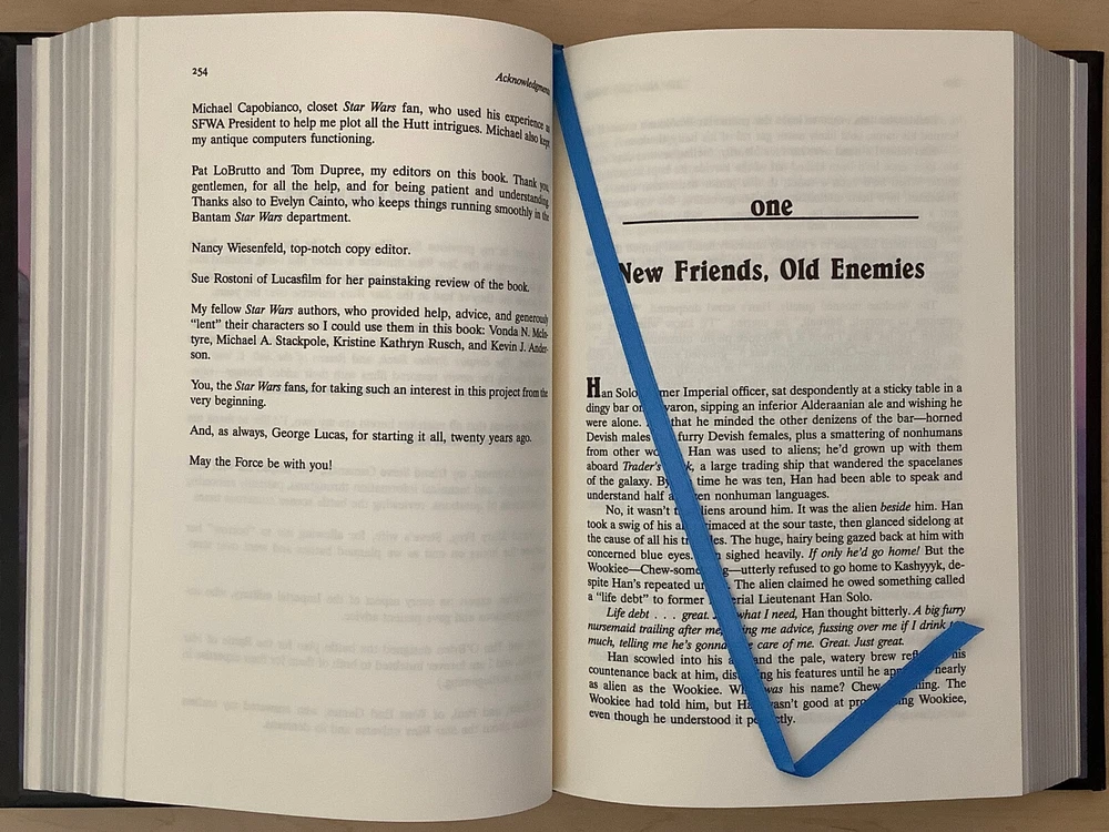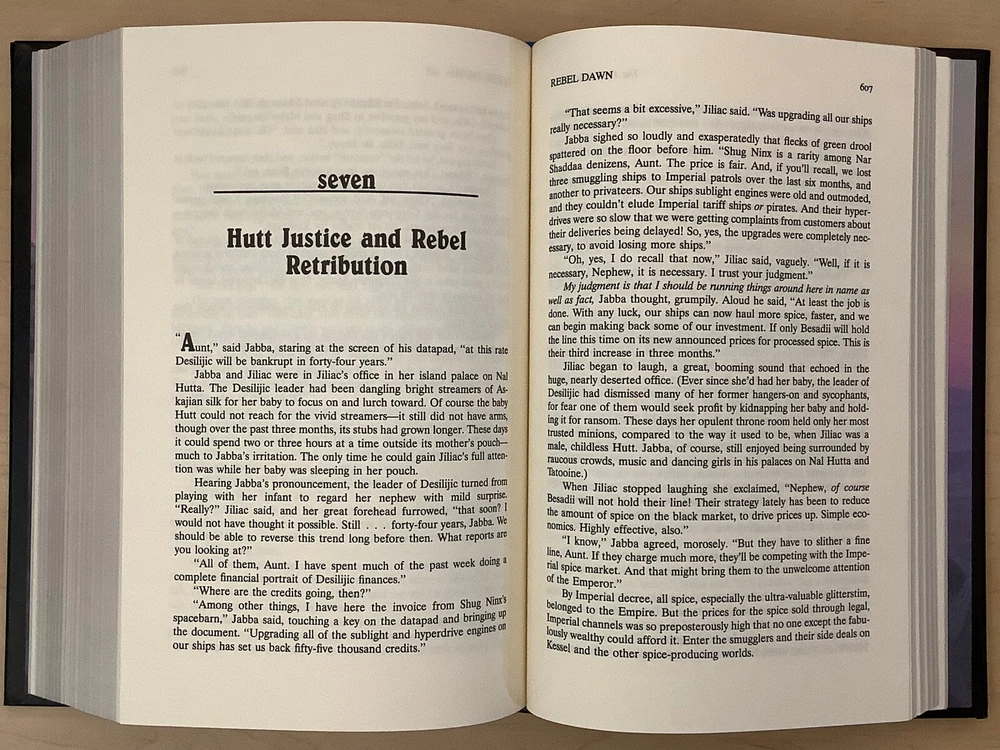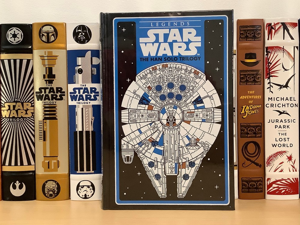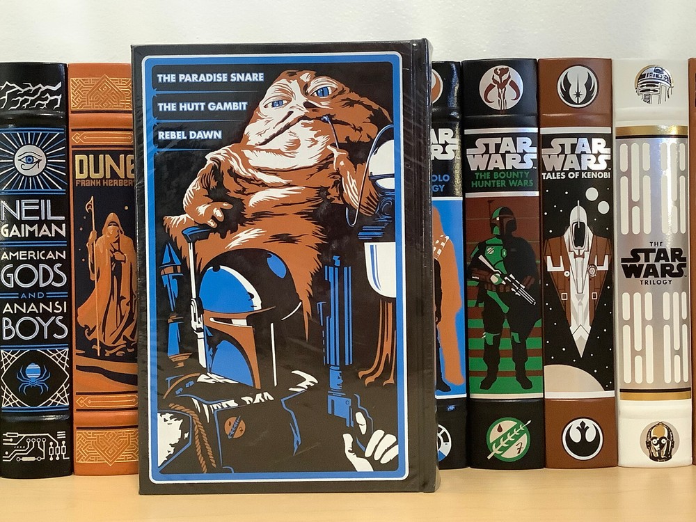 The Han Solo Trilogy by A.C. Crispin - Legends Star Wars bound in leather, with silver edged pages and a ribbon marker contents: The Paradise Snare The Hutt Gambit Rebel Dawn Item Condition: This is a sealed, unread leatherbound hardcover. The seal is beginning to open and there are some minor flaws to the silver page edging. The spine and corners are mildly bumped. Dimensions are approx: 9.25 x 6.25" x 1.75" This book will ship in a box with bubble wrap. Photos #1-8 are of the actual book that will be shipped, the rest are examples of the book from an open copy.