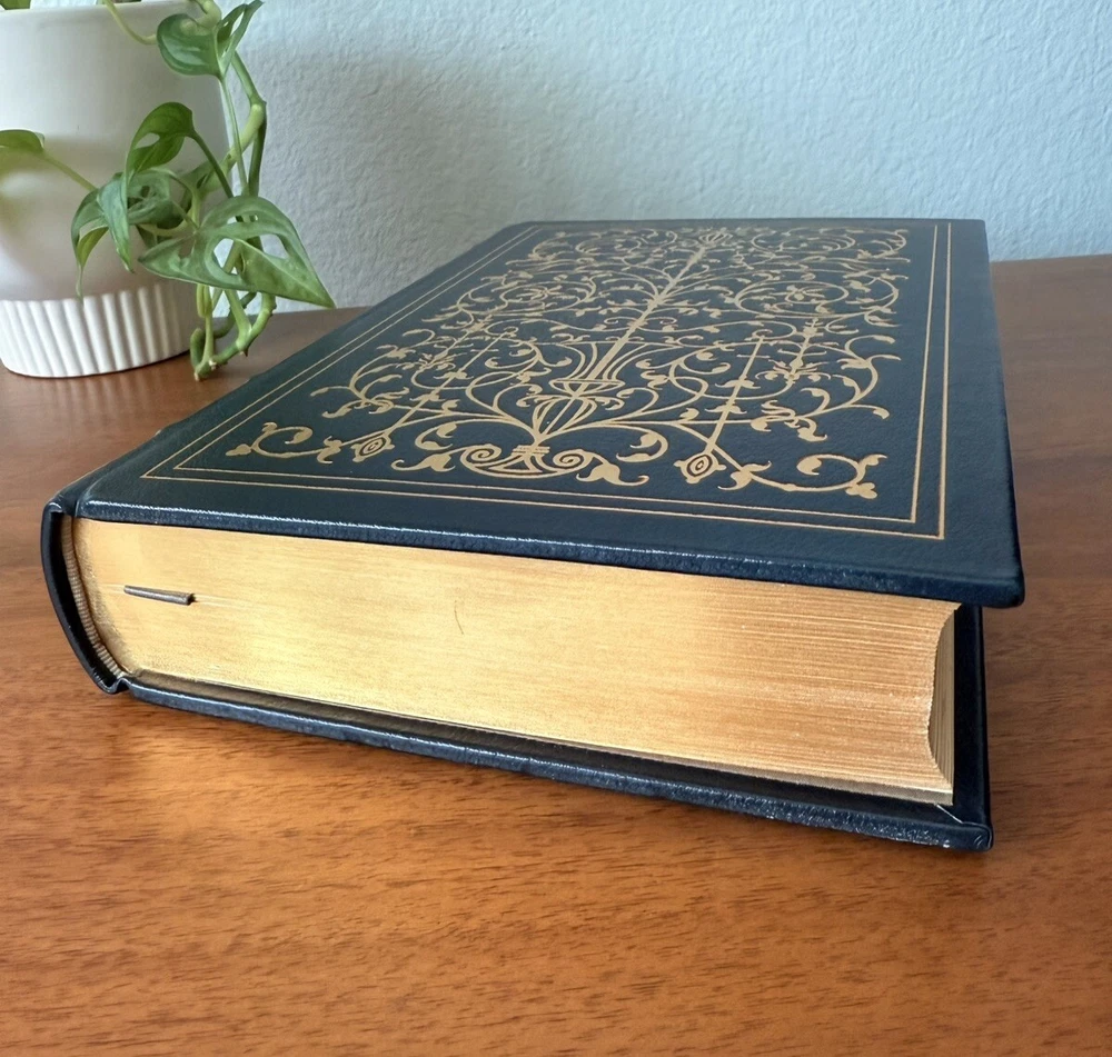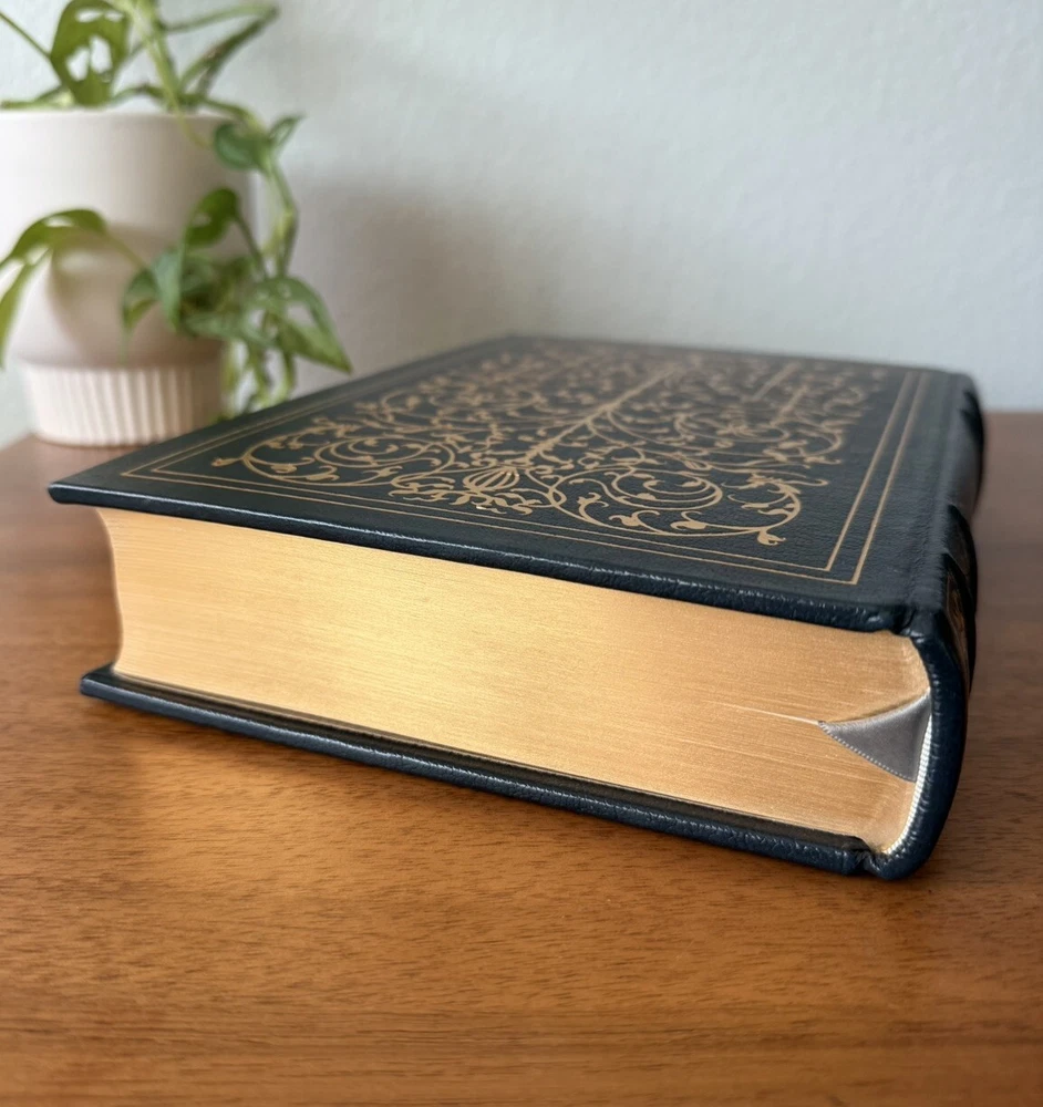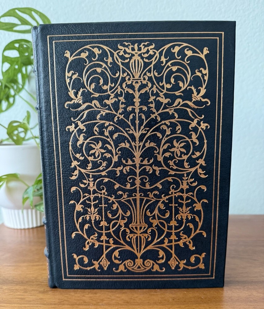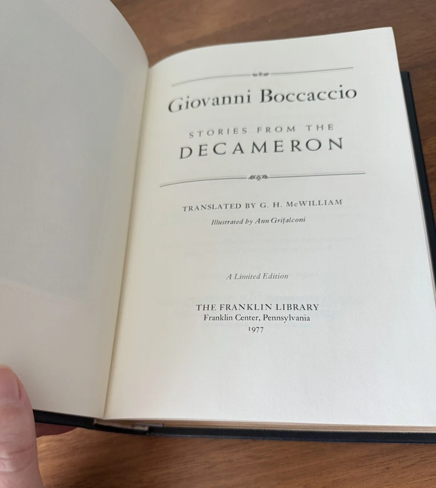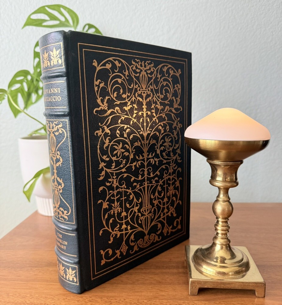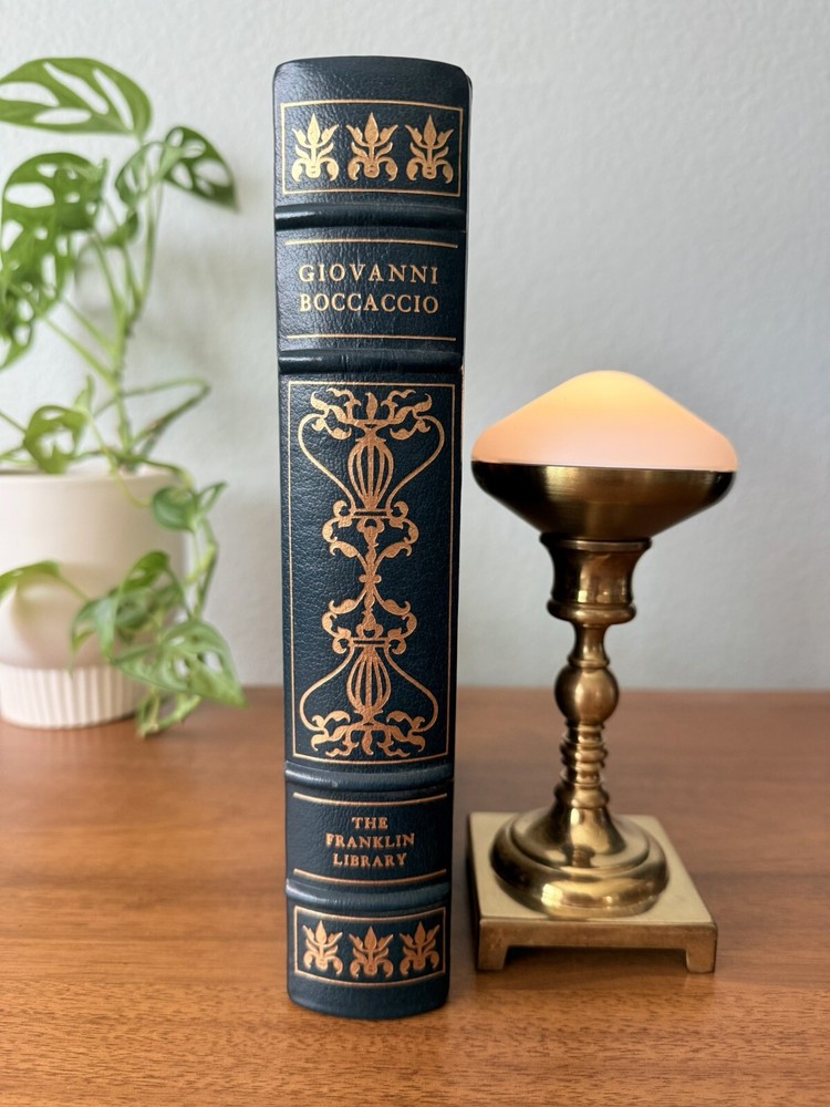 Franklin Library Limited Edition Giovanni Boccaccio “Stories from the Decameron” Part of the Collected Stories of the Worlds greatest Writers. 1977 Leather Bound, Accented in 22kt gold. Printed on archival paper with gilded edges. The endsheets are of moire fabric with a silk ribbon page marker. Smyth sewing and concealed muslin joints. This book is navy blue full leather with gold floral Filagree detail and hubbed spines. This UNREAD leather limited edition book from The Franklin Mint is in practically new condition with no markings inside or out. The only sign of age is some fading near the edges of the moire silk interior end pages. Otherwise it is pristine. It will make a fine addition to any collector's library of antique and collectible books.