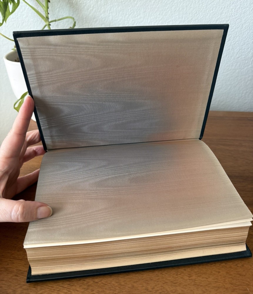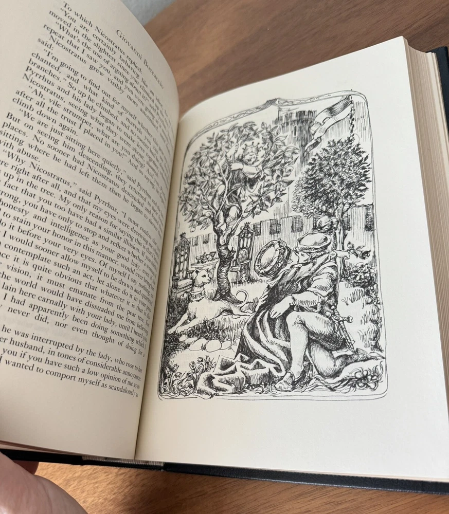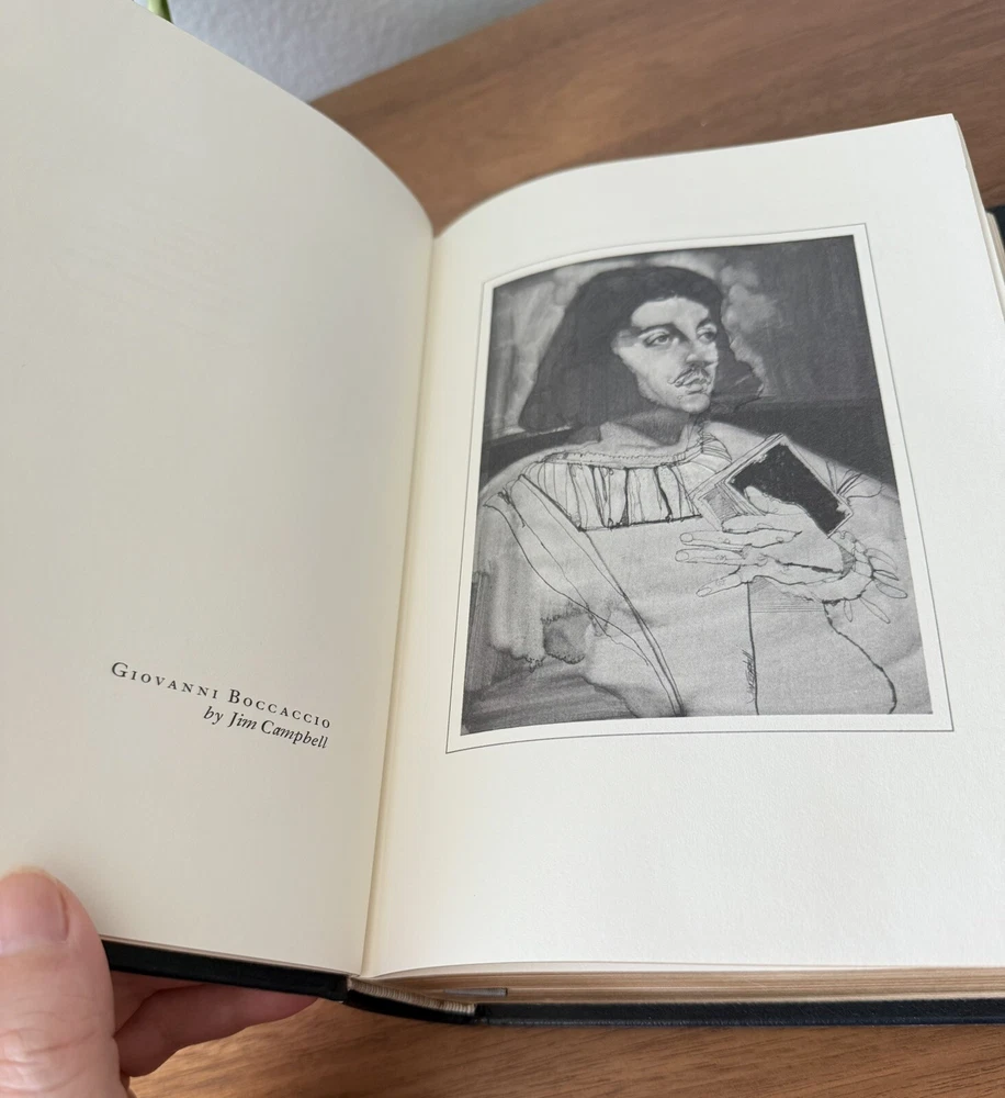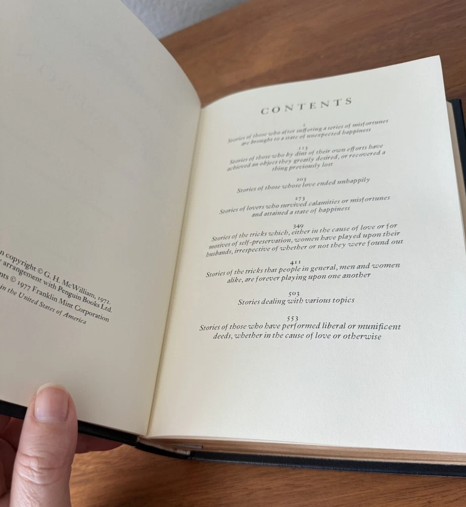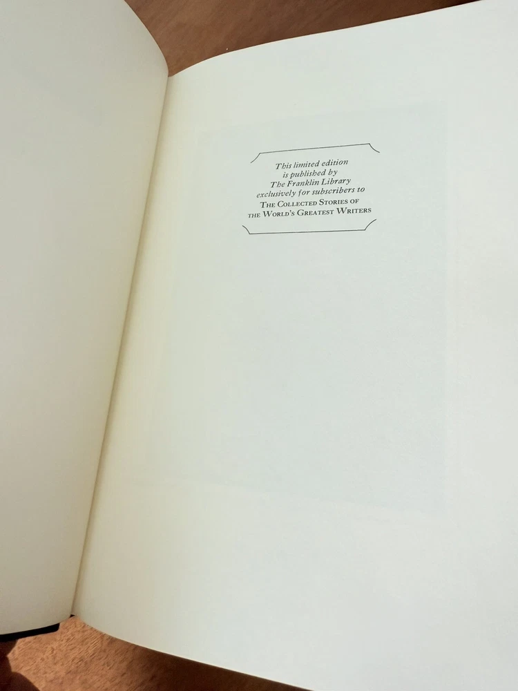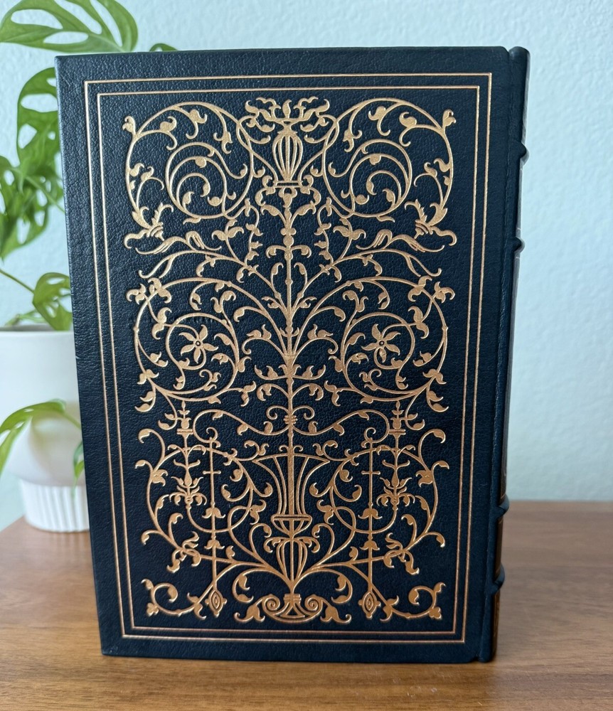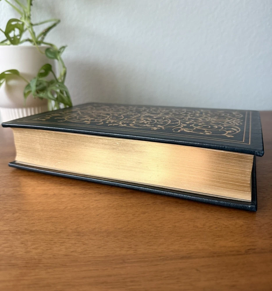 Franklin Library Limited Edition Giovanni Boccaccio “Stories from the Decameron” Part of the Collected Stories of the Worlds greatest Writers. 1977 Leather Bound, Accented in 22kt gold. Printed on archival paper with gilded edges. The endsheets are of moire fabric with a silk ribbon page marker. Smyth sewing and concealed muslin joints. This book is navy blue full leather with gold floral Filagree detail and hubbed spines. This UNREAD leather limited edition book from The Franklin Mint is in practically new condition with no markings inside or out. The only sign of age is some fading near the edges of the moire silk interior end pages. Otherwise it is pristine. It will make a fine addition to any collector's library of antique and collectible books.