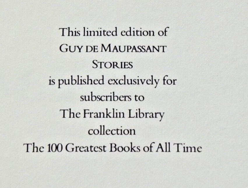 Limited Edition 1980 100 Greatest Books of All Time Collection Moire endpapers Genuine Leather Gilt edges on 3 sides Raised bands on spine Ribbon bookmark Please see pictures for more information and detail ***** This beautiful volume is in excellent condition. This volume has the appearance of never been opened (except for pictures) or read. There are no bookplates, writings. Bookends not included. Please see pictures for more information and detail. Gorgeous! Please feel free to contact me with any questions you might have. I will be glad to take additional pictures. I tried to describe the book through words and pictures the best I can but if you are not 100% satisfied with the purchase, please know you can return the book for full refund. Boxed and packaged VERY carefully --- Will ship within 1 business day of receiving payment. Thank you for looking! <meta name="viewport" content="width=device-width, initial-scale=1">
