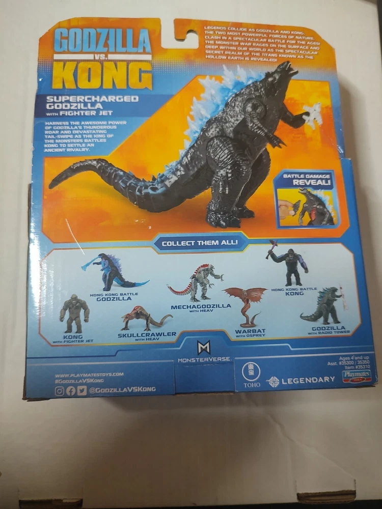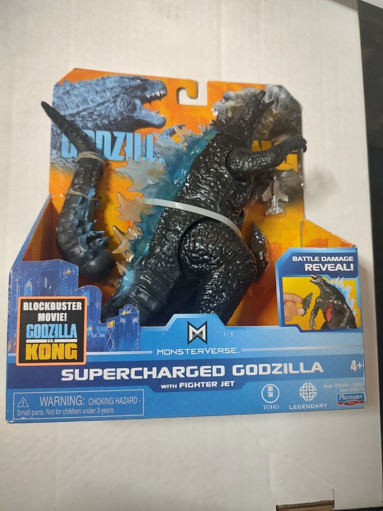 "Supercharged Godzilla with Fighter Jet" - 'Monsterverse: Godzilla vs. Kong' Playmates Action Figure, produced in 2021. Figure stands approximately 7 inches tall (approximately 12 inches 'nose to tail'), and is mint in original, factory box. Please see photos for exact condition of item.