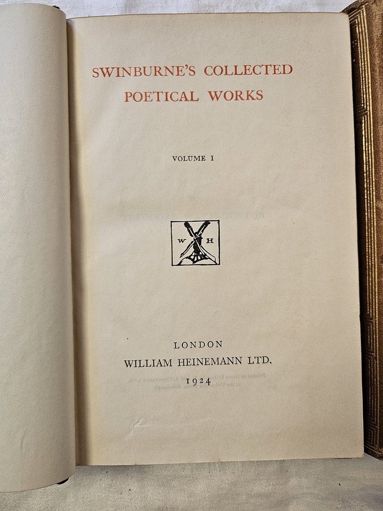 HGG Books presents ... Swinburne's Collected Poetical Works 2 volume fine binding set Author: Swinburne, Algernon Charles Publisher: William Heinemann Release Date: 1924 Seller Category: Poetry Qty Available: 1 Condition: Collectible: Very Good Sku: swinburnepoetical Notes: Clean pages, tight binding, leather boards show light edge wear, gold decoration bright Don't forget to check out other great deals in our eBay Store!!