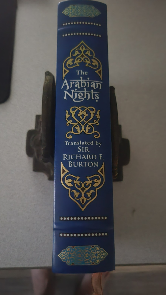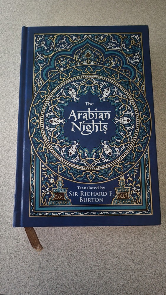 THE ARABIAN NIGHTS translated by Sir Richard Burton Bonded Leather, Gold Pages TheArabian Nights is your magic carpet ride to exotic lands full of wonders andmarvels! Initially collected nearly a thousand years ago, these folktales are presented as storiesthat crafty Scheherazade told her husband, King Shahryar, over athousand-and-one consecutive nights, to pique his interest for the nextevening's entertainment and thereby save her life. Amongthem are some of the best-known legends of eastern storytelling, including the"Sinbad the Sailor," "Aladdin and His Magic Lamp," and"Ali Baba and the Forty Thieves." This collection features more than twenty stories, inthe classic translation of Sir Richard Burton, published between 1884 and 1886,and full-color illustrations by Renata Fucikova and Jindra Capek. Smoke-free Home Combined shipping is offered for all same-day purchases, so check out our other goods! Questions are always welcome - I'm happy to help you choose to shop with me!
