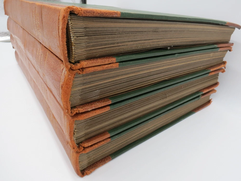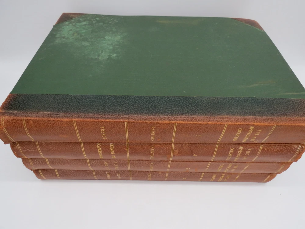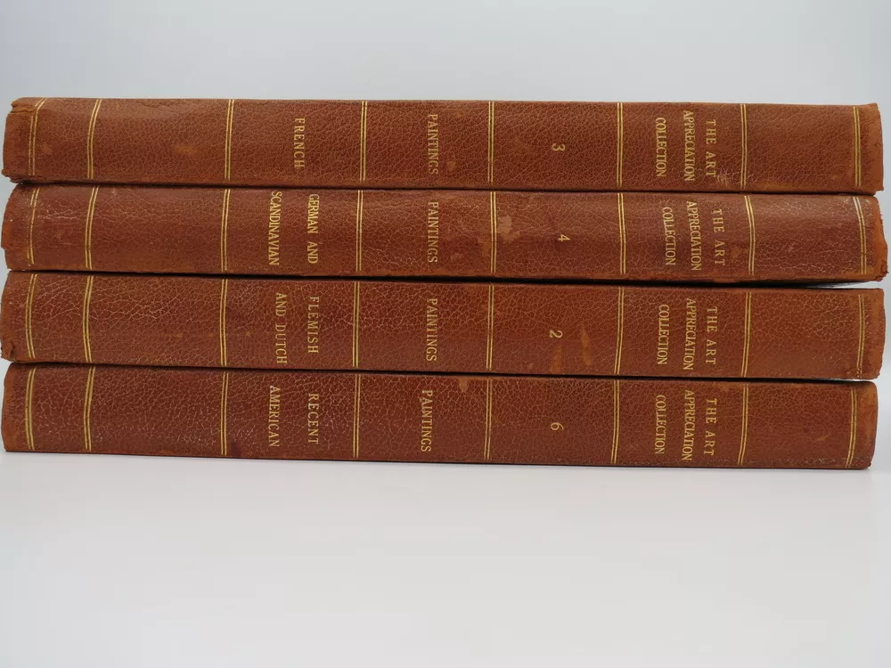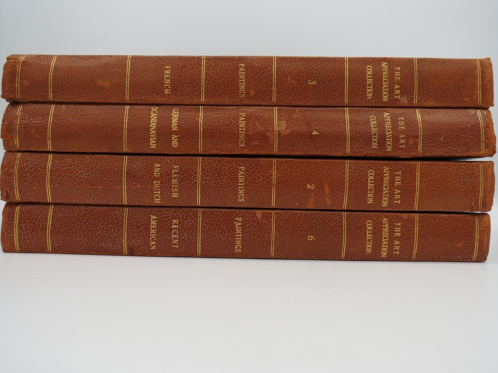 THE ART APPRECIATION COLLECTION (4 VOLUME SET) (LEATHER BOUND) Cover: Hardcover Date: 1910 Book: G+ 4 of 6 volume set (lacking volumes 1 & 5). Elephant folio 13" x 18", each volume 2" thick. Three quarter tan leather bound covers with green boards are frayed at corners and spine caps but leather has been treated with preservation treatment to reduce further deterioration of the leather. Two of the covers have damp staining to the green cloth. Boards and spines are straight. Bindings are tight. Heavy stock pages with dry mounted color plates are clean and in very good condition. Sage Rare & Collectible Books specializes in first editions, signed editions, fine bindings, antiquarian, vintage, out-of-print, and rare books. We provide a complete and detailed condition description of each book so you know precisely what you are ordering.