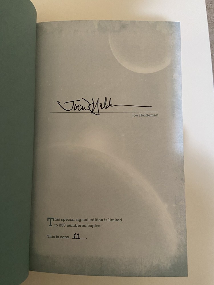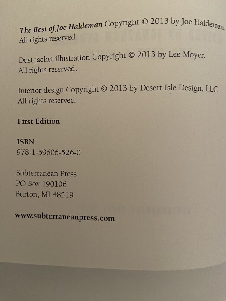 "The Best of Joe Haldeman," published by Subterranean Press in 2013, is the signed, limited first edition (copy # 11/250). It is bound in leather. It is new and unread.