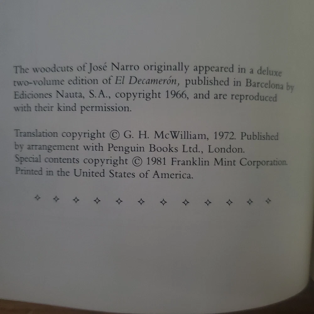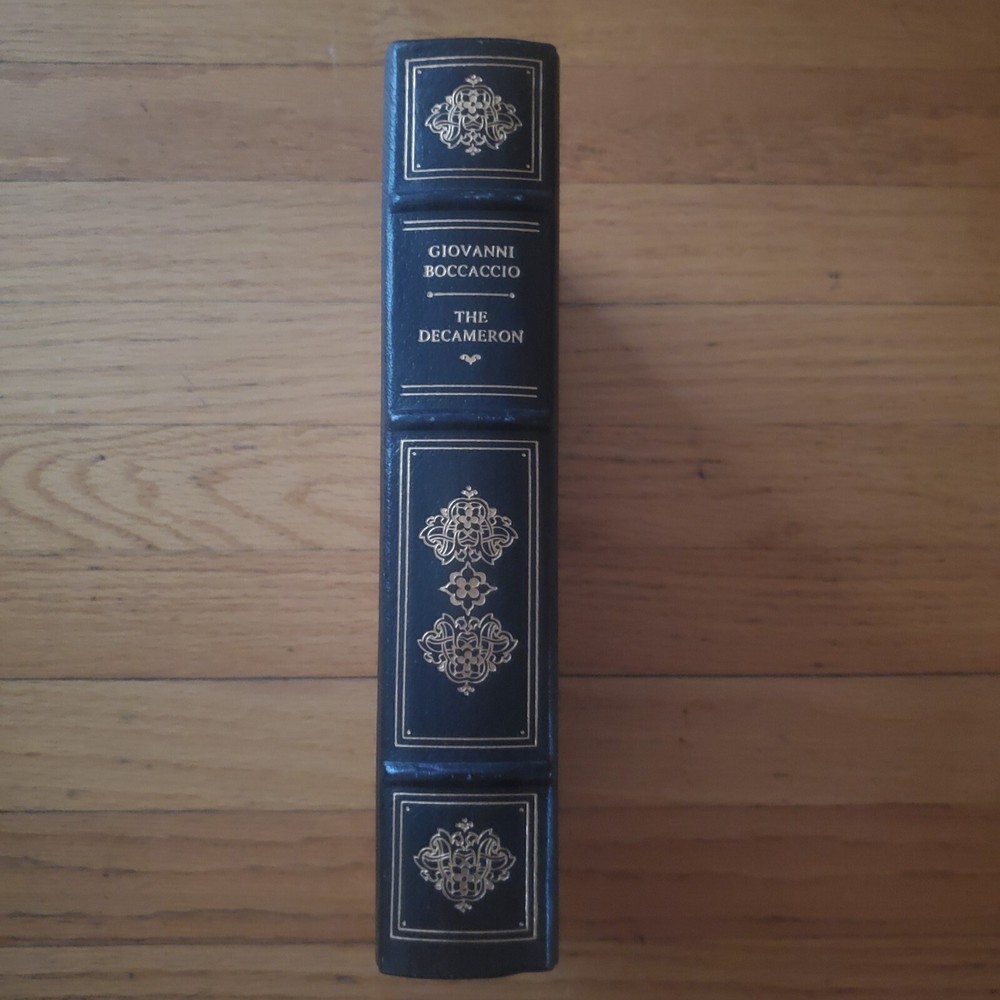 Up for sale is a hardcover leather bound copy with gold gilded edges of "The Decameron", written by Giovannni Boccaccio and published by the Franklin Mint Library in 1981. As seen in the photos, the book is in very good overall condition. A great find for any literary buff. Shipping is $6.95 via US Postal Service Media Mail within the USA. Please take a look at my other listings of literary masterpieces published by the Franklin Library to add to your collection. Buy with confidence. 20+ year eBay member with 100% positive feedback. Please let me know if you have any questions.
