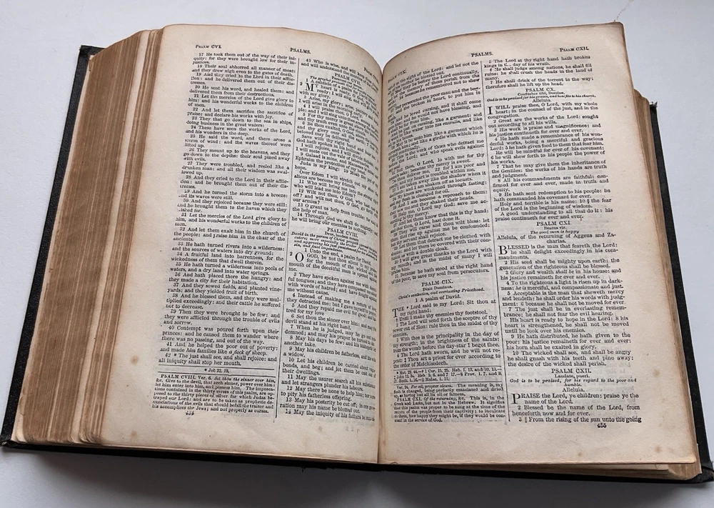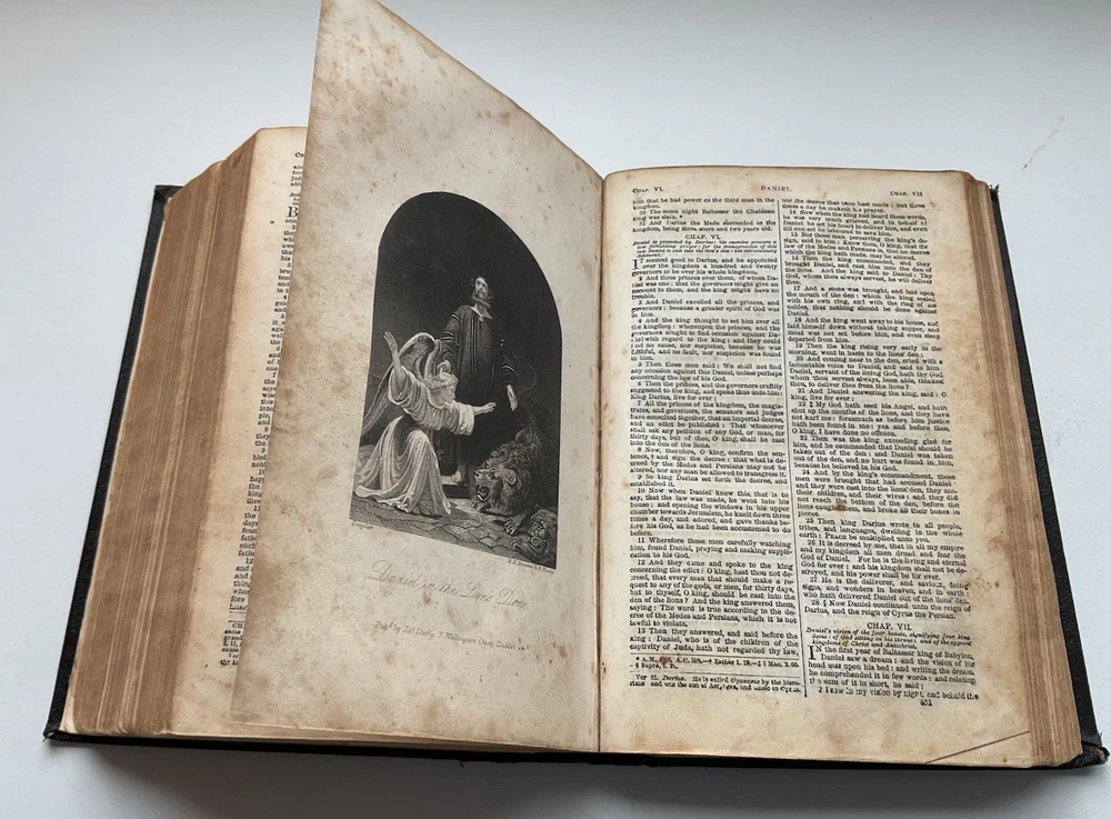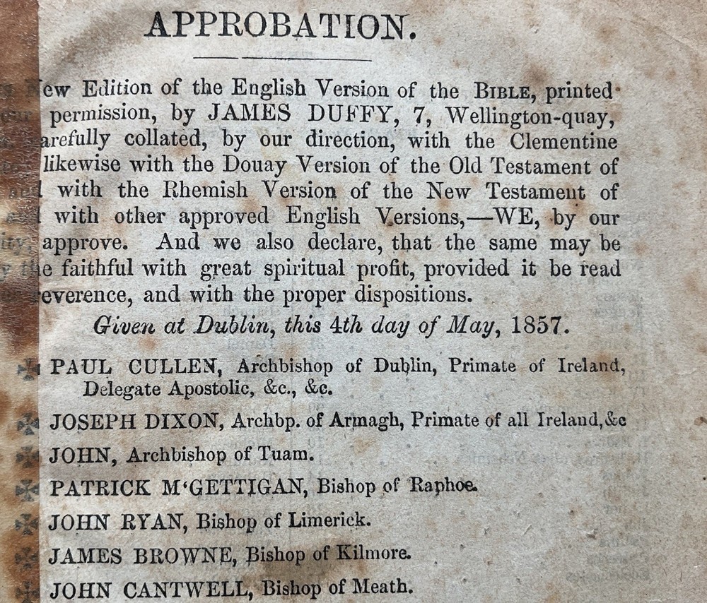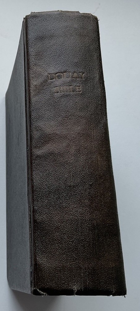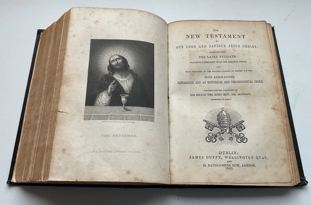 RARE family bible in acceptable condition; please check BookFinder.com website to confirm world prices and world availability of this book . Published date unsure - shown as 1857, but the New Testament section is dated at 1863. Black leather board cover showing faded gilt lettering on the spine; bookbinder’s stamp on back endpaper; minor bumping to spine and cover’s corners; personalised inscription to front endpaper; foxing and water staining to text block pages; foxing on page edges; illustration missing between pages 442 & 443 in Old Testament; slight tear at bottom of pages 139/140 in New Testament; small ink stain to pages 205/206; pages 207-212 missing from Historical Index . Will protect with bubble wrap and send as Australia Post Standard Small Satchel with tracking. This is a Catholic Bible, translated from the Latin Vulgate to English by the English College Douai and St. Jerome. This bible contains the 14 books which Martin Luther removed from the bible. This is why protestants use the King James version, which is the protestant version with the 14 books removed. To add on, King James was a protestant, so his version of the bible is untrustworthy to Catholics. The Douay Rheims bible uses old English, which is the closest English to the Traditional Latin Vulgate. Often, newer versions of the bible use modern English, and they slowly stray away from the truth because the words have to be changed, and the bible loses its meaning because of this language confusion. This bible is preferred by traditional Catholics, because it is considered the best English version of the bible at the Council of Trent and other councils of the Catholic Church. Lastly, this version has been used by the Catholic Church for hundreds of years before the confusion caused by the Second Vatican Council.