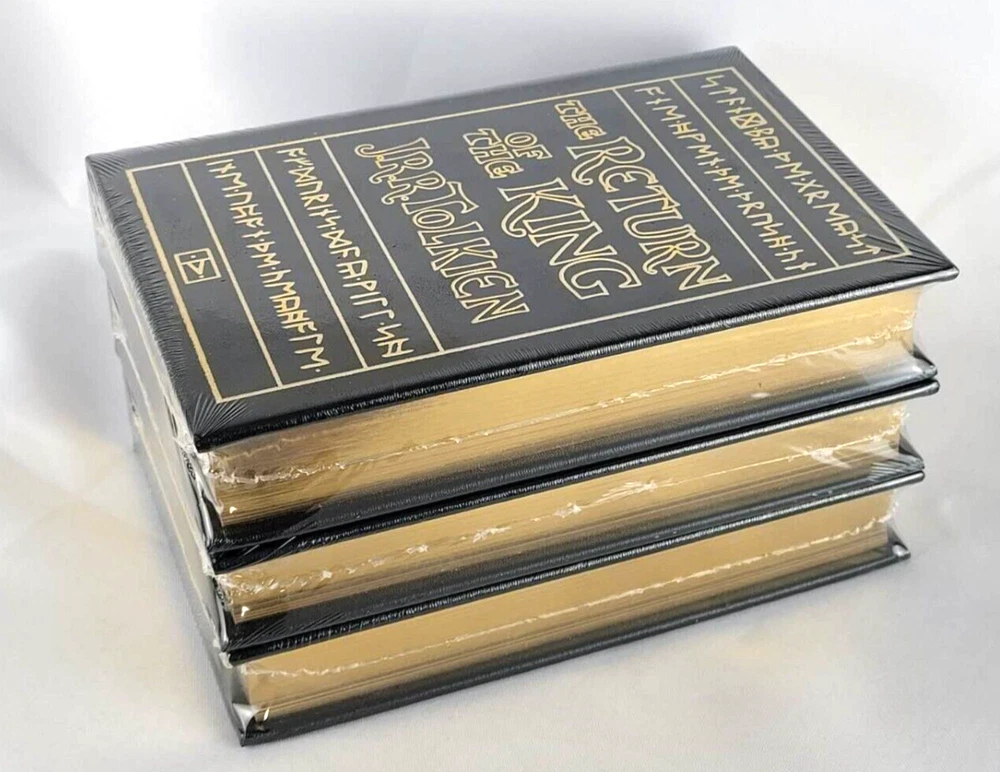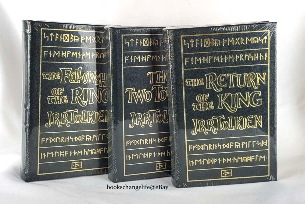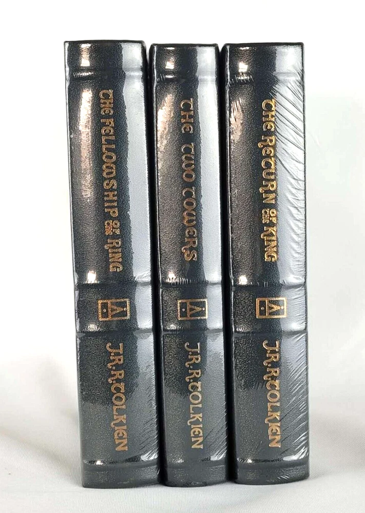 Brand New sealed Easton Press leather-bound Tolkien classics. Three volumes included: 1) The Fellowship of the Ring 2) The Two Towers 3) The Return of the King Total Weight : 6.1 pounds Dimensions : 9 x 6 x 5 inches - Bound in genuine leather. - Accented with 22kt gold. - Beautiful gilded page-ends. - Sturdy and elegant fabric end-sheets. - Pages are Smyth-sewn into the binding. - Satin ribbon page markers. - Acid-neutral paper. - Printed and bound in the USA using imported materials. Printed on archival quality, acid-neutral paper specially milled for this edition that conforms to all guidelines established for permanence and durability by the Council of Library Resources and the American National Standards Institute.
