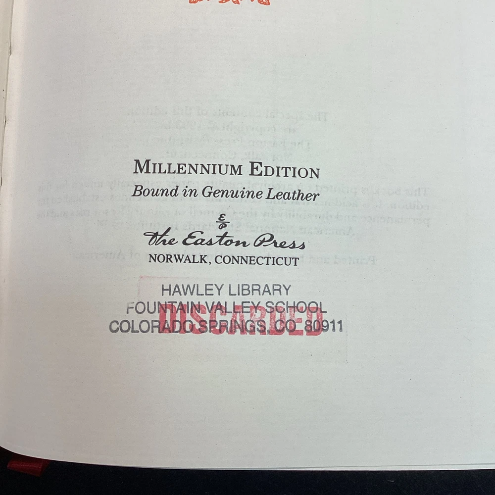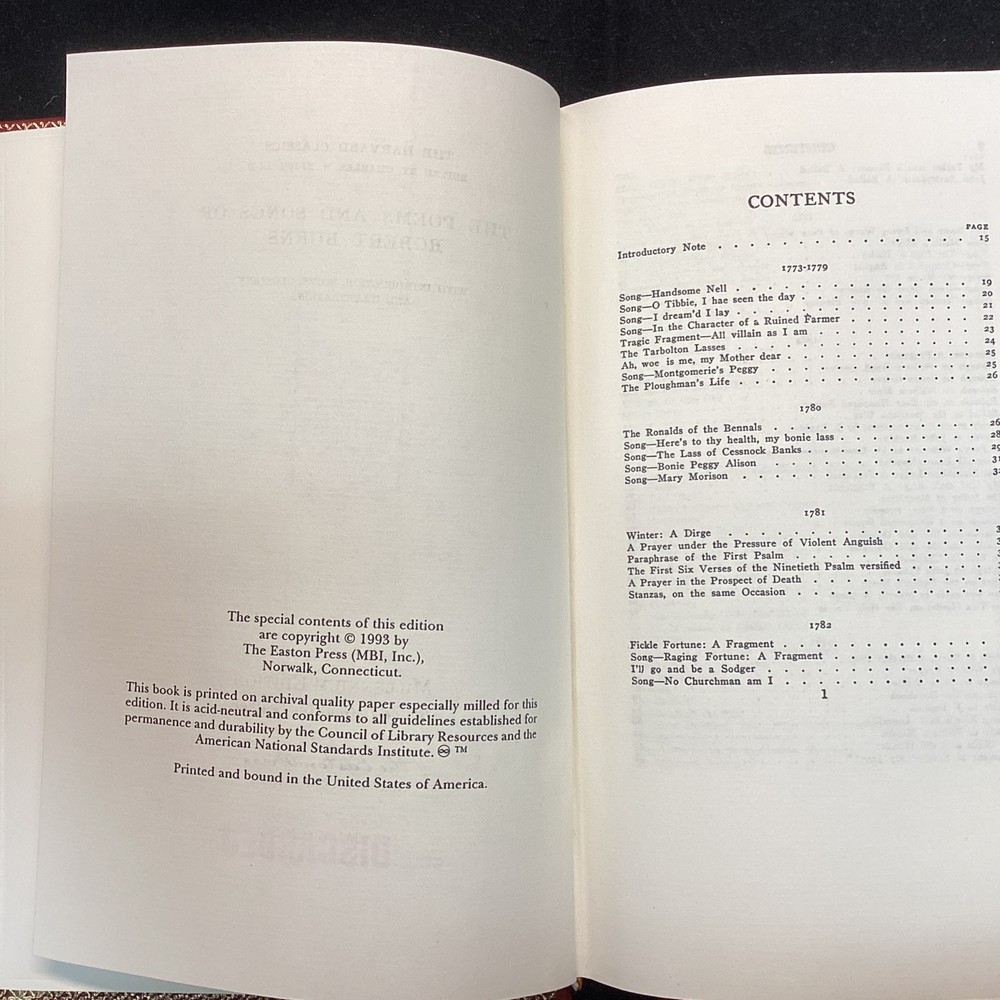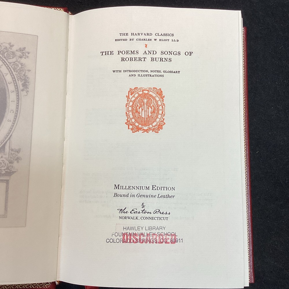 TITLE, PUBLICATION, CONDITION: The Harvard Classics - The Poems and Songs of Robert Burns Millennium Edition The Easton Press, 1993 Ex-library with one stamp on title page, no other evidence. Red leather cover with gilt text block. Pages unmarked, binding very secure. Appears unread. See photos. WAIT...There's More... Be sure to mark PikesPeakLibraryFriends as a favorite seller!! You'll be notified of more great items like this as soon as they become available. Please carefully examine our photos as they provide an integral part of our condition description. We are happy to provide more pictures upon request. Your purchase helps our nonprofit 501(c)3 organization support the programs, events and staff of our award-winning local public library district. Thank you! We ship on the same or next business day upon receipt of payment. ****Friends nameplate not included*** Shelf H