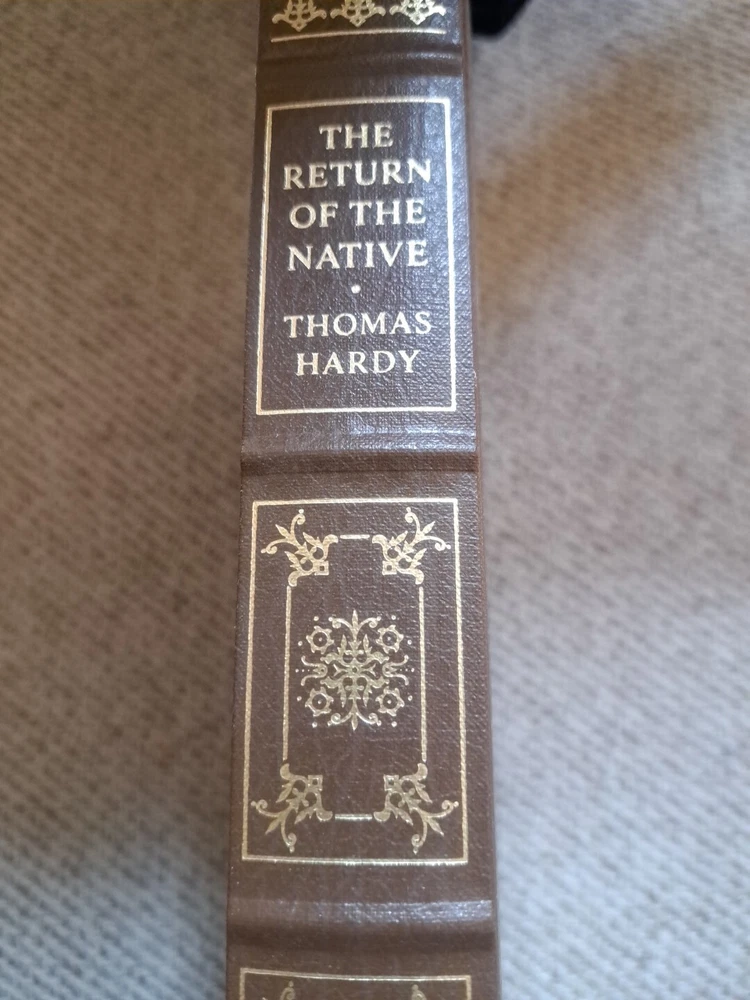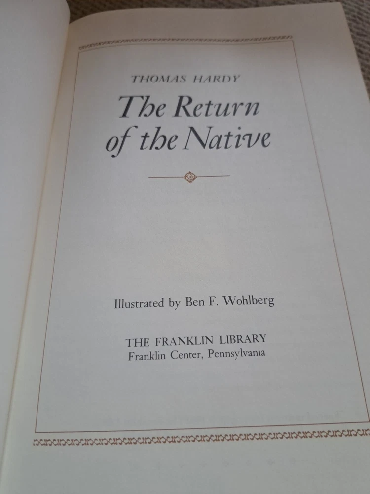 This is a classic limited edition collector's book titled "The Return of the Native" by Thomas Hardy. The book is published by Franklin Library, with an illustrated cover in gilt edges. It is a hardcover book with a leather binding. The pages of the book are crisp and clean, giving the book a new-like feel. The book was printed in English in 1980, and it is a one-of-a-kind special edition that would make a great addition to any collection.