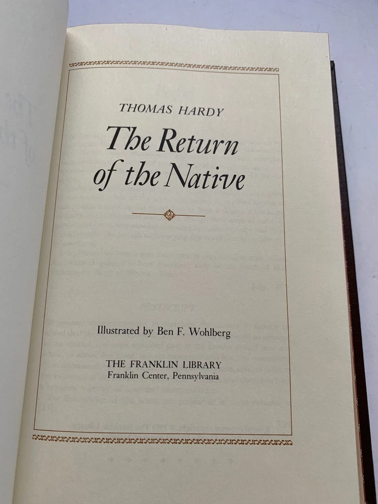 This exquisite leather-bound collector's edition of Thomas Hardy's classic, "The Return of the Native," published by Franklin Library in 1980, is a true gem for any literature enthusiast. The gilt edges and beautiful illustrations by Wohlberg make it a stunning addition to any book collection. The book is in its original and authentic form, with no modifications made. The publisher, Franklin Library, is renowned for its high-quality and limited-edition publications. The book is written in English and belongs to the categories of Antiquarian & Collectible and Books & Magazines. The author, Thomas Hardy, is a famous English novelist and poet. This book is a must-read for anyone interested in classics and literature. Please see all photos for any condition issues. Bought at a garage sale and books appeared to have been kept out in the garage for some time.