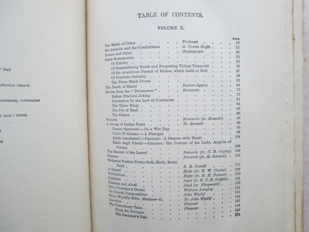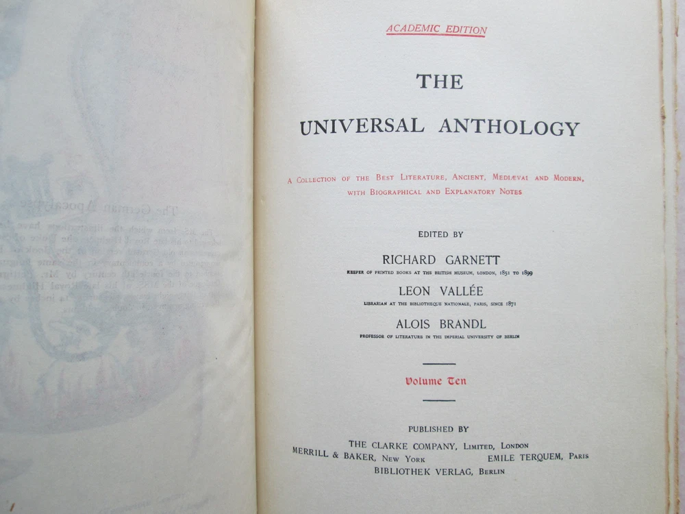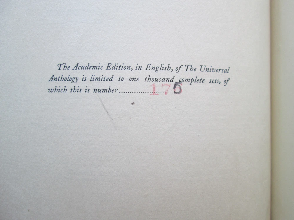 The Universal Anthology Volume Ten Academic Edition Edited by Garnett, Vallee, and Brandl 1899 Hardcover - Quarter Leather Limited Edition #175 of 1000 The Clarke Company, Ltd. 404 pages. Dimensions: 7.25 x 10 inches This book has good binding, sound hinges, all pages are intact, and there are no markings or writing anywhere in the book. The exterior has some wear. Please enlarge all 12 photos to judge the condition. Photos show actual item you will receive. Feel free to email me through eBay with any questions. Please visit my eBay store, Double Eagle Books. I have a wide selection of hard-to-find books. You can Google DoubleEagleBooks.com to get directly to my eBay store.