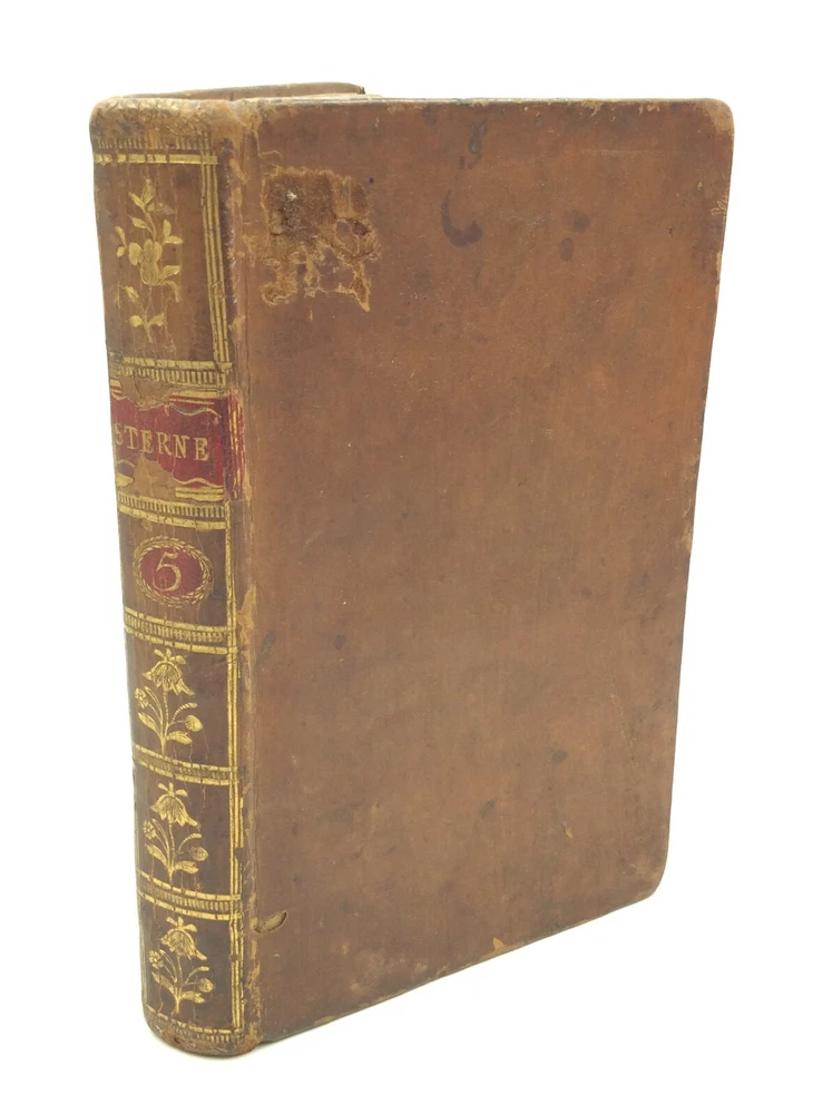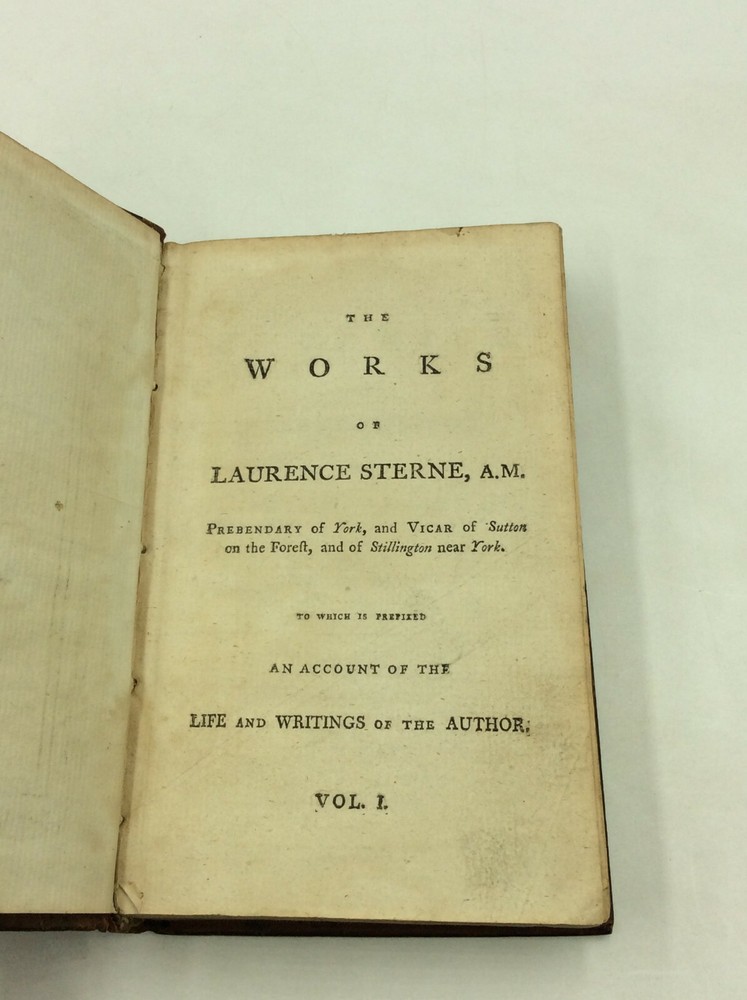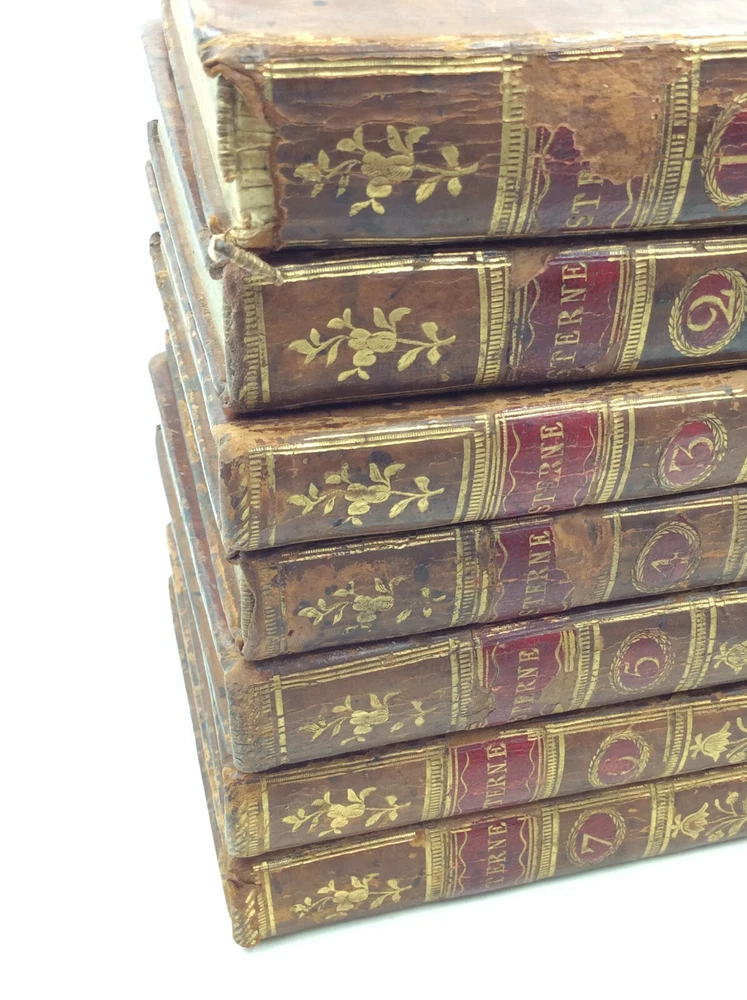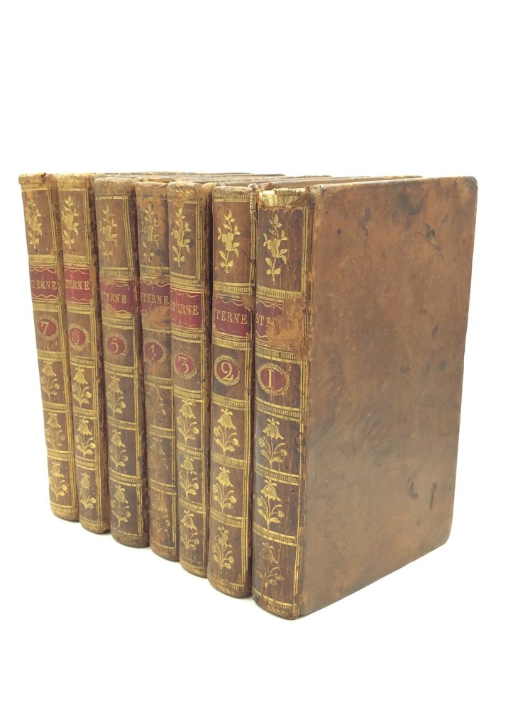 Laurence Sterne THE WORKS OF LAURENCE STERNE, A.M. Prebendary of York, and Vicar of Sutton on the Forest, and of Stillington Near York. To Which Is Prefexed an Account of the Life and Writings of the Author. (7-volume set) London: Printed for the Proprietors, 1783. Leather. 7 vols. A complete set of seven small hardcover books attractively bound in 18th-century leather. Good condition overall. Spines rubbed and a bit crinkly-looking. On volume I, the head of the spine is torn and thereis a small ink stain on the side edge. Spine labels chipped on volumes I, II, IV, and V. Owner signatures inside. Occasional old pen scribbles in volume I. Mild insect damage to side edge of last 30 or so pages in volume II. Frontispiece torn out of volumes IV-VII. Front free endpaper torn in volume VI. Pages a bit browned with age and have occasional mild stains and blemishes. Text is still easily legible, and binding is secure. Item #175862 An anthology of writings by Anglican cleric and novelist Laurence Sterne (1713-1768). Each volume measures approx. 6.7" x 4.2"