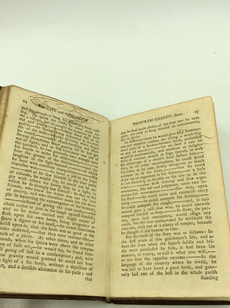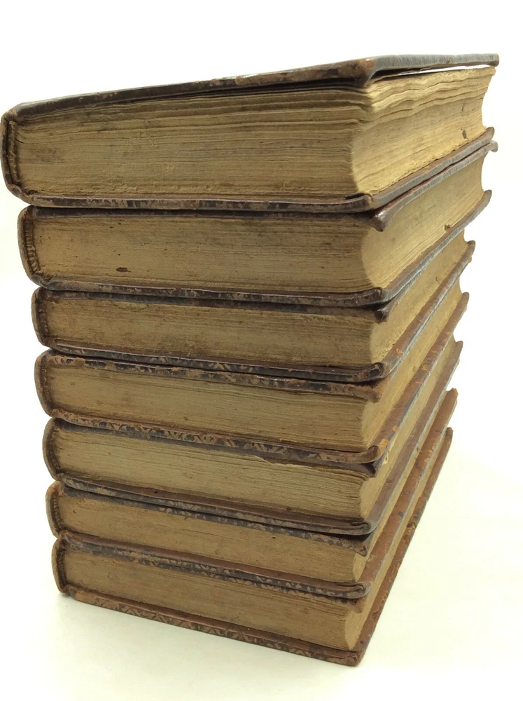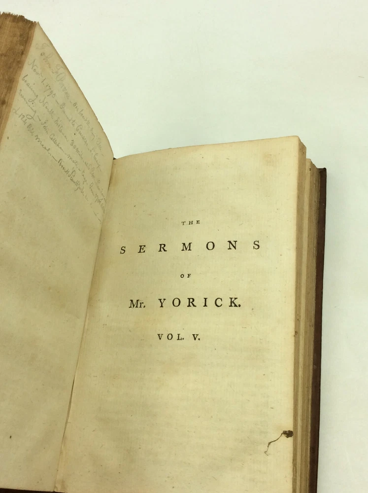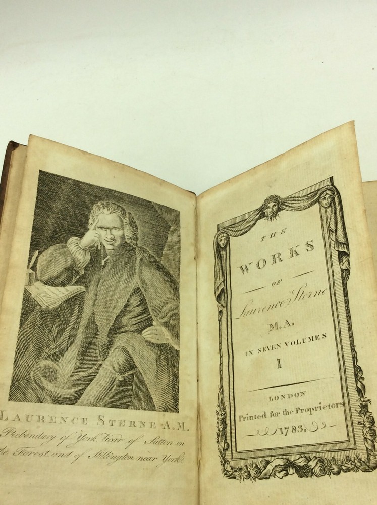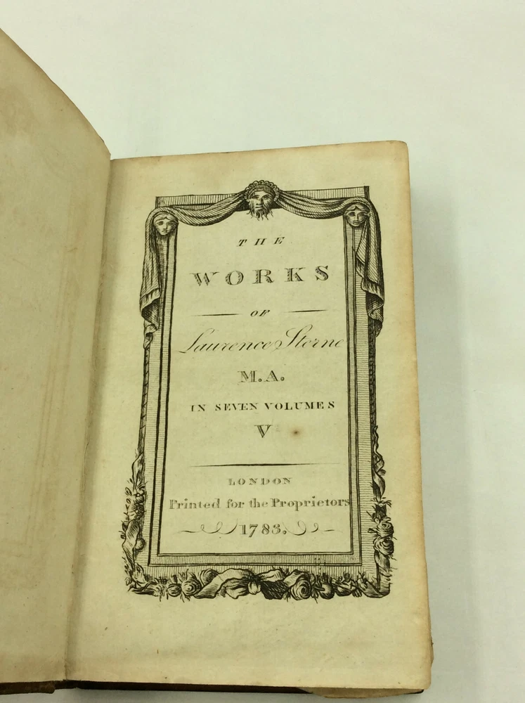 Laurence Sterne THE WORKS OF LAURENCE STERNE, A.M. Prebendary of York, and Vicar of Sutton on the Forest, and of Stillington Near York. To Which Is Prefexed an Account of the Life and Writings of the Author. (7-volume set) London: Printed for the Proprietors, 1783. Leather. 7 vols. A complete set of seven small hardcover books attractively bound in 18th-century leather. Good condition overall. Spines rubbed and a bit crinkly-looking. On volume I, the head of the spine is torn and thereis a small ink stain on the side edge. Spine labels chipped on volumes I, II, IV, and V. Owner signatures inside. Occasional old pen scribbles in volume I. Mild insect damage to side edge of last 30 or so pages in volume II. Frontispiece torn out of volumes IV-VII. Front free endpaper torn in volume VI. Pages a bit browned with age and have occasional mild stains and blemishes. Text is still easily legible, and binding is secure. Item #175862 An anthology of writings by Anglican cleric and novelist Laurence Sterne (1713-1768). Each volume measures approx. 6.7" x 4.2"