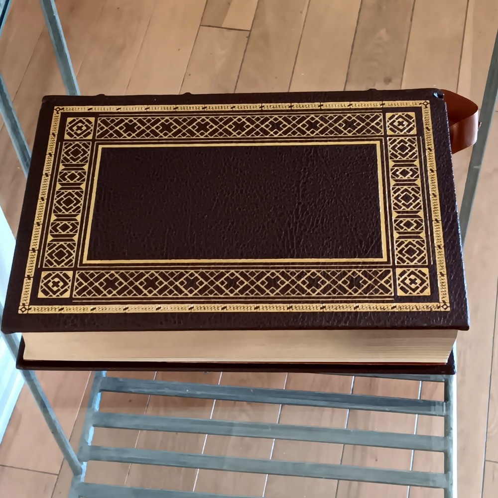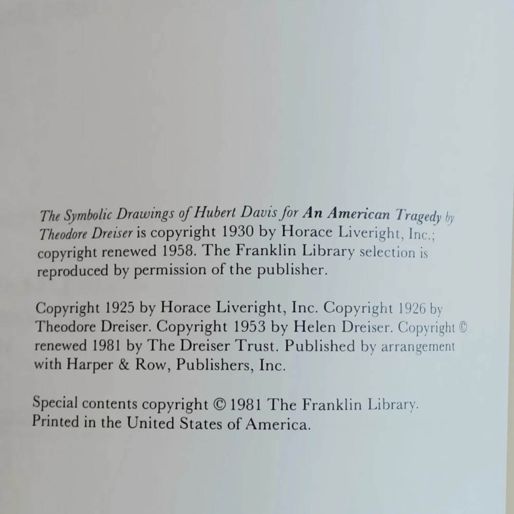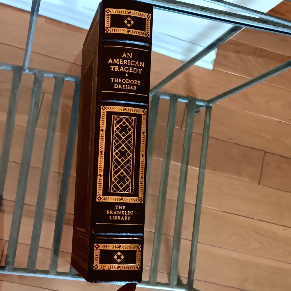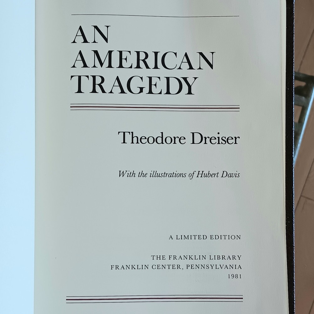A limited edition leather-bound book published by Franklin Library in 1981, titled "An American Tragedy" by Theodore Dreiser. The book is an original copy and was printed in 1979. The story is set in North America and revolves around the themes of adultery and murder in Indiana. The book is written in English and is illustrated by Hubert Davis and categorized under Antiquarian & Collectible, Books & Magazines, and Literature & Fiction - excellent condition