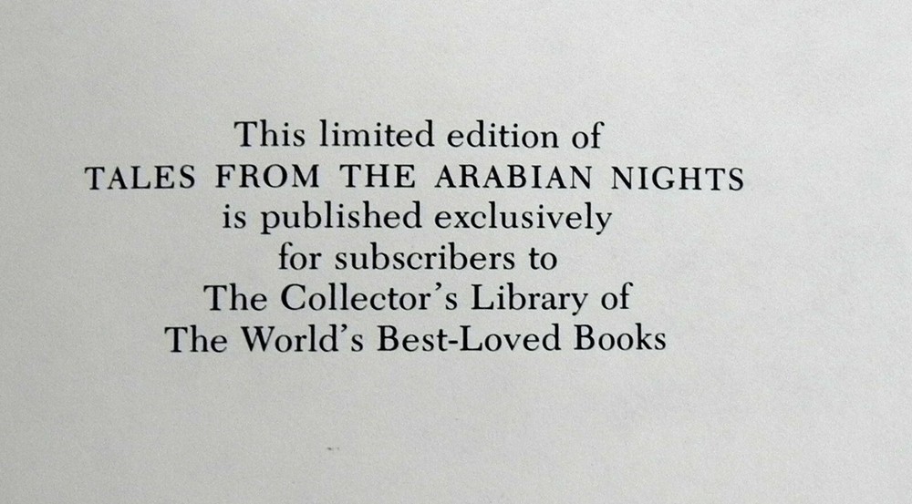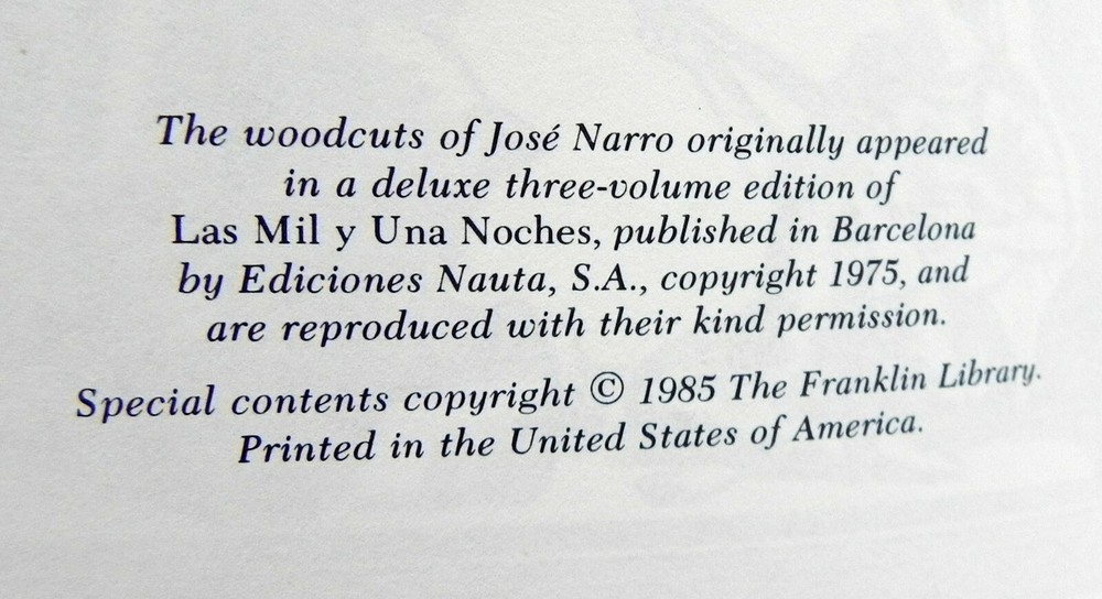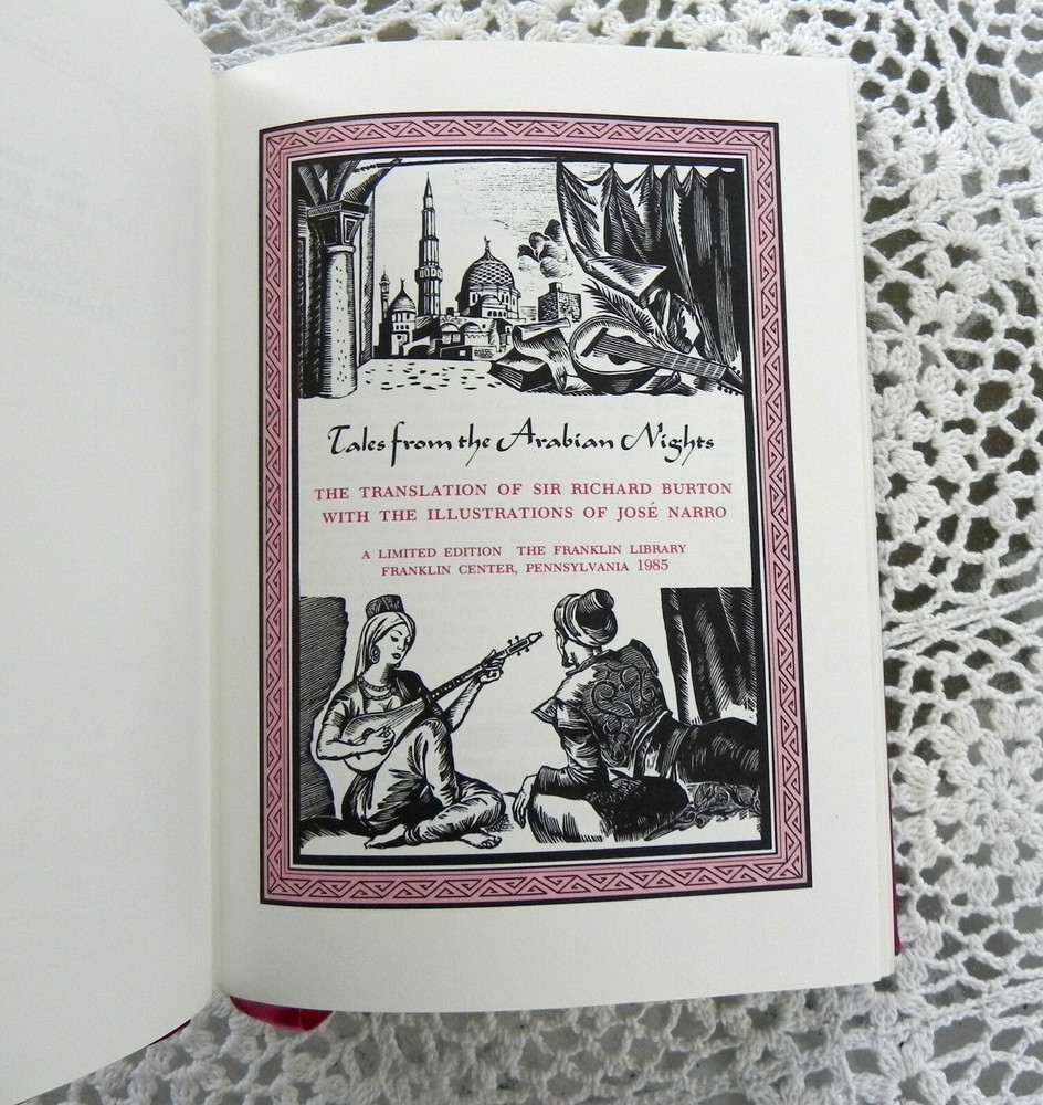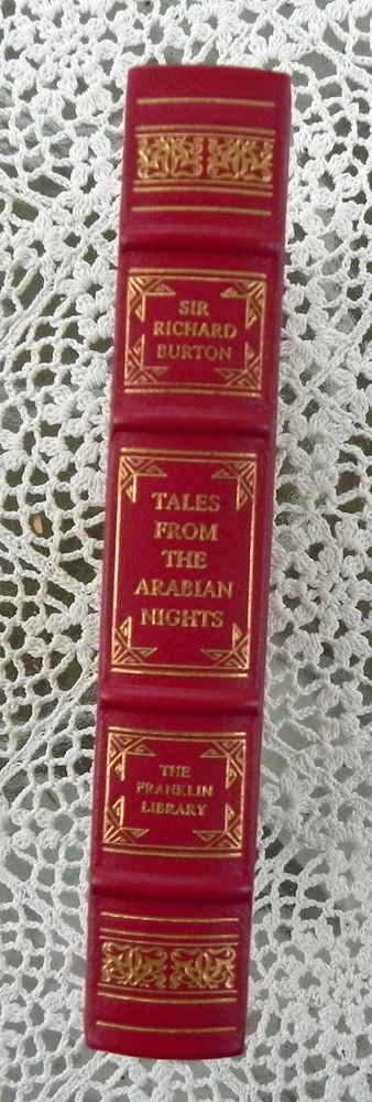 Tales From the Arabian Nights by Richard Burton Franklin Library Collecter's Stories of the World's Best Loved Books Limited Edition 1985 Moire endpapers Genuine Leather Gilt edges on 3 sides Raised bands on spine Ribbon bookmark Please see pictures for more information and detail ***** This beautiful volume is in excellent condition. Couple of very minor scratches. This volume has the appearance of never been opened (except for pictures) or read. There are no bookplates, writings. Please see pictures for more information and detail. Please feel free to contact me with any questions you might have. I will be glad to take additional pictures. I tried to describe the book through words and pictures the best I can but if you are not 100% satisfied with the purchase, please know you can return the book for full refund. Boxed and packaged VERY carefully --- Will ship within 1 business day of receiving payment. Thank you for looking! <meta name="viewport" content="width=device-width, initial-scale=1">