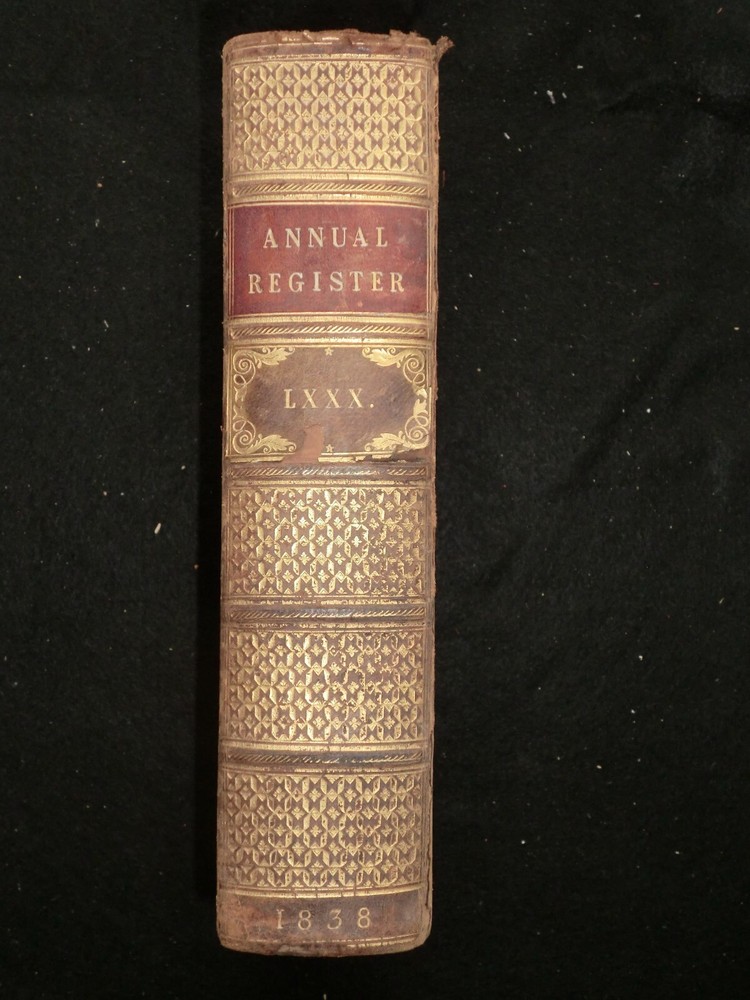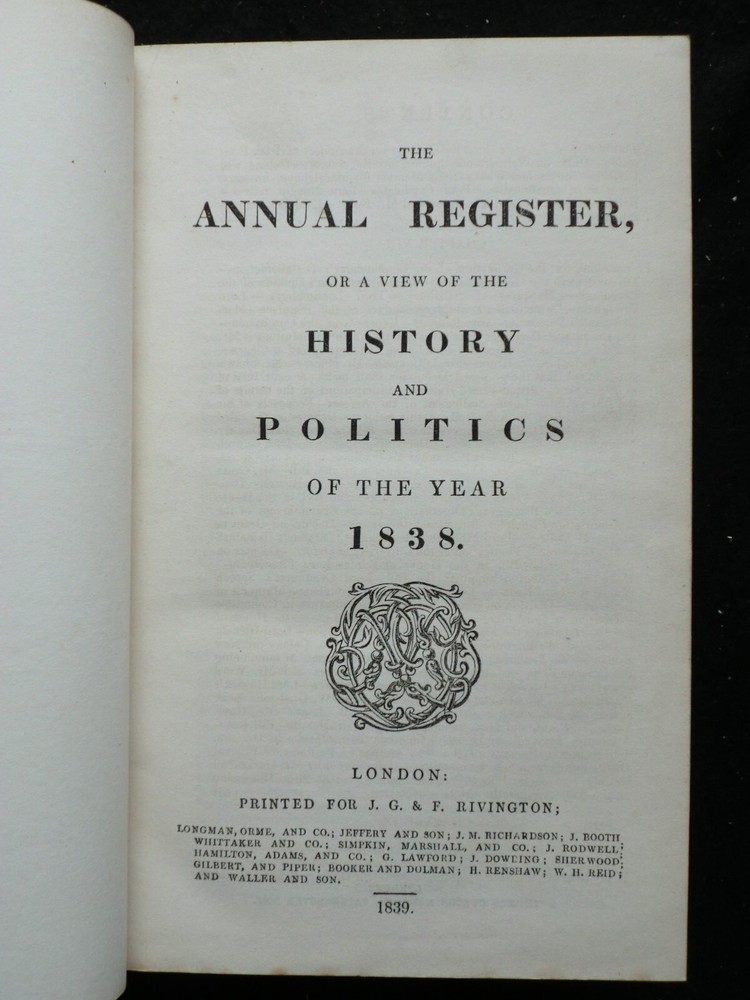 The Annual Register, or a View of the History and Politics of the Year 1838 Published in London in 1839, with contents covering the events from the previous year. Bound in full polished calf, ruled in gilt to the edges, with a gilt banded spine Volume plate chipped and worn, though title plate is generally in good condition. Leather with general wear, spine ends worn, some scuffing to the gilt. Spine edges and board corners rubbed. Block edges red flecked, light toning to the pages, the odd minor spot or handling mark, but generally the block is in good order, with text readable throughout. Good overall. Weighty volume, in excess of 1kg exc of the packaging. One of a number of Annual Registers I am selling. Please await a Combined invoice if taking more than one. The Annual Register (originally subtitled "A View of the History, Politicks and Literature of the Year ...") is a long-established reference work, written and published each year, which records and analyses the year's major events, developments and trends throughout the world. It was first written in 1758 under the editorship of Edmund Burke, and has been produced continuously since that date. --------------------------------------------- One of a number of similar items I am selling. Check out the other items in my eBay shop. Postage is always combined wherever possible. OVERSEAS BIDDERS - PLEASE CONTACT ME PRIOR TO PURCHASE TO CONFIRM SHIPPING COSTS AS THEY MAY BE HIGHER THAN THOSE QUOTED -------------------------------------------- DSR's: If you have any issue with your purchase, please contact me BEFORE leaving feedback. I pride myself on good customer service, and always try to get items sent out within 24-48 hours (1-2 working days). Please base your DSR for Dispatch time on this, and not the transit time, which is out of my control. Postage and packaging costs are kept to a minimum, with only a nominal fee being added for packaging materials where necessary. Items are described as accurately as possible, but if you think I have overlooked anything please drop me a line. This excludes foxing, previous owner's names or inscriptions, etc. Any negative points, such as missing or torn pages are usually noted on the relative listing. I would rather my customers be happy with their purchases than disappointed. As the old saying goes "If you like what we are doing, tell others, if you don't, tell us". ***Overseas Bidders*** No cheques please unless drawn on a UK bank. Overseas transactions to be paid with PayPal or managed payments via eBay. NO Foreign Currency or bank transfers. Please note that most items are not able to be sent to PO Boxes by UK Couriers. Please note that Bidders in Russia and certain other East European countries will need to pay for a 'Signed for' service owing to Customs regulations in those countries. The postage to these countries may also differ from the European rate if the item is in excess of 2kg. ***All Bidders*** Please note that items are sent to the address as stated on your initial invoice unless I am informed otherwise in A SEPARATE EMAIL VIA EBAY. ------------------------------------------------ MY GRADINGS New: A new book, never used. As New (AN ): Although a used book, it should appear unread with no flaws, just as when it was sold new. Fine (F) : Should have no flaws, a perfect copy of a used book. Mint: Another term for Fine. Near Fine (NF): May show a small flaw, such as shelf wear, but nearly perfect and unread. Very Good (VG): The broadest category for used books, this describes any average used book. May have small flaws, and has probably been read, but should appear overall clean and attractive. Good (G): Will probably have significant wear or damage, although is still intact. Suitable for reading, but not necessarily a good gift copy. The old saying in bookselling is "good ain't good." Fair : Another term for Poor or Reading Copy: Heavily worn or damaged, a poor book will be readable but not attractive. Binding Copy: This may or may not be the complete pages of the book, but the binding has been broken or damaged to the point it will need professional rebinding ------------------------------------------------ OTHER INSTRUCTIONS - If paying with a cheque or postal order please make payable to 'A BROWN' and not blofieldbooks. Payment to be made within 3 days of purchase unless otherwise advised to avoid an 'unpaid item' case being opened. I am pretty flexible, so if you want to purchase and pay when payday comes around just let me know as soon as possible. RETURNS - If you are unhappy with your purchase please contact me in the first instance before returning. Items returned must be with the original packaging, especially if returning due to being damaged in the post, as this may need to be inspected by the relative postal company.