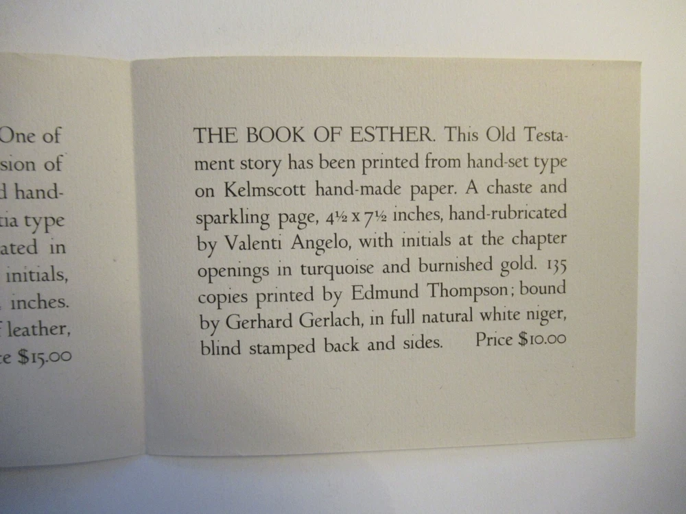 Limited edition of 135 copies. Book in slip case is almost as like new with little noticeable wear. Printed from hand-set type on Kelmscott handmade paper. Hand-illuminated by Valenti Angelo, with initials at the chapter openings in turquoise and burnished gold. Printed by Edmund Thompson; bound by Gerhard Gerlach, in full natural white niger, blind stamped back and sides. Announcement pamphlet included. 36 pages. Very nice copy of rare book.