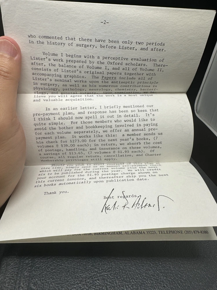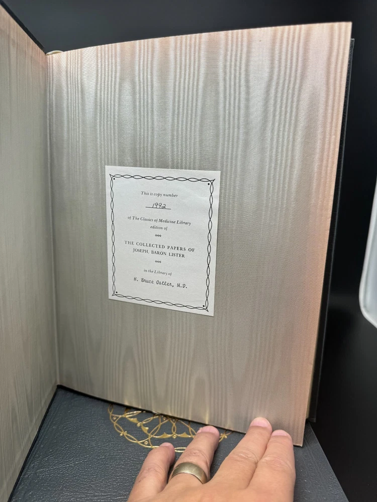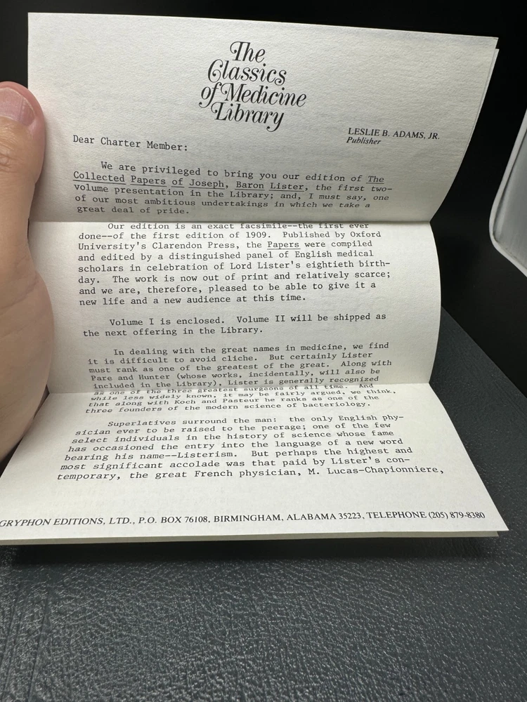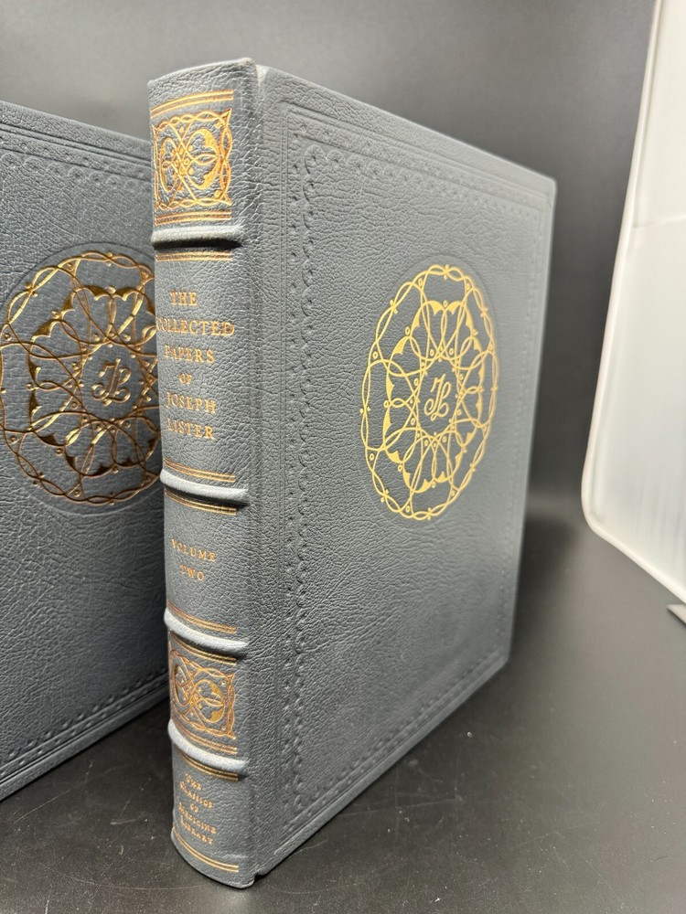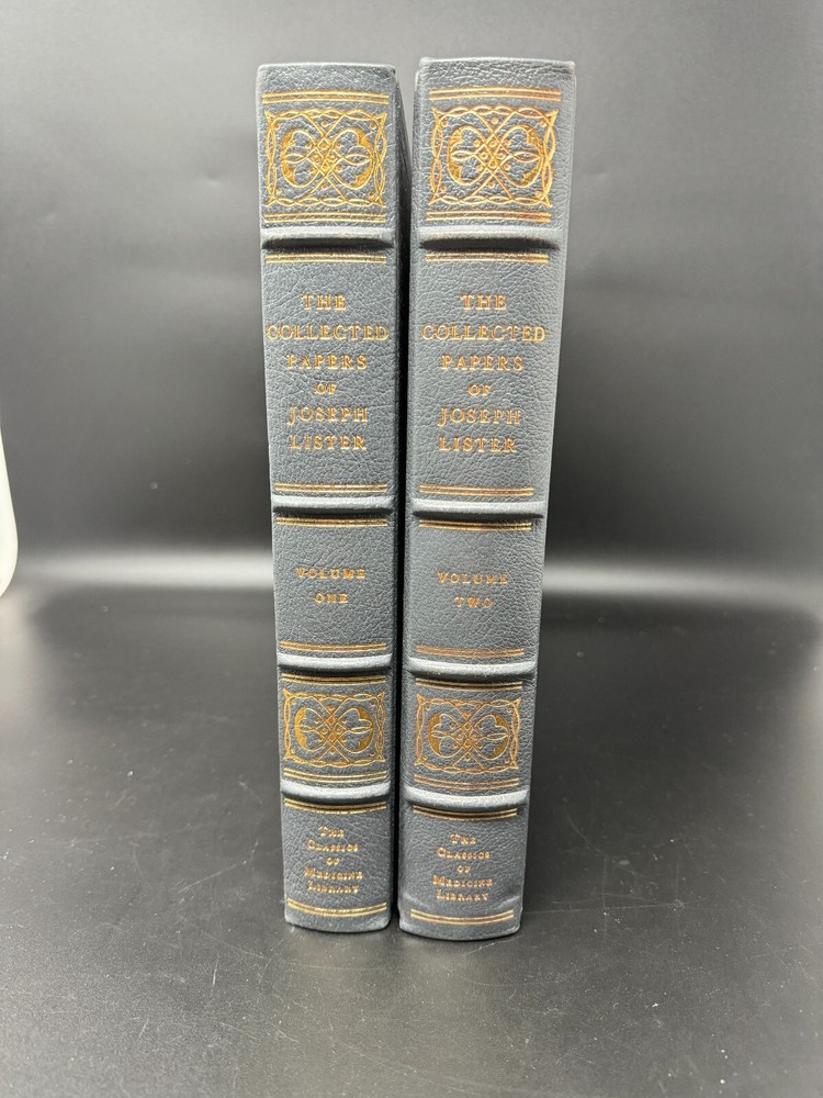 The Collected Papers of Joseph Lister - Two Volumes Set - 1979 Special Edition. This two volume leather hardcover set is in Very Good condition. No markings, rips or liquid damage. Tight binding. Inside front/back cover pages slightly discolored. Numbered copy and ownership certificate pasted on inside page on both volumes. Welcome letter for volume 1 also included. See photo for detail. Flat $9.95 for domestic shipping via USPS. SA4