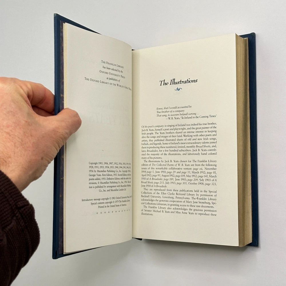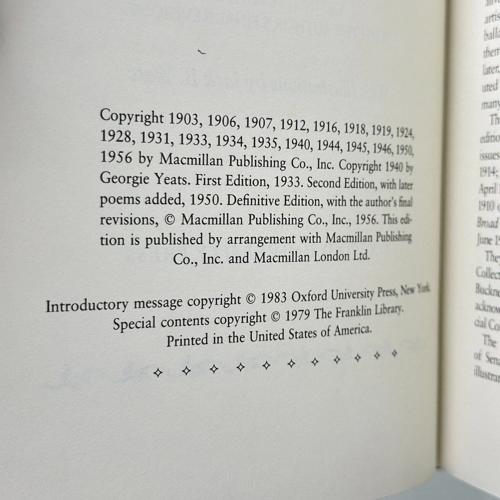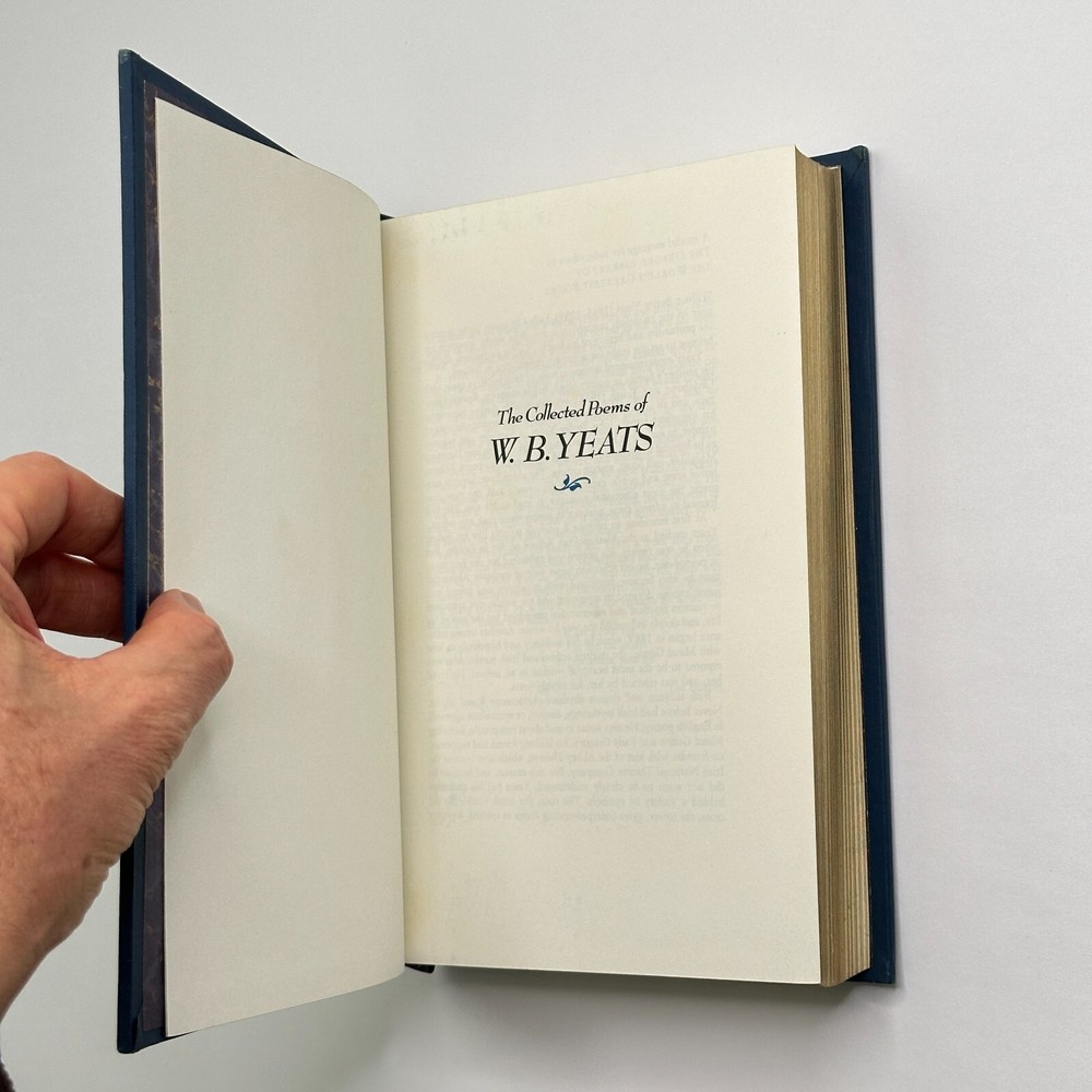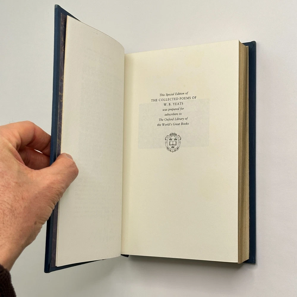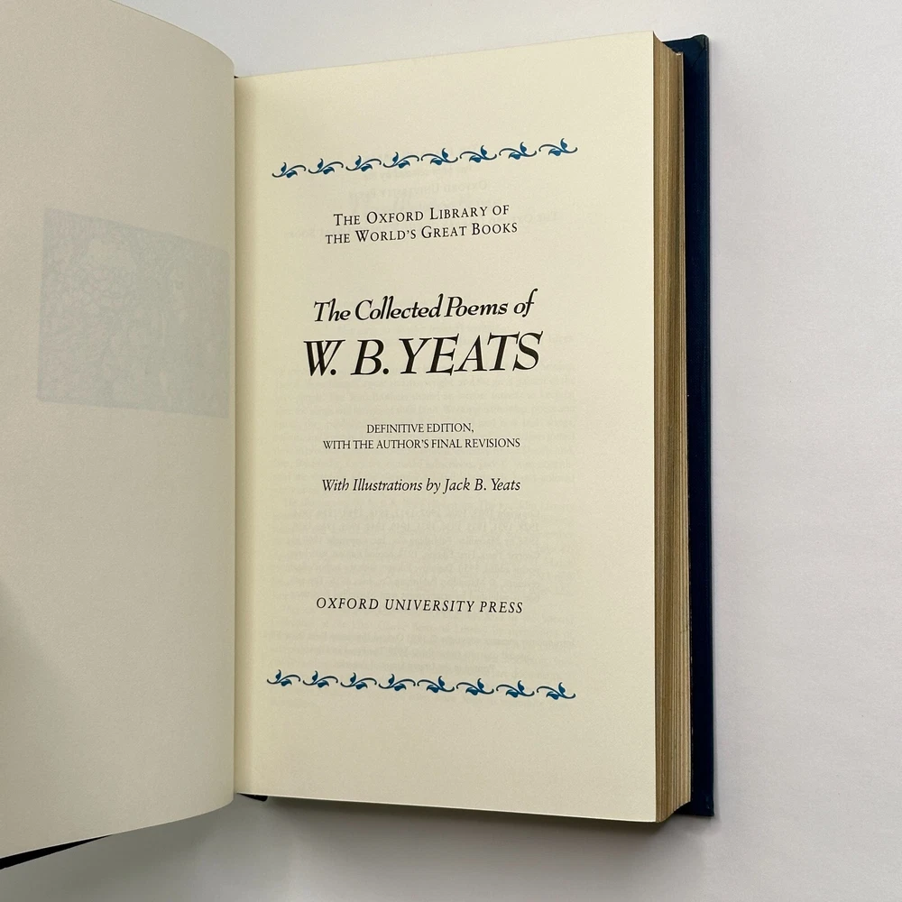 "The Collected Poems of W. B. Yeats" The Oxford Library of the World's Great Books 1983 Oxford University Press Quarter Bound Size: 6.5" x 9.5" Condition: Clean boards and spine; light shelf-wear at bottom edge and corners. Clean text block; top and bottom gilt edges faintly scuffed as shown. No foxing, staining, markings or highlights within. Reading ribbon faded at end. No scent. This collection includes all the poems authorized by W. B. Yeats for inclusion in his standard canon. It spans the entire arc of his career, from early works inspired by Irish myths and legends to later poems reflecting on youth, old age, and national identity. See pictures for condition references and please ask any questions before purchasing! ----------- Orders are carefully packed and shipped in boxes. Books are shipped using USPS Media Mail and represent the best available rate. Orders placed before 2pm ET are shipped the same business day, unless we are away sourcing additional inventory. We combine shipping on orders with multiple items. To request combined shipping, select the option at the top of your shopping cart screen. We'll then send you an invoice with the updated shipping total. Alternatively, you can proceed to check out as usual, and we will refund any additional shipping costs.
