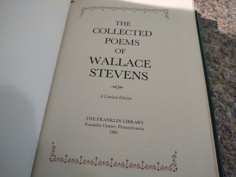 This is a limited edition, collector's item of The Collected Poems of Wallace Stevens, published by Franklin Library in 1981. The book is bound in leather and is a great addition to any literature or poetry collection. The author, Wallace Stevens, is a renowned poet from North America, and this book features a comprehensive collection of his poetry. The book is in good condition showing normal light signs of wear and aging including light hint of musty smell from previous life. I will ship in a secure box for protection.