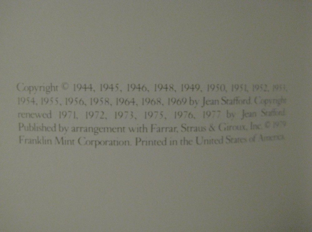 The Collected Stories by Jean Stafford Franklin Library Limited Edition 1st Edition 1st Printing Illustrated Franklin, 1979. VG+. Raised bands, A Limited edition”; full leather with gold lettering and designs ; all edges gilt ; silk moire endpapers ; Illustrated. Pulitzer Prize. A few scuffs, light edge wear and gilt page rubbing. Clean,no writing or marks on interior. A solid collectible copy.
