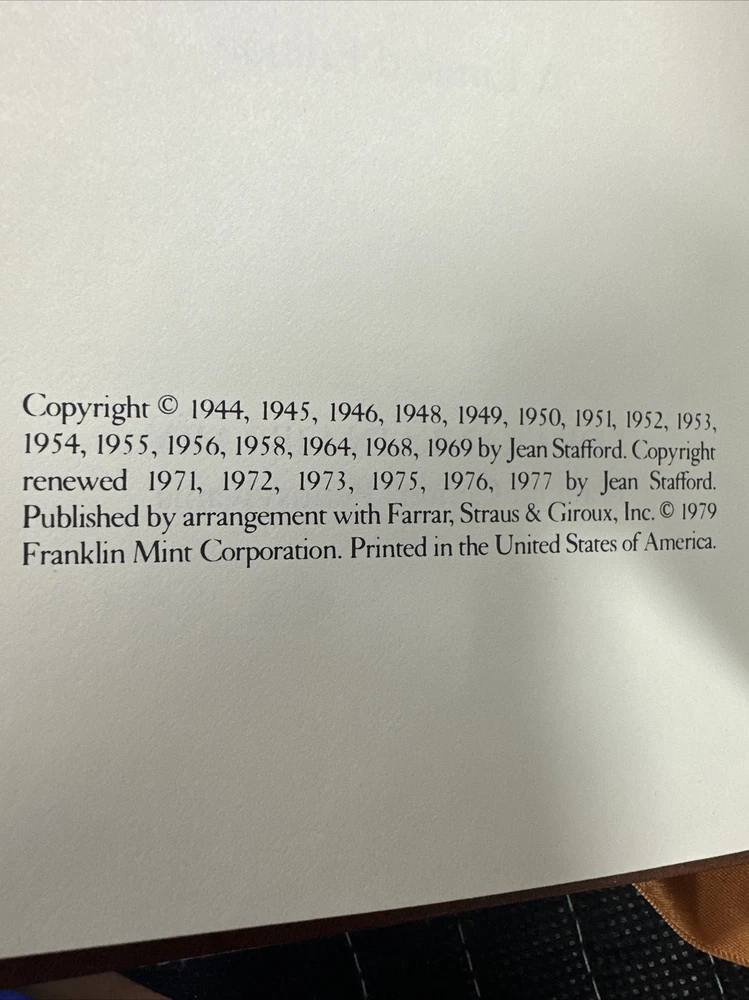 Like new never been read, but has a couple of blemishes. See photos. This limited edition collection of the collected stories of Jean Stafford, published by Franklin Library in 1979. The books are bound in leather and feature illustrations by Barron Storey. The stories are written in English and cover a range of topics, including classics and literature. The books are original and not facsimiles. The region covered in the books is North America. The publisher is Franklin Library, and the author is Jean Stafford. This item is perfect for collectors and lovers of literature.