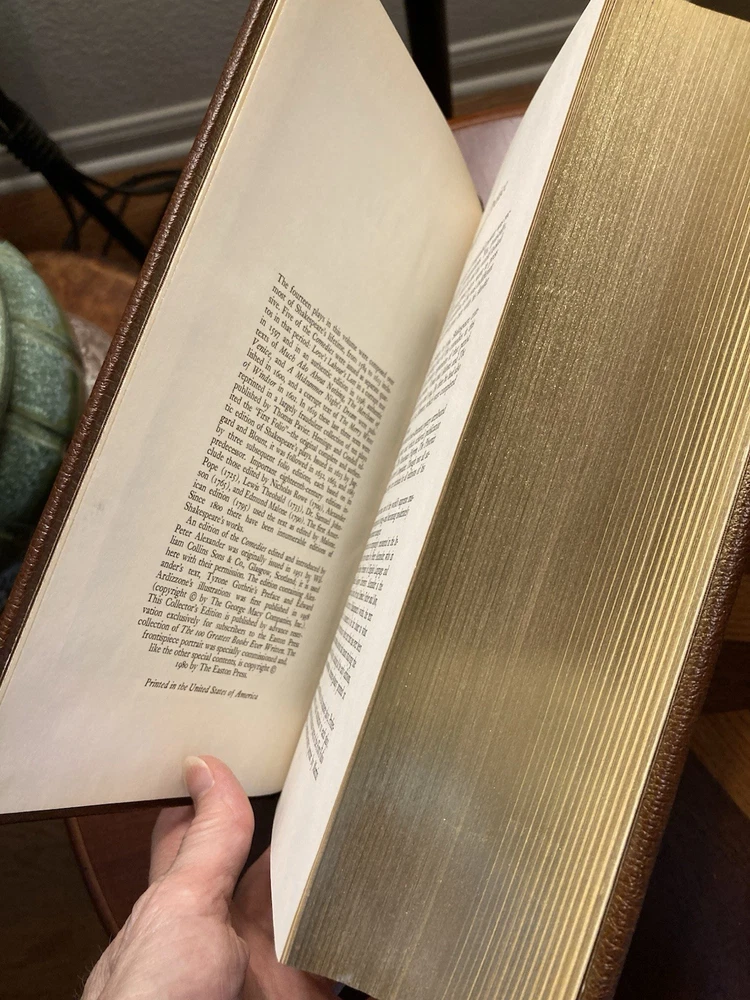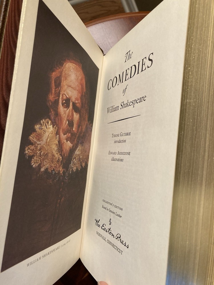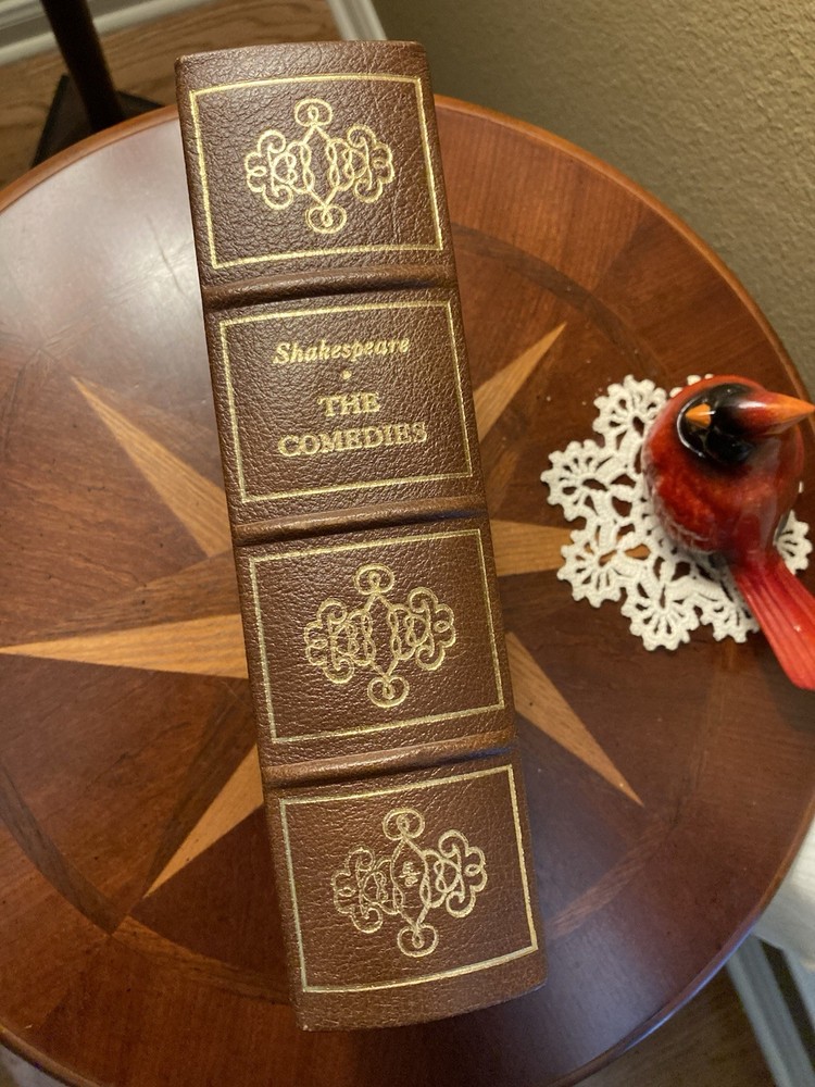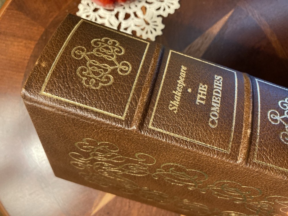 This UNREAD 1980 Easton Press edition of "The Comedies of William Shakespeare" is a collector's item featuring brown leather binding and gold stamping, with illustrations. Published in Connecticut, with gold gilt page edges, this classic is a valuable addition to any Shakespeare enthusiast's collection. From the collection of the 100 greatest books ever written. Add this to your library; it displays beautifully. Unread. A couple very light “blemishes” on leather spine. See photos. If you need other photos please let me know. If interested, please check back for other title listings soon. Ships ground advantage, not media mail. I ship quickly once payment is received. This book will be packed carefully. Thank you for your interest.