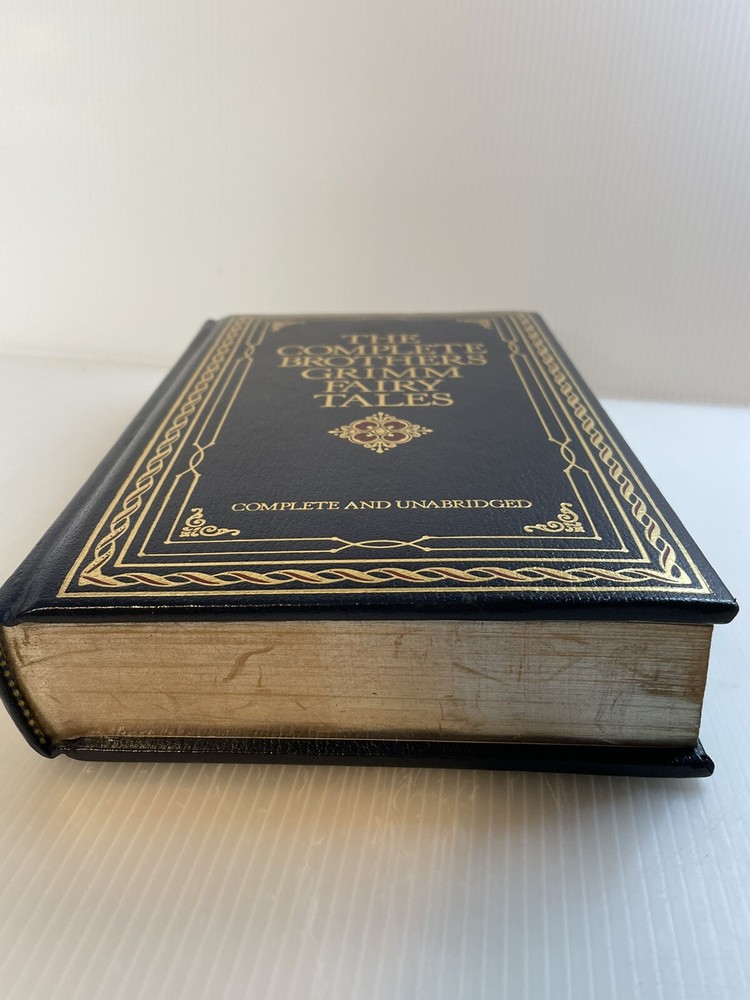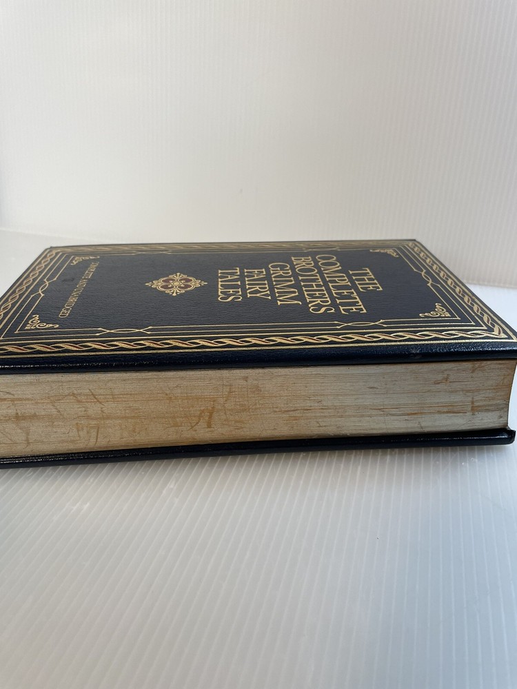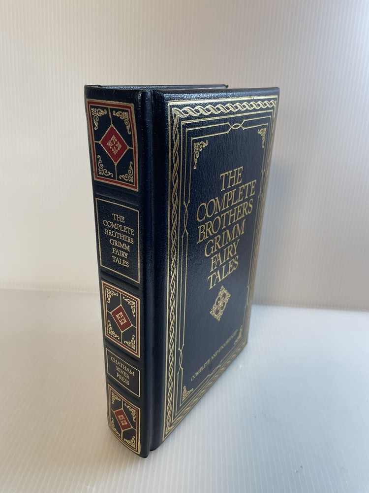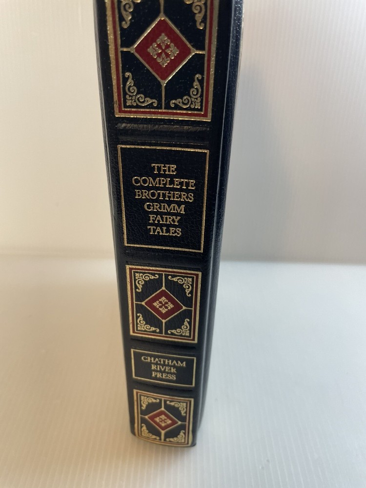**Has some writing inside front cover TITLE, PUBLICATION, CONDITION: THE COMPLETE BROTHERS GRIMM FAIRY TALES Chatham River Press, 1981 This is a lovely bonded leather covered classic. Pages are unmarked, no names, binding tight. Age/usage wear on text block, somewhat yellowed pages as expected for original quality. The gilded edges has some scratches. Please see pictures.