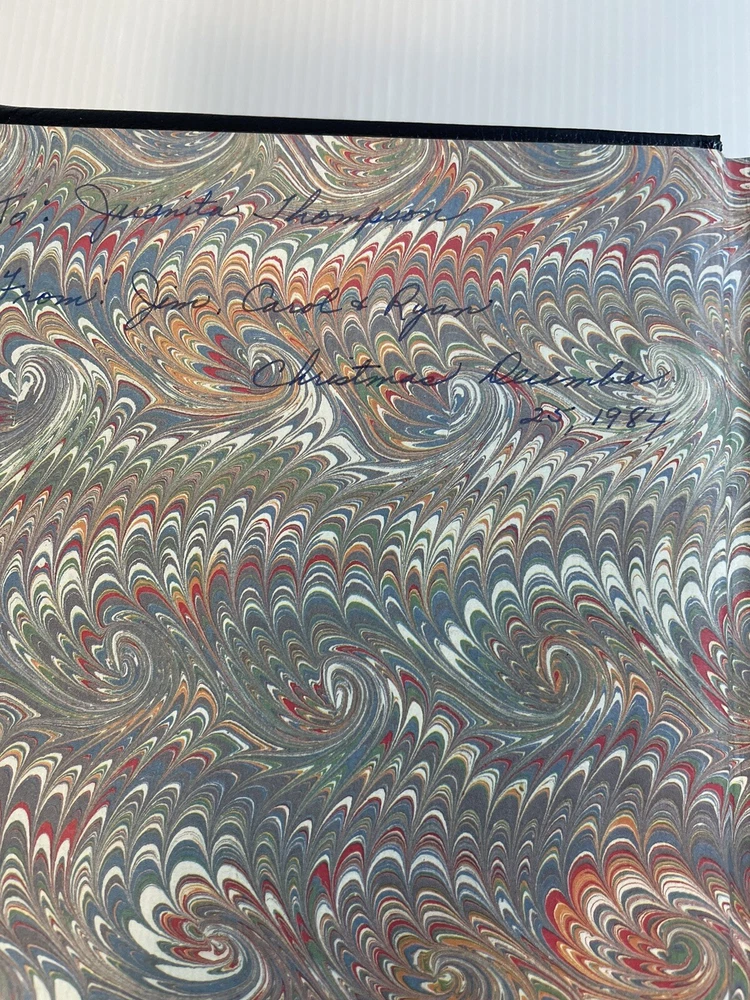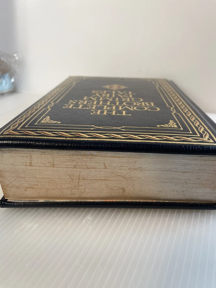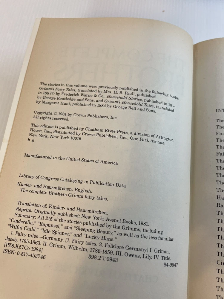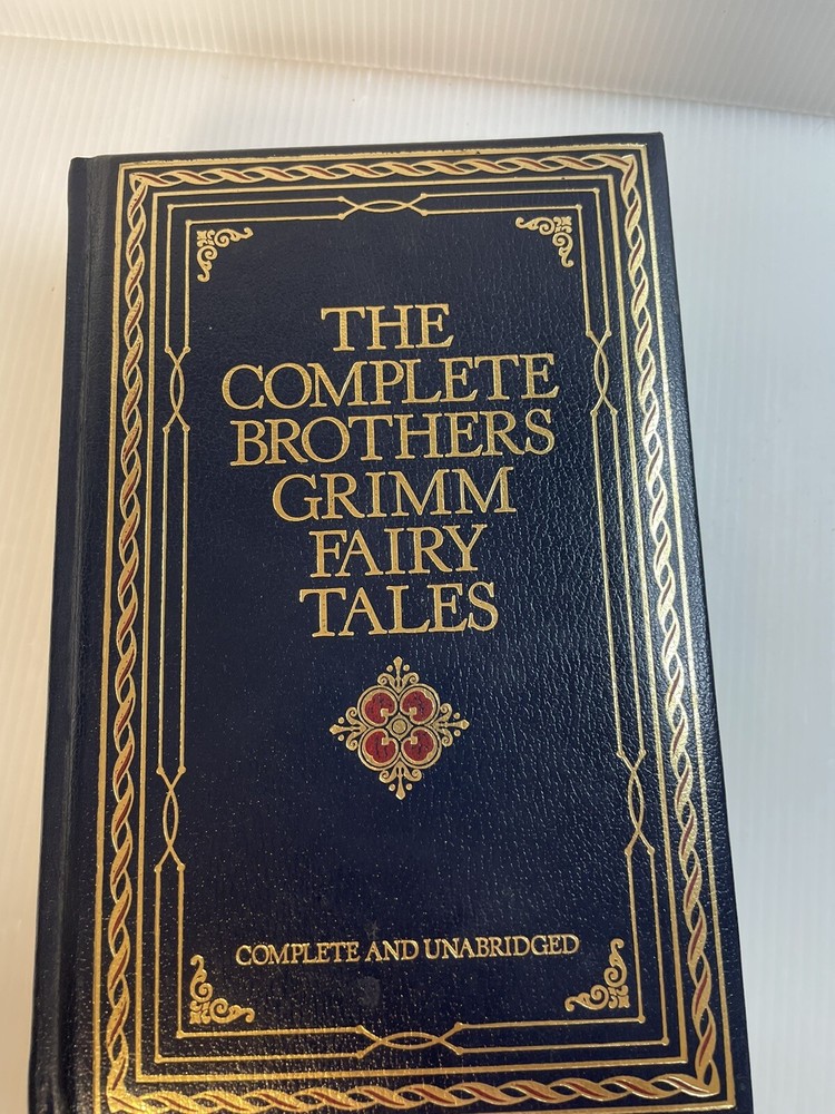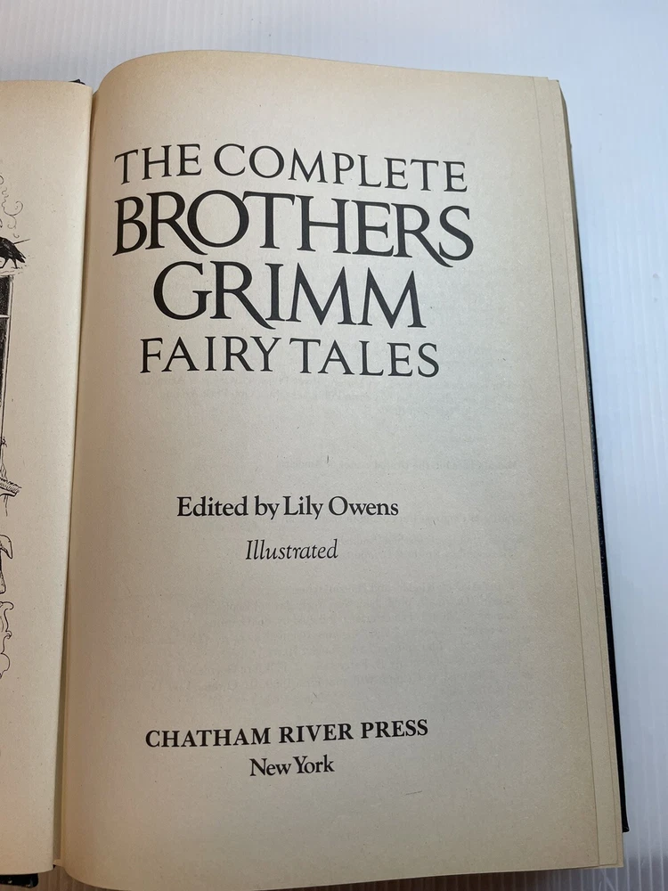 **Has some writing inside front cover TITLE, PUBLICATION, CONDITION: THE COMPLETE BROTHERS GRIMM FAIRY TALES Chatham River Press, 1981 This is a lovely bonded leather covered classic. Pages are unmarked, no names, binding tight. Age/usage wear on text block, somewhat yellowed pages as expected for original quality. The gilded edges has some scratches. Please see pictures.