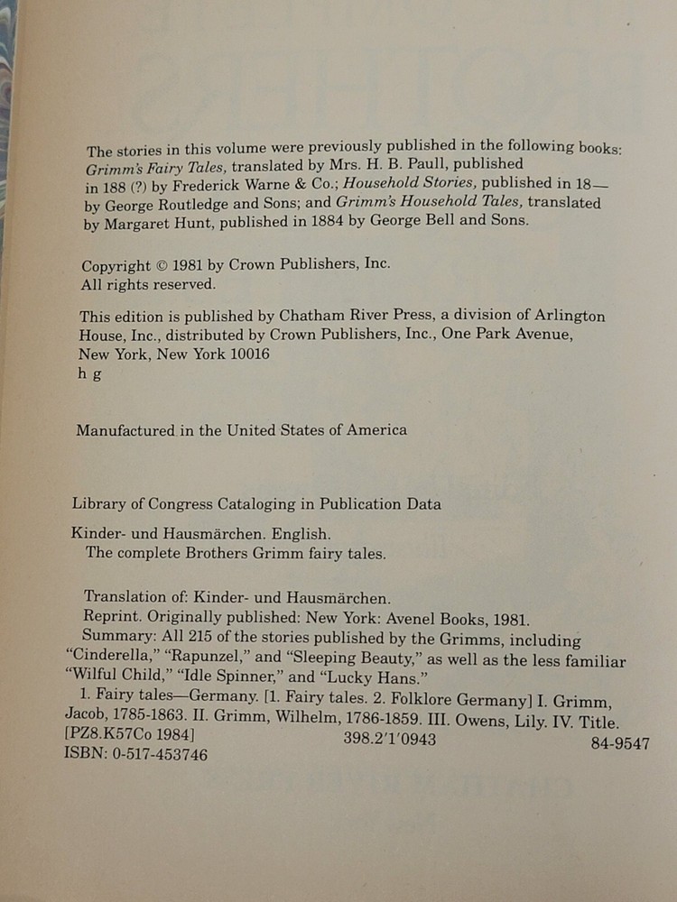The Complete Brothers Grimm Fairy Tales, 1981 Collector's De Luxe, Chatham River.