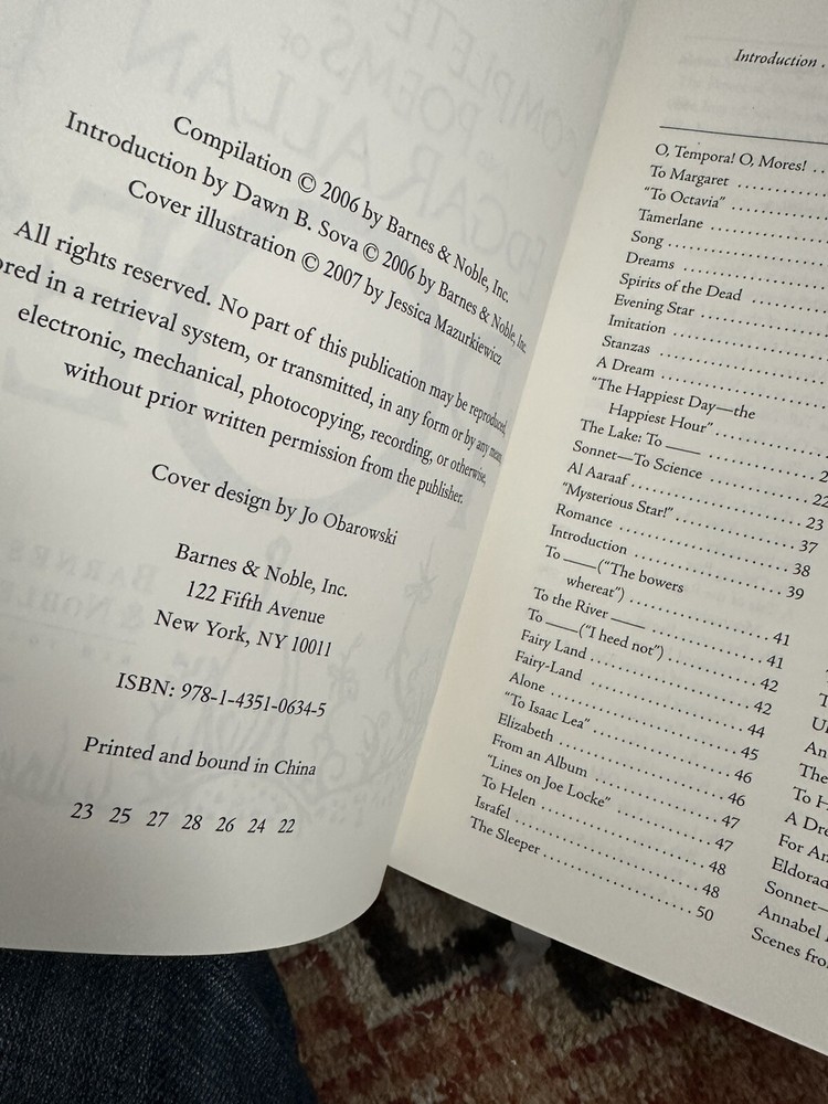 This Barnes & Noble collector's edition of "The Complete Tales and Poems of Edgar Allan Poe" is a must-have for fans of horror and poetry. This hardcover anthology features all of Poe's works, including his famous poems "The Raven" and "Edgar Allan," in a leather-bound format. With an intended audience of young adults and adults, this book is perfect for anyone who loves Poe's genre. It is not personalized or inscribed, and does not feature an ex libris or signature. Published in 2007, this edition is in English and was printed in the United States. Get your hands on this classic piece of literature today! IN VERY GOOD USED CONDITION. HASN'T SEEN A LOT OF USE. PLEASE EMAIL ME WITH QUESTIONS,CHEERS!