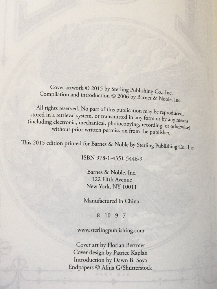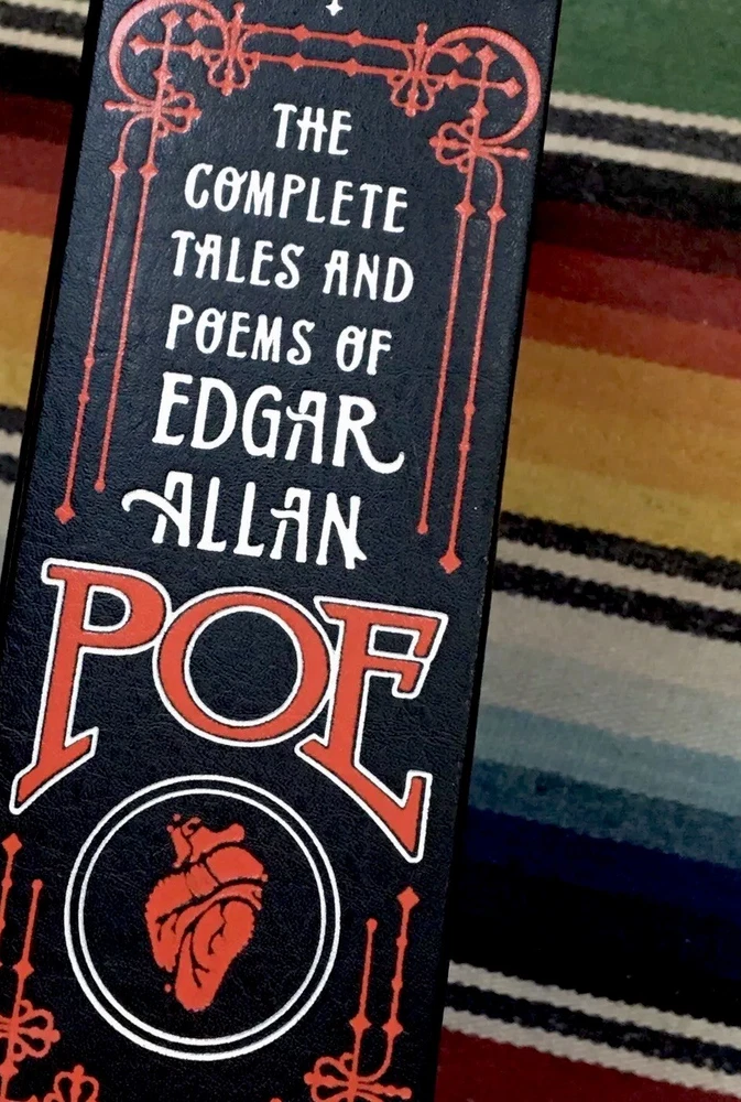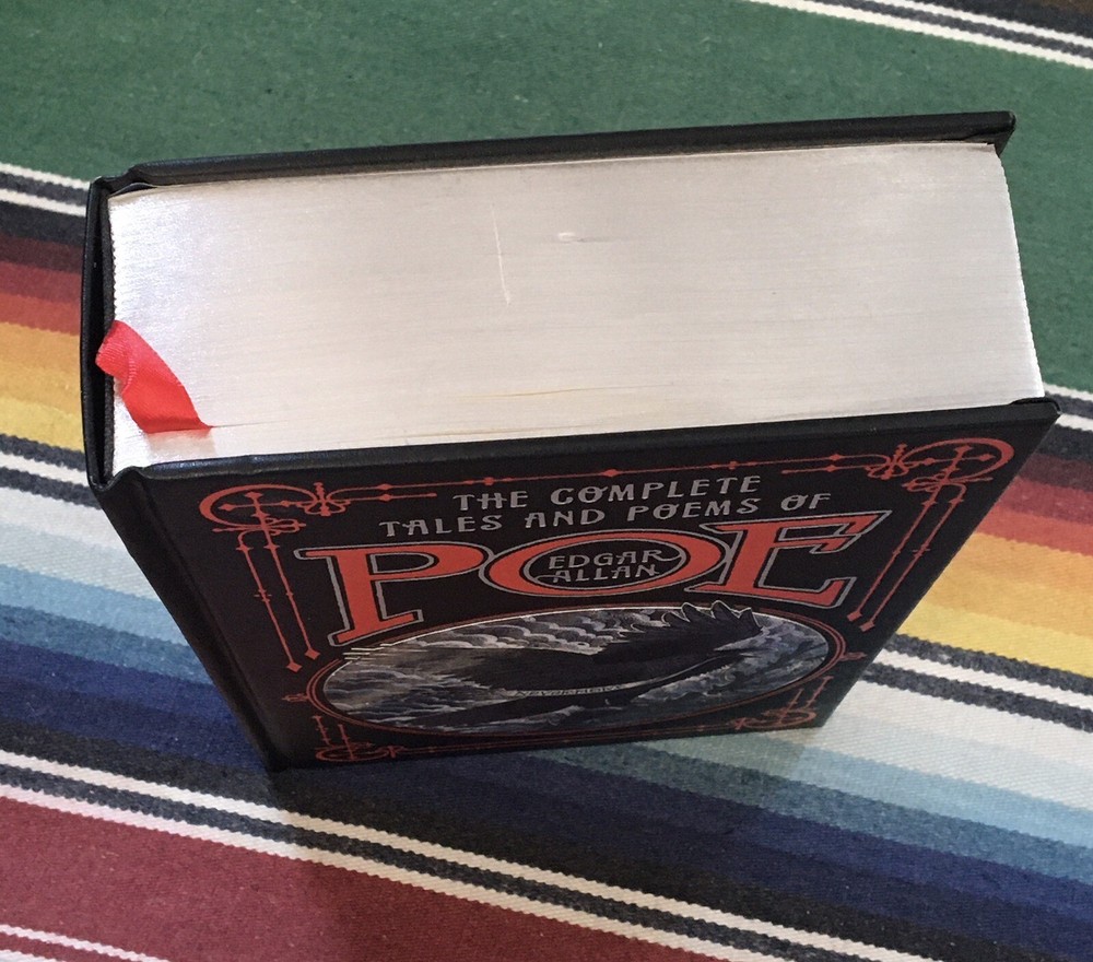 A fancy, classic bonded leather edition of Poe's complete works published by Barnes & Noble in nice shape with some scratching to the silver gilt trim to the edges. Pages inside look very good with minimal wear from age.