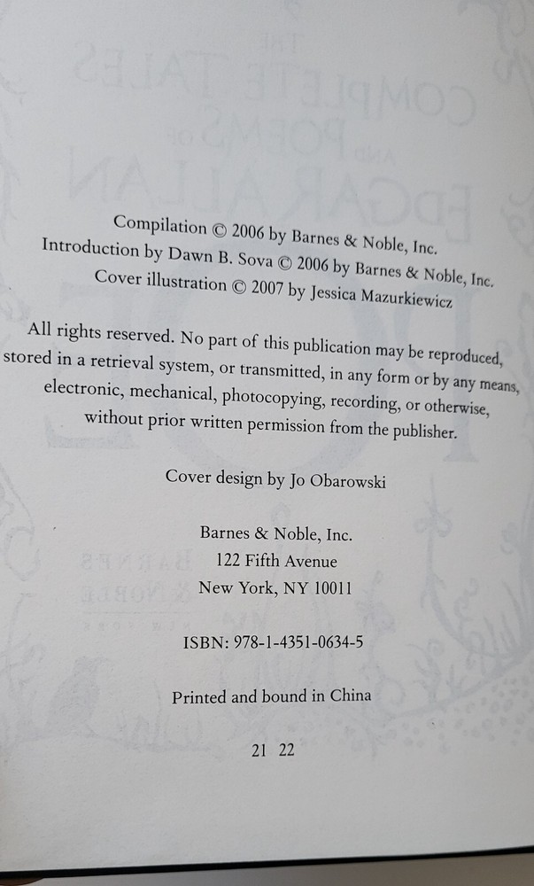Hello and welcome! Please feel free to view our other listings by clicking HERE , you may not be interested in this particular item but perhaps you'll find something...unexpected! The Complete Tales and Poems of Edgar Allan Poe Hardcover by Edgar Allan Poe Edgar Allan Poe was one of the earliest pioneers of the short story and perfected the tale of psychological horror. The entirety of Poe's body of imaginative work encompasses detective tales, satires, fables, fantasies, science fiction, verse dramas and some of the most evocative poetry in the English language. This leatherbound omnibus collects all of Poe's fiction and poetry in a single volume, including "The Fall of the House of Usher", "The Tell-Tale Heart", "The Pit and the Pendulum", "The Raven", "Annabel Lee", and the full-length novel "The Narrative of Arthur Gordon Pym of Nantucket". "The Complete Tales and Poems of Edgar Allan Poe" is part of Barnes & Noble's series of quality leatherbound volumes. Each title in the series presents a classic work in an attractively designed edition bound in genuine bonded leather. These books make elegant additions to any home library. Author, poet, and literary critic, Edgar Allan Poe is credited with pioneering the short story genre, inventing detective fiction, and contributing to the development of science fiction. However, Poe is best known for his works of the macabre, including such infamous titles as The Raven, The Pit and the Pendulum, The Murders in the Rue Morgue, Lenore, and The Fall of the House of Usher. Part of the American Romantic Movement, Poe was one of the first writers to make his living exclusively through his writing, working for literary journals and becoming known as a literary critic. His works have been widely adapted in film. Edgar Allan Poe died of a mysterious illness in 1849 at the age of 40. Publisher B & N (Jan 1, 2007) Hardcover 1023 pages ISBN-13 978-1435106345 Weight 3.25 pounds Dimensions 9.2 x 6.4 x 2.2 inches As a big fan of Edgar Allan Poe, I knew I had to get Edgar Allan Poe: Complete Tales and Poems as soon as I saw it, and it did not disappoint! This collection is absolutely incredible, bringing together all of Poe’s hauntingly beautiful tales and poems in one volume. The quality of the book is excellent, with a sturdy binding and clear, easy-to-read text. It’s perfect for both casual reading and displaying on a bookshelf. Having all of his works in one place makes it a treasure for any fan of classic literature. Whether you’re revisiting your favorites like The Raven or discovering some of his lesser-known works, this book is a joy to own. Highly recommend for anyone who appreciates Poe’s masterful storytelling and poetic genius! All sales will be shipped securely with packing peanuts and will be shipped within ONE business day! If you have any questions at all, don't hesitate! All orders shipped within 1 business day! If you don't see it- ask! It MAY be in stock! We'll be glad to put a listing up for you! Respond to messages in 24 hours or less!