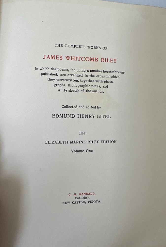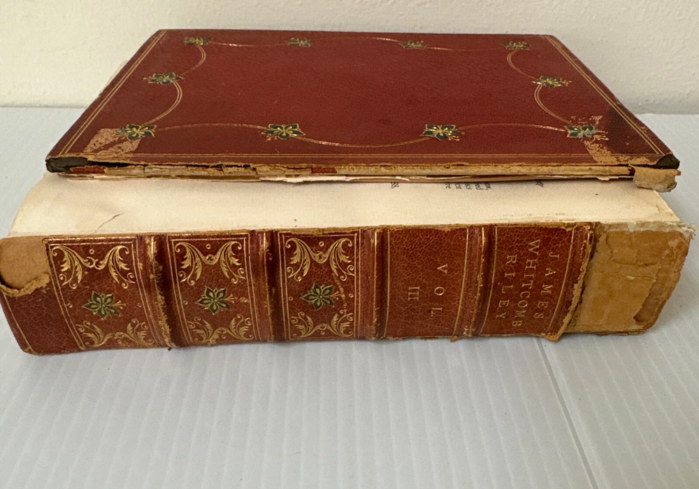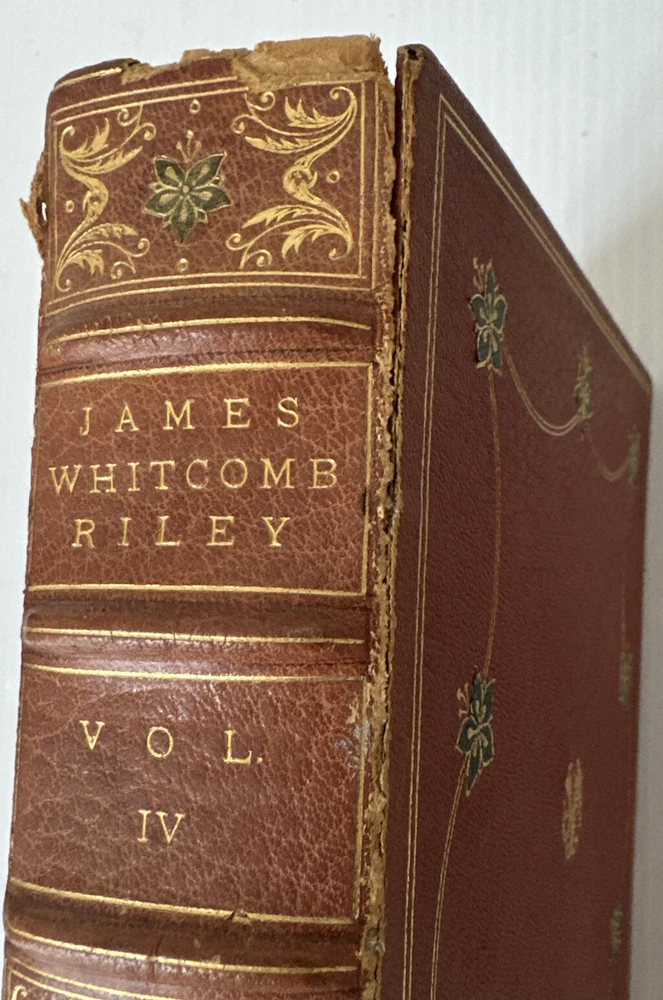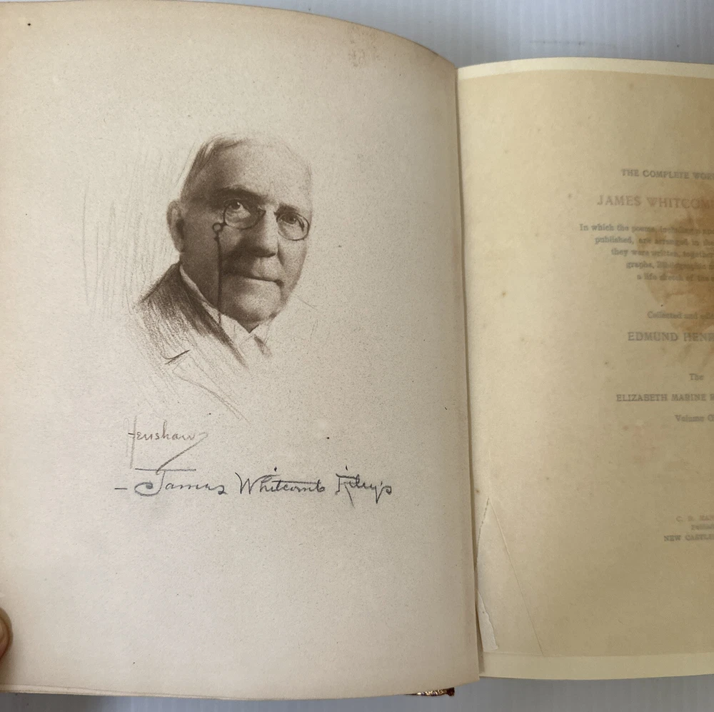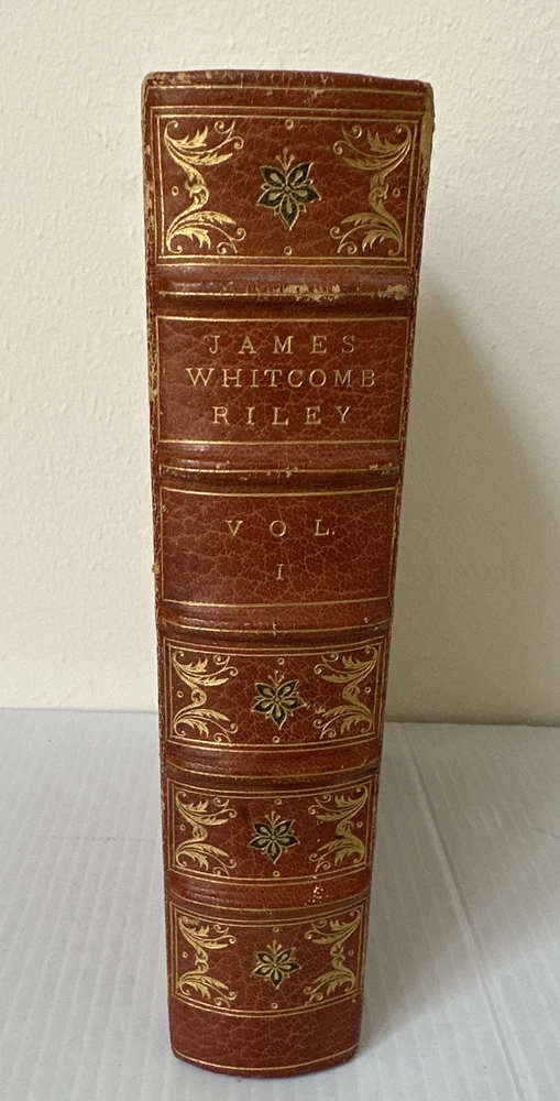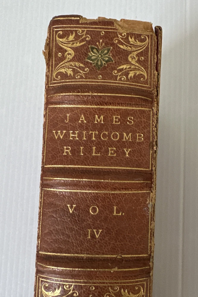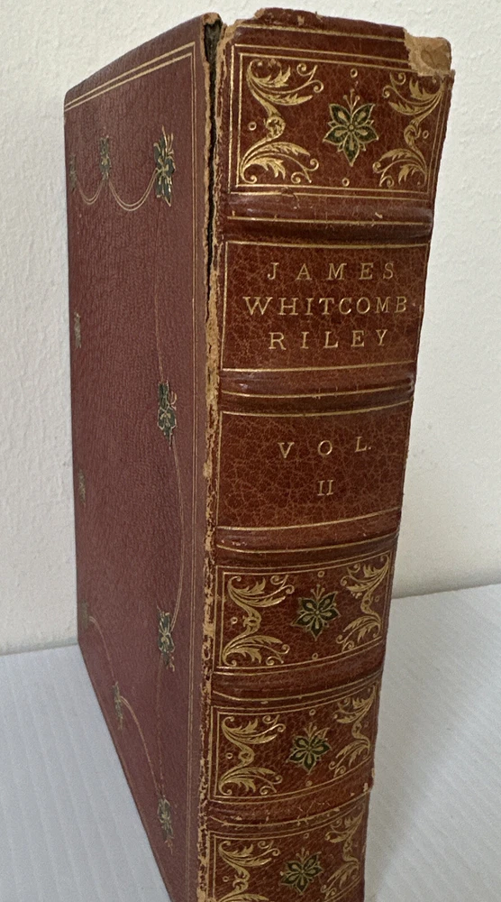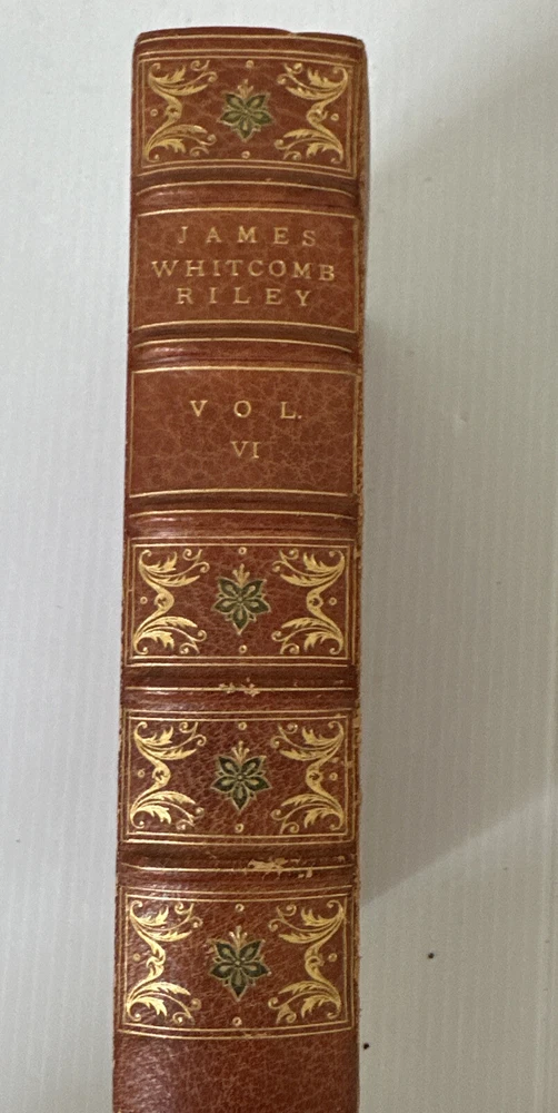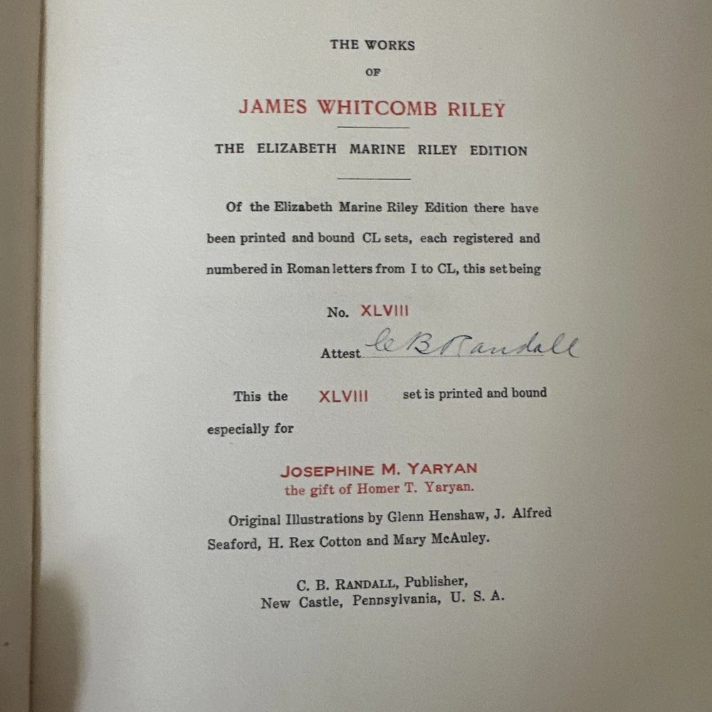 The Complete Works James Whitcomb Riley Elizabeth Marine Edition Signed 48/150 Signed by James Whitcomb Riley in Volume I Each volume signed by Publisher C.B. Randall on Limited Edition Page Limited, Numbered Edition XLVIII (48) of only 150 Published in 1913 Six volumes bound in full marbled calf leather Beautifully illustrated with plates and original watercolors and ornaments Spines are decoratively tooled and metered in gold gift with raised (rubbed) spines Beautiful Maroon moire endpapers (front and back) framed in leather with gold gilt decoration Top page edges gilt Each volume has a frontispiece with tissue guard Each volume measures 8.5" x 7" Illustrated with photographic and sepia plates throughout Volume III -back cover is off and spine is damaged Other volumes have tears on cover - see photos and video Please view all photos carefully. Requests for more photos are welcome. Originally owned by Josephine M. Yaryan given to her by her husband, Homer T. Yaryan. Her initials are on the cover of each volume. Mrs. Yaryan was socially prominent when she lived in Toledo, Ohio. Her husband developed the Yaryan heating system.