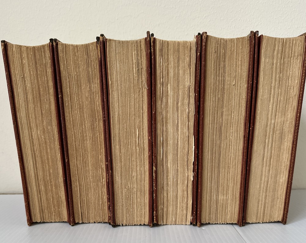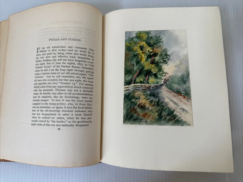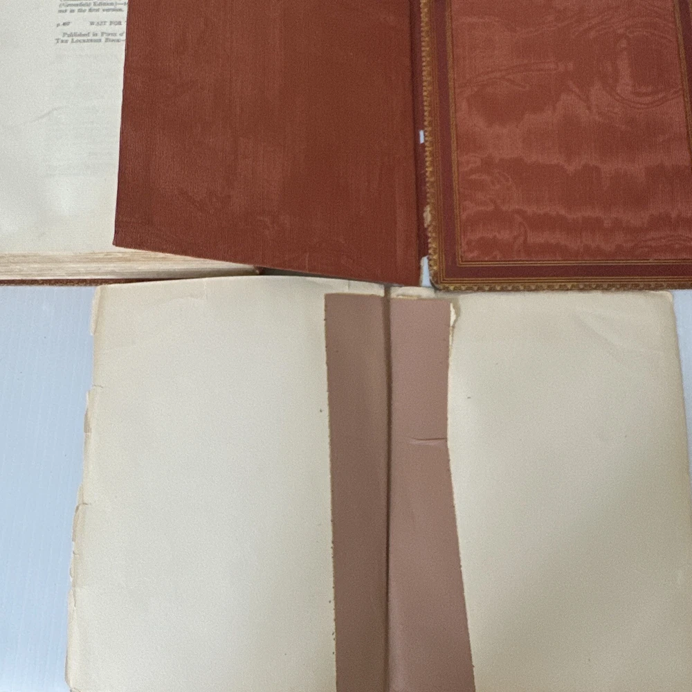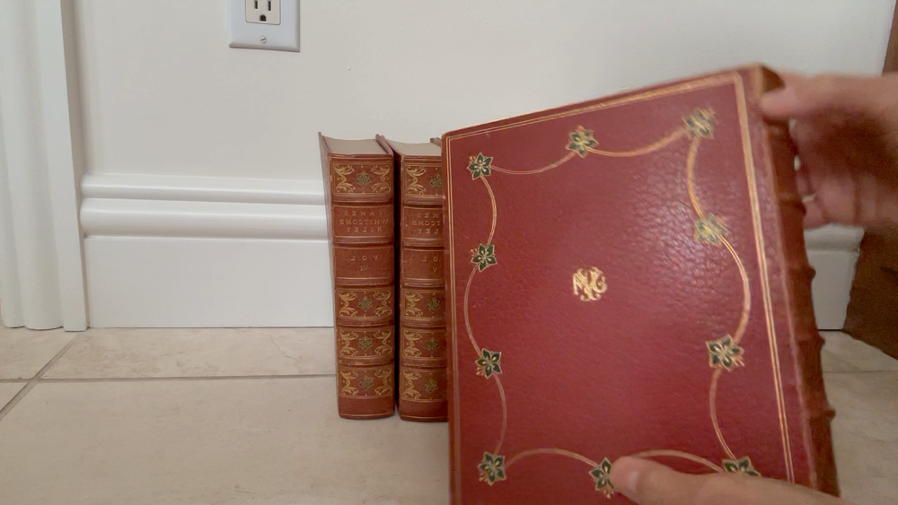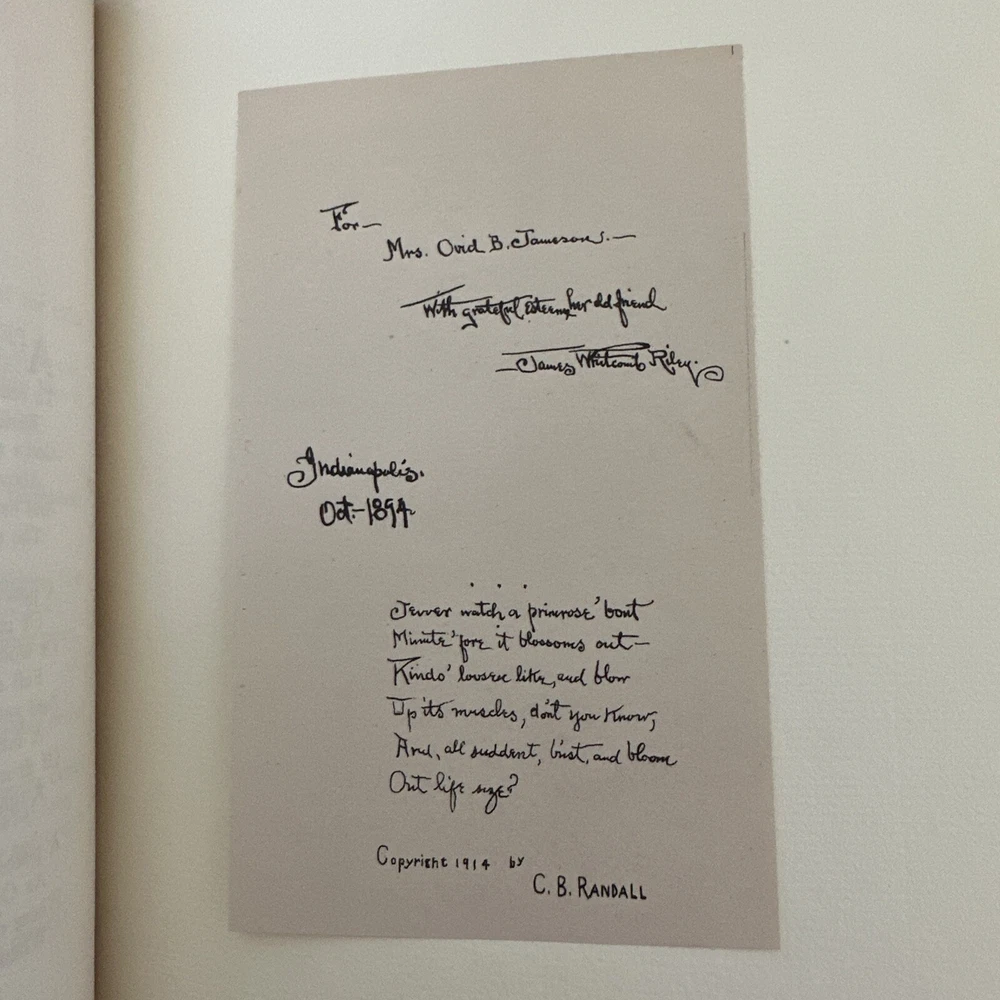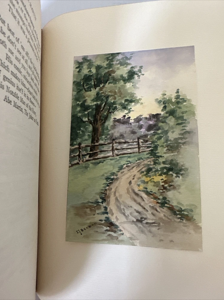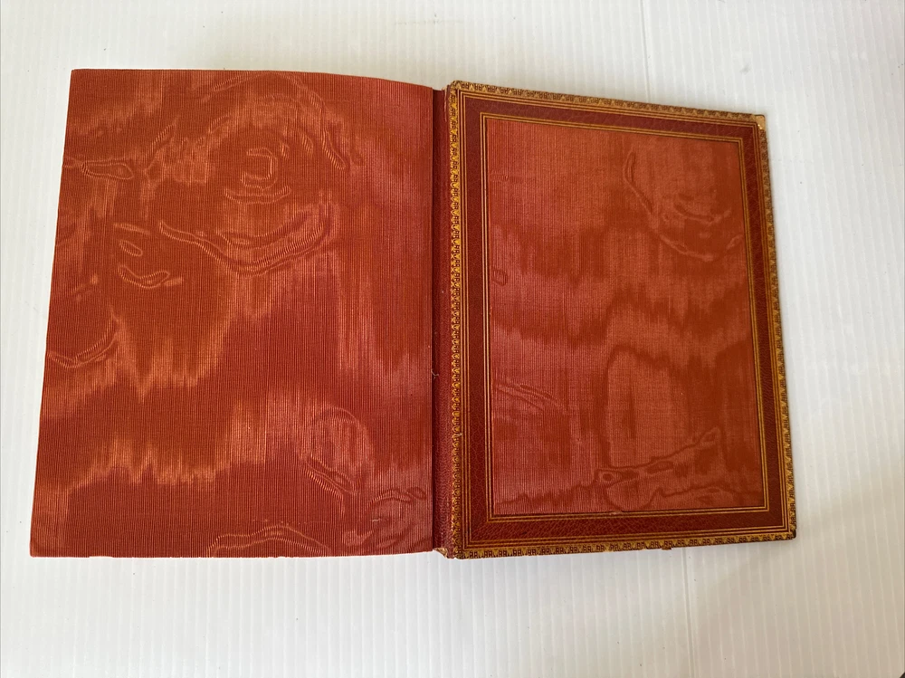 The Complete Works James Whitcomb Riley Elizabeth Marine Edition Signed 48/150 Signed by James Whitcomb Riley in Volume I Each volume signed by Publisher C.B. Randall on Limited Edition Page Limited, Numbered Edition XLVIII (48) of only 150 Published in 1913 Six volumes bound in full marbled calf leather Beautifully illustrated with plates and original watercolors and ornaments Spines are decoratively tooled and metered in gold gift with raised (rubbed) spines Beautiful Maroon moire endpapers (front and back) framed in leather with gold gilt decoration Top page edges gilt Each volume has a frontispiece with tissue guard Each volume measures 8.5" x 7" Illustrated with photographic and sepia plates throughout Volume III -back cover is off and spine is damaged Other volumes have tears on cover - see photos and video Please view all photos carefully. Requests for more photos are welcome. Originally owned by Josephine M. Yaryan given to her by her husband, Homer T. Yaryan. Her initials are on the cover of each volume. Mrs. Yaryan was socially prominent when she lived in Toledo, Ohio. Her husband developed the Yaryan heating system.
