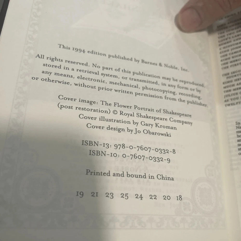 This beautiful hardcover edition of The Complete Works of William Shakespeare is a must-have for any literature lover. With its gilded pages and intricate leather binding, it's a collectible item that will be cherished for years to come. The book was published by Barnes and Noble in 1994, and includes all of Shakespeare's plays and sonnets in their original English language. The special attributes of this edition make it a unique item for collectors, without compromising the original content. The book is in its original condition, and has not been modified in any way. It's a rare find that belongs in the collection of any serious book collector or Shakespeare enthusiast.