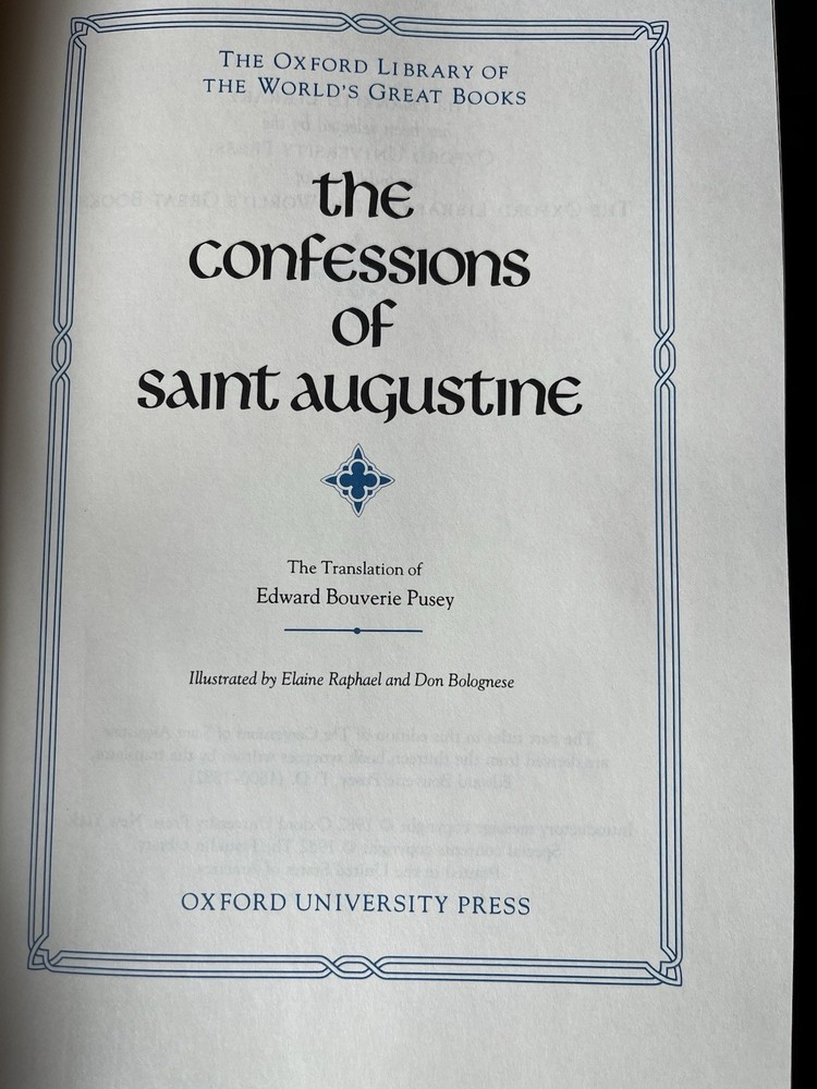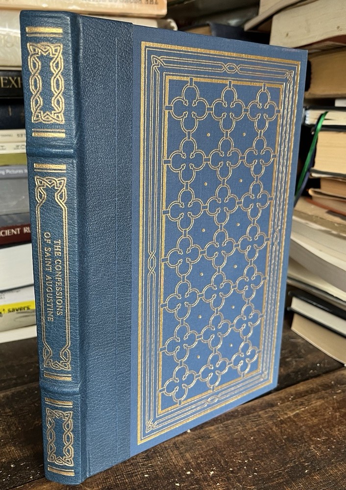 The Confessions of Saint Augustine . Oxford Library Of World’s Great Books/Franklin, 1982. Beautifully printed 1/4 bound leather with marbled endpapers, ribbed spine, gold leaf page edges, and sewn-in ribbon marker in pristine, unused condition with no interior markings or other visible flaws. Bound in one quarter premium full leather. Accented in 22kt gold. Printed on archival paper with gilded edges. Decorated endsheets and with a silk ribbon page marker. Smyth sewing and concealed muslin joints.; First Franklin Library Edition. $4.75 domestic U.S. shipping