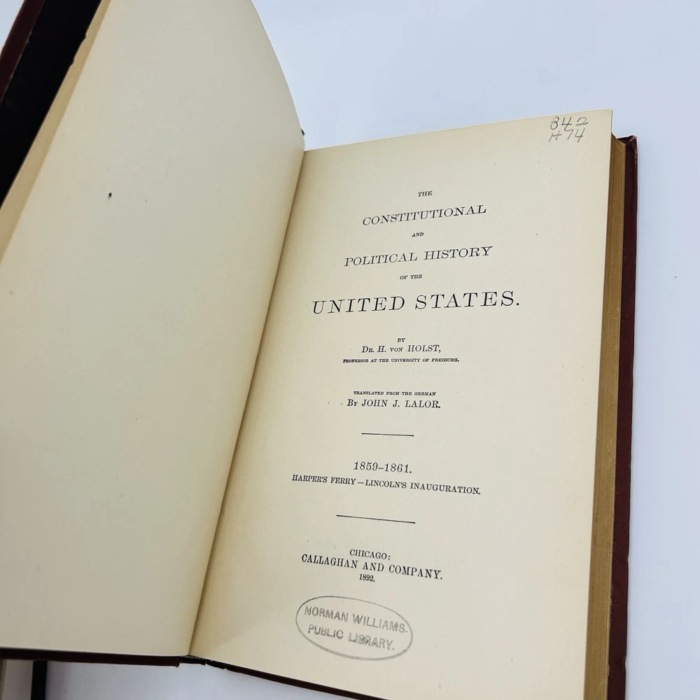 This luxury edition limited edition book titled "The Constitutional and Political History of the United States: 1859-1861" by H. Von Holst is a must-have for any adult interested in administration, history and theory, classicism, and the Constitution. The 459-page book, published in 1892 by Callaghan and Company, is a vintage trade paperback with a leather-bound cover. The book features an ex libris and is a part of the "The Constitutional and Political History of the United States" book series. It is a non-fiction narrative that illustrates the political climate of the United States during the late 19th century. The book is in English and was originally published in America. This literary collection and political science novel is perfect for anyone interested in the history of the United States and the development of its Constitution.