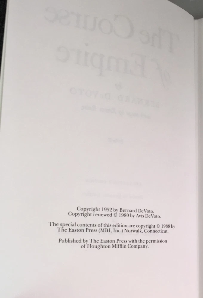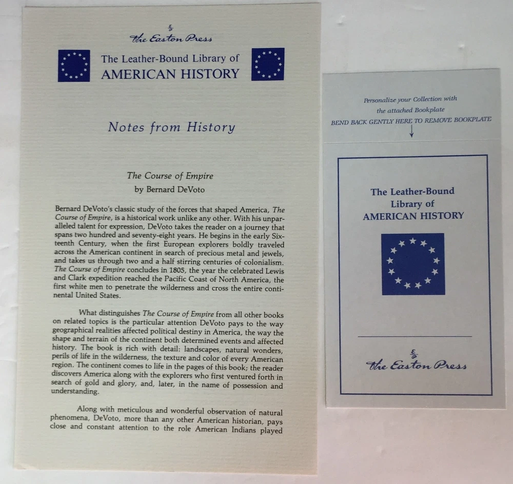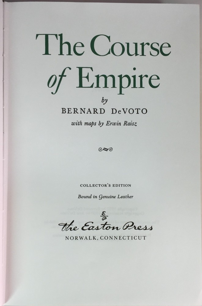 The Course Of Empire by Bernard Devoto, Easton Press, 1988 The Course Of Empire by Bernard Devoto, Easton Press, 1988 The Course Of Empire by Bernard Devoto Part of the American History collection of The Easton Press, Norwalk, Connecticut, 1988. This book is in excellent, unread condition. Includes Notes from History. The Easton Press books are bound in genuine leather binding, with 22kt gold accents and hubbed spines, gilded page ends, acid-neutral paper, and evocative illustrations and decorations. We will be happy to combine shipping, wherever possible. Some items cannot be combined because of their size, weight or because they are fragile. Please ask if you have any questions. Your order will ship by the next business day after receiving payment. All items are from a smoke-free environment. Thank you, and Happy Reading!