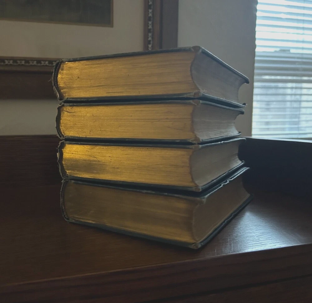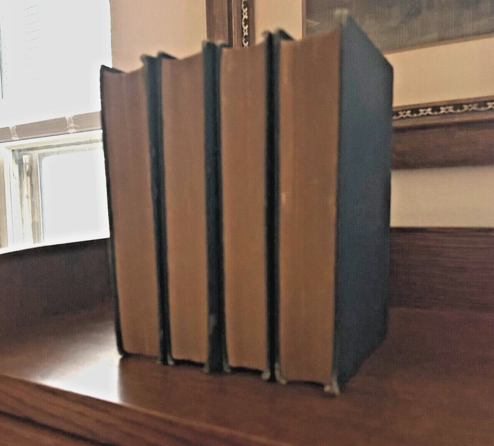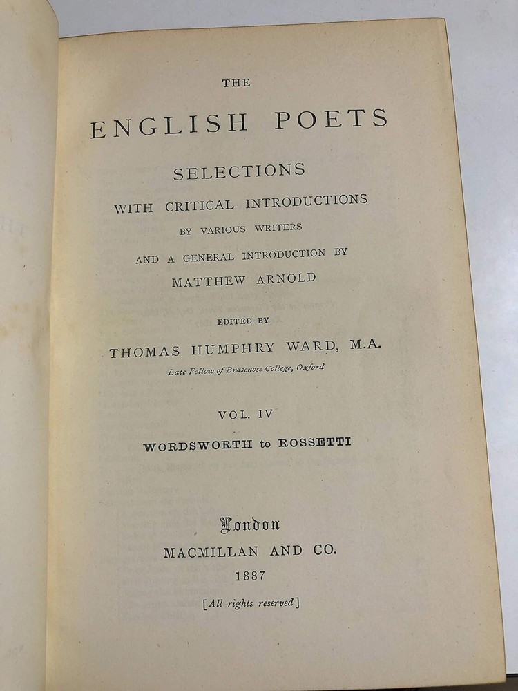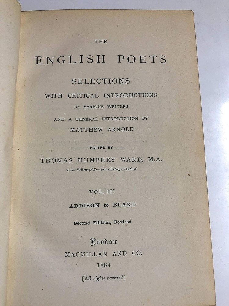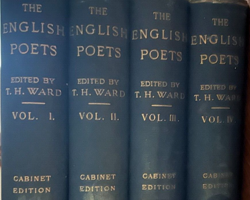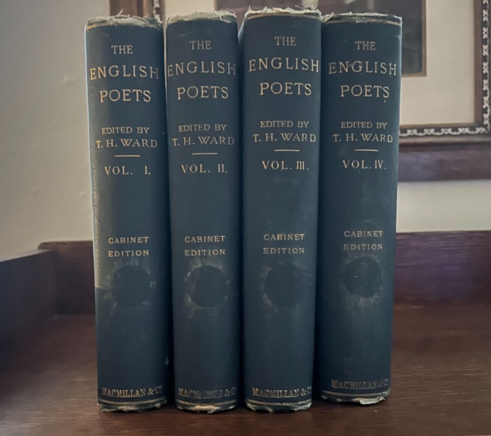 The English Poets. Four Volumes. First Edition. Full title: The English Poets: Selections with Critical Introductions. Complete cabinet edition in four volumes. First Edition thus. Published over five years: 1883-1888. Publisher: McMillan Company. Editor: Ward, Thomas Humphry. Rare. A true and complete 1st edition, not the 1894 version or the "Students" editions of the early 1900s. Hardcover . Original publisher's bindings. Blue boards with gilt lettering. vol. 1, 566 pp. Chaucer to Donne; vol.2, 496 pp. Ben Jonson to Dryden; vol.3, 608 pp. Addison to Blake; vol. 4, 670 pp. Wordsworth to Tennyson. All in good condition with some bumping to binding corners and spines. Bindings are tight. Pages clean.