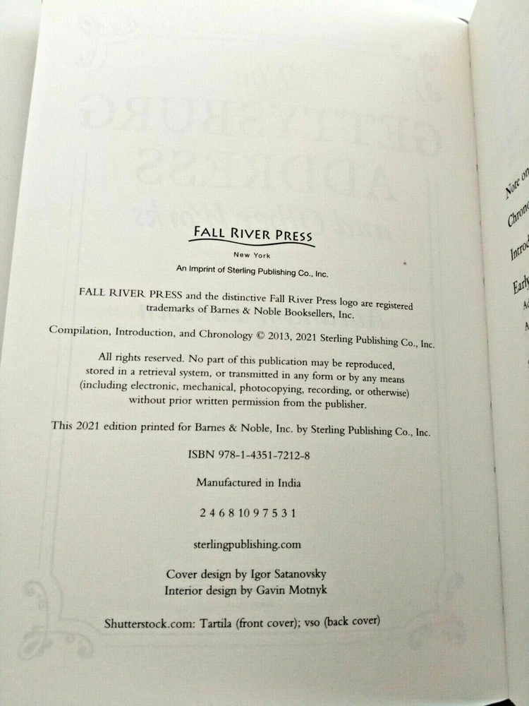 The Gettysburg Address and Other Works: Abraham Lincoln History/ First print of the 2021 book edition (t here is a 1 in the number line). Unread 494-page book with faux leather softcover. This 2021 edition was printed for Barnes & Noble, Inc. by Sterling Publishing Co., Inc. There is a black pinpoint size dot on the page with printing & copyright information (see photo). Please message for any questions. Thanks! Abraham Lincoln was one of the most gifted orators of his day, and he wielded words both to incite the American people to the cause of justice and to offer consolation to a country riven by civil war. This omnibus volume features more than fifty speeches, addresses, and letters including “The Gettysburg Address,” his memorial to the American Civil War dead; the “Emancipation Proclamation,” which formally ended the institution of slavery when it was signed into law on January 1, 1863; and his now famous “House Divided” speech. Delve into the poignant prose of Abraham Lincoln with "The Gettysburg Address and Other Works," a Barnes & Noble Special Edition that offers a timeless journey through history. This softcover collectible is a must-have for enthusiasts of Lincoln's writings, presenting not only the renowned Gettysburg Address but also other significant pieces that reflect the eloquence and wisdom of one of America's most revered presidents. Crafted with a faux leather bound cover that adds a touch of sophistication, this book is an ideal addition to any history lover's library. Published in 2021 by Fall River Press/Sterling Publishing Company, it stands as a testament to the enduring legacy of Lincoln's political and historical insights, making it a valuable piece for both avid readers and collectors alike.