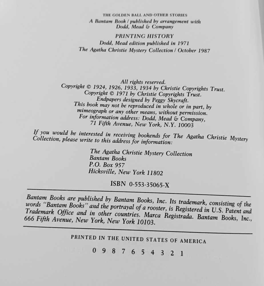 The Golden Ball and Other Stories Agatha Christie Mystery Collection 1987 Bantam Details: The Agatha Christie Mystery Collection Title: The Golden Ball and Other Stories Author: Agatha Christie Publisher: Bantam Books Publication Date: October 1987 ISBN: 0-553-35065-X Binding: Hardcover - Faux Leather Pages: 249 Condition: Book: Very Fine - Book in Excellent Condition Please refer to photos for your assessment Review photos closely using the zoom tool