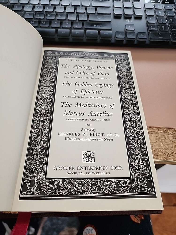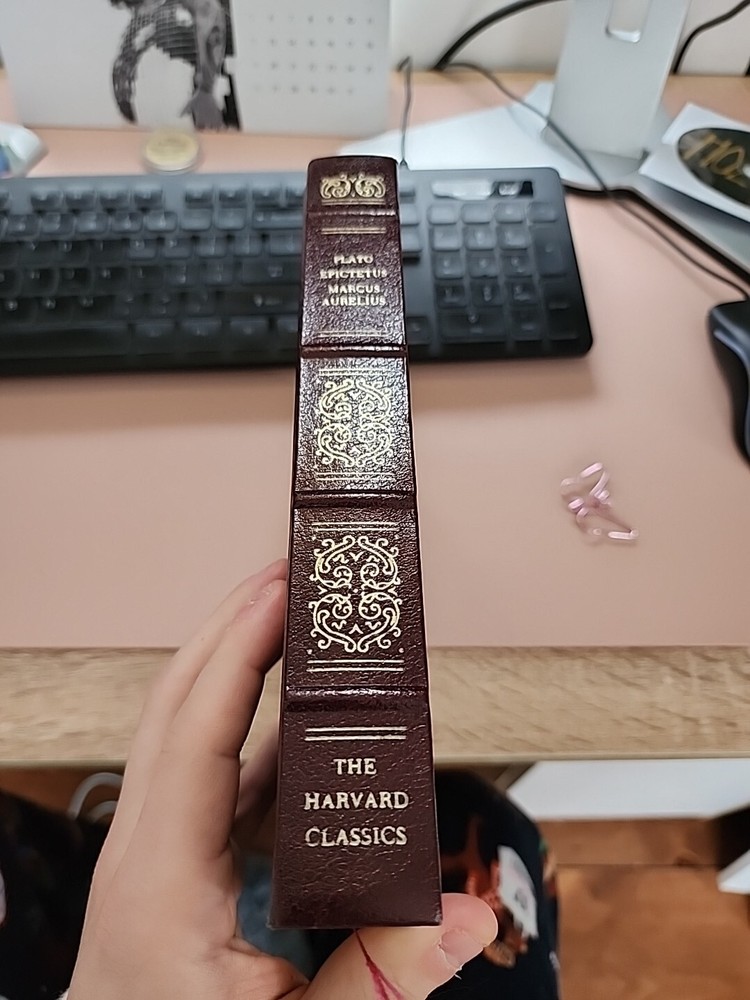 The product is a collector's edition of "The Harvard Classics" featuring the works of Plato, Epictetus, and Marcus Aurelius. Published in 1980 by Grolier Enterprise Corp. in Connecticut, this original edition is bound in leather and includes philosophical writings in English. The book is part of the "Classics" topic and is associated with the "Harvard Classics" character family.