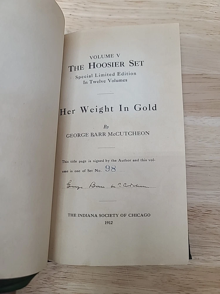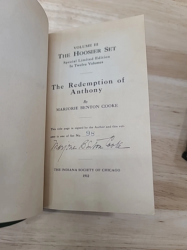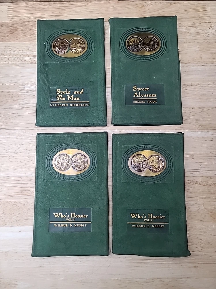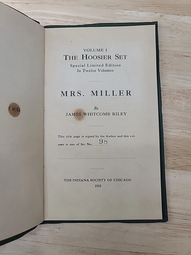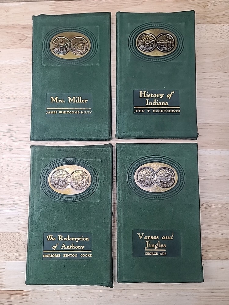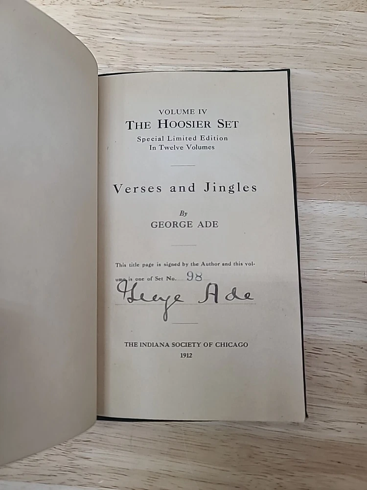 Volume 1. Riley, J.W. Mrs. Miller Volume 2. McCutcheon, J.T. History of Indiana Volume 3. Cooke, M.B. The redemption of Anthony Volume 4. Ade, G. Verses and jingles Volume 5. McCutcheon, G.B. Her weight in gold Volume 6. Hubbard, F.M. Short furrows Volume 7. Wason, R.A. The dog and the child and the ancient sailor man Volume 8. Porter, G.S. After the flood Volume 9. Nicolson, M. Style and the man Volume 10. Major, C. Sweet Alyssum Volumes 11-12. Nesbit, W.D. Who's Hoosier I & II.
