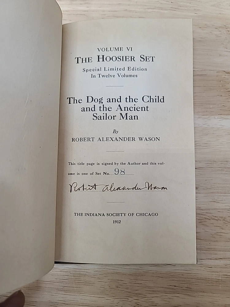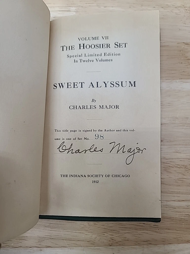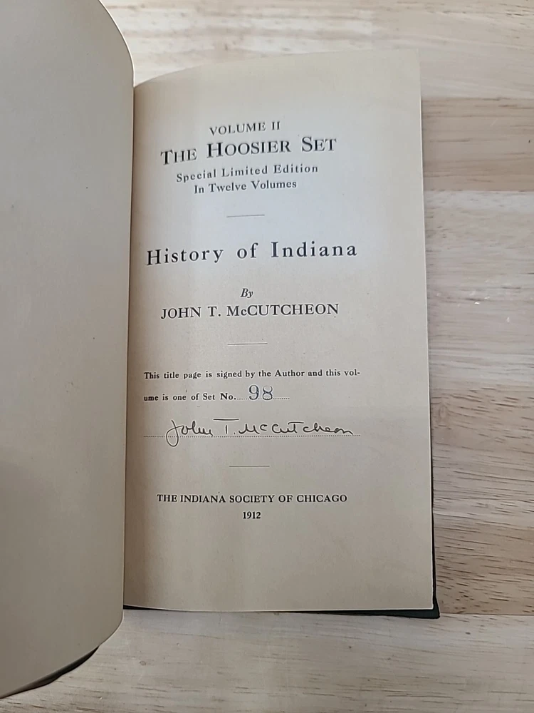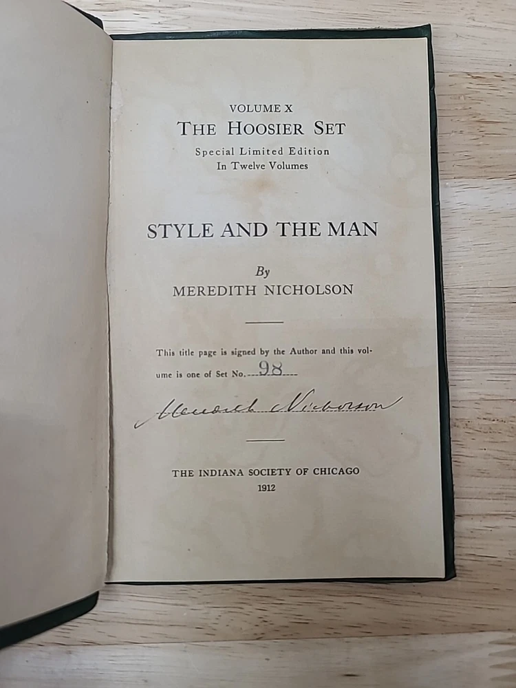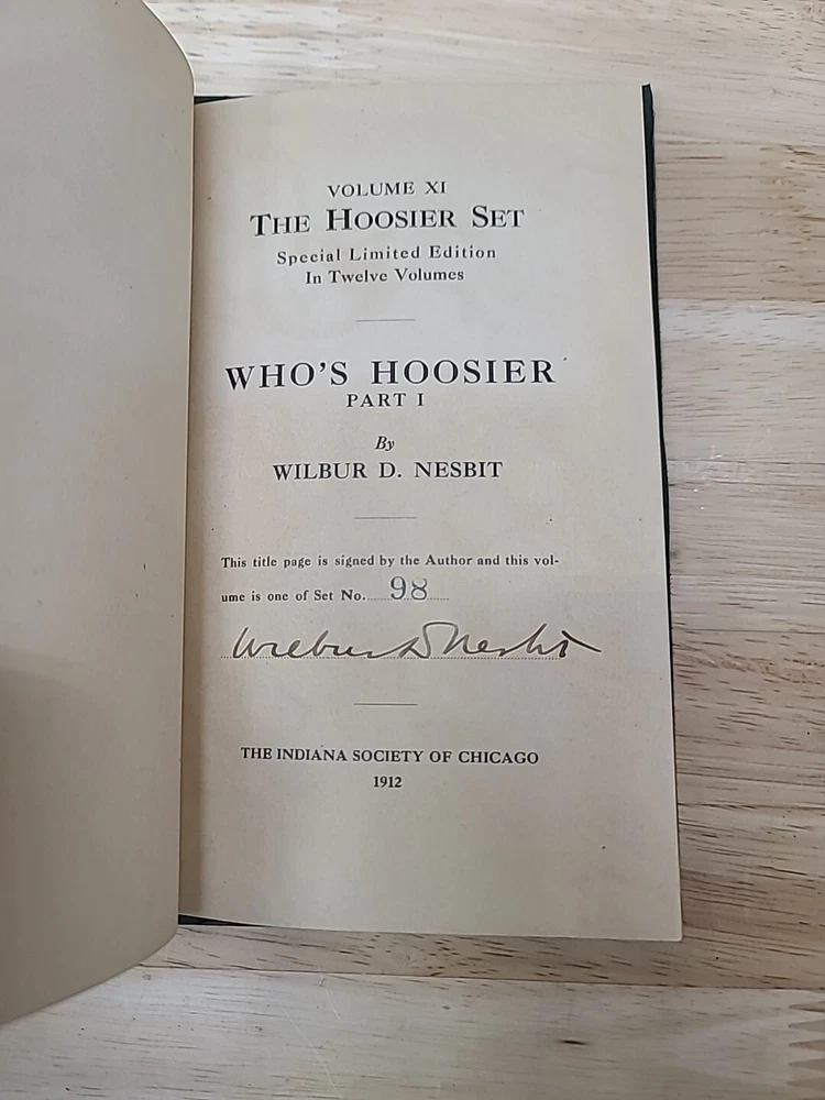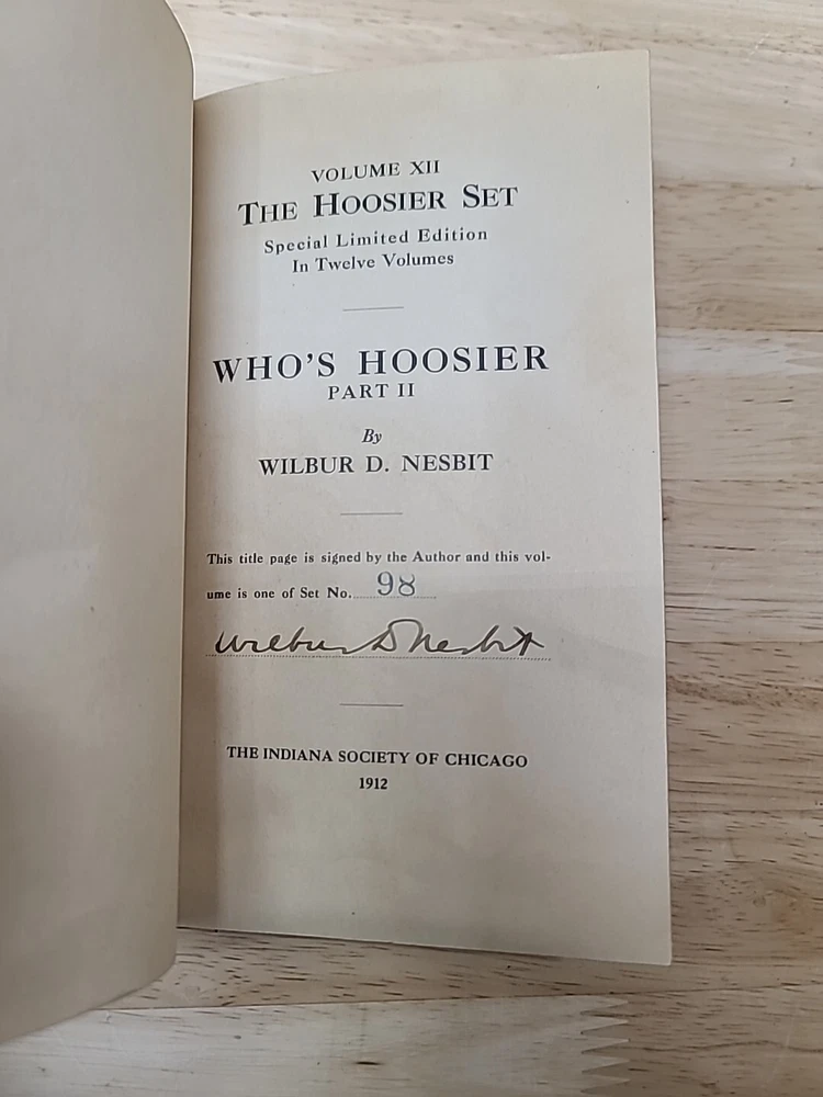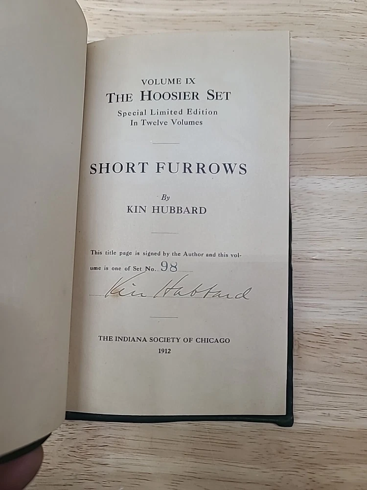Volume 1. Riley, J.W. Mrs. Miller Volume 2. McCutcheon, J.T. History of Indiana Volume 3. Cooke, M.B. The redemption of Anthony Volume 4. Ade, G. Verses and jingles Volume 5. McCutcheon, G.B. Her weight in gold Volume 6. Hubbard, F.M. Short furrows Volume 7. Wason, R.A. The dog and the child and the ancient sailor man Volume 8. Porter, G.S. After the flood Volume 9. Nicolson, M. Style and the man Volume 10. Major, C. Sweet Alyssum Volumes 11-12. Nesbit, W.D. Who's Hoosier I & II.