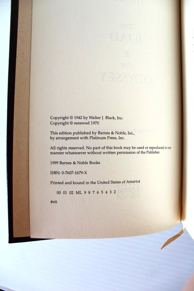 The Iliad & The Odyssey by Homer Collectible Gilt 1999 Barnes and Noble Edition The Iliad & The Odyssey by Homer collectible, hardback edition from Barnes & Noble in 1999 gilt page edges ribbon bookmark is attached In this edition, each epic is accompanied by a preface by Butler and a list of Principal Personages in the work. This would make a great gift. I will package it with care to protect it during shipping. New. The binding is very tight. The book is perfectly clean and without flaws. Please review the photos.