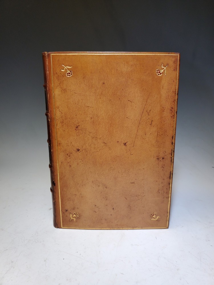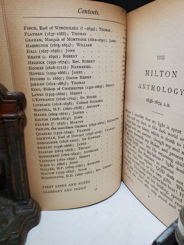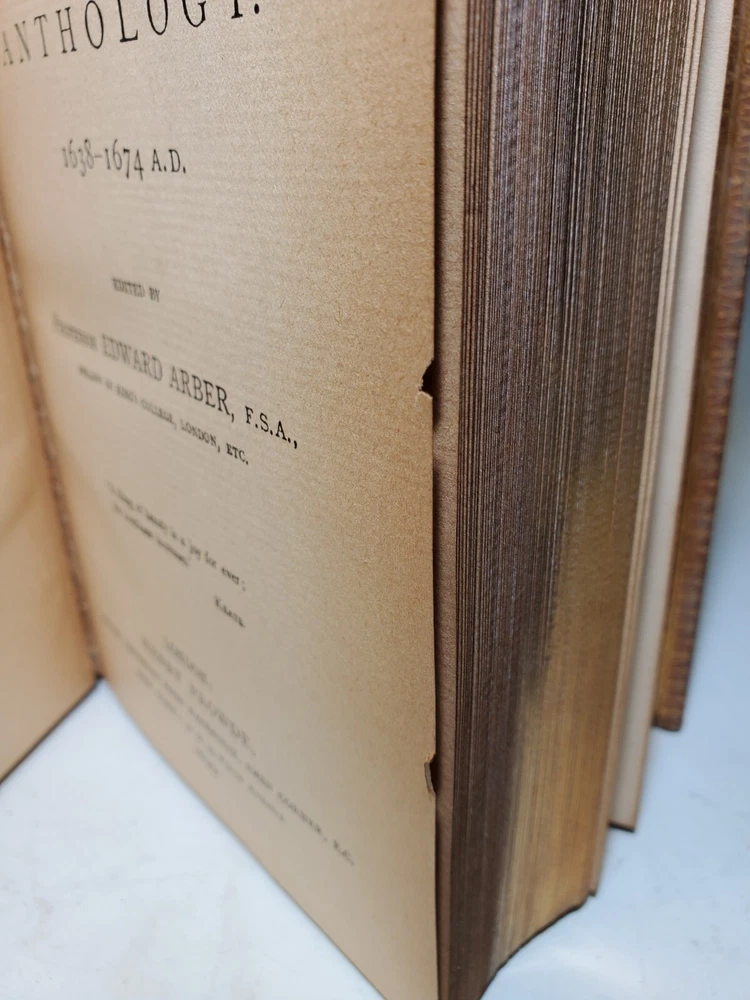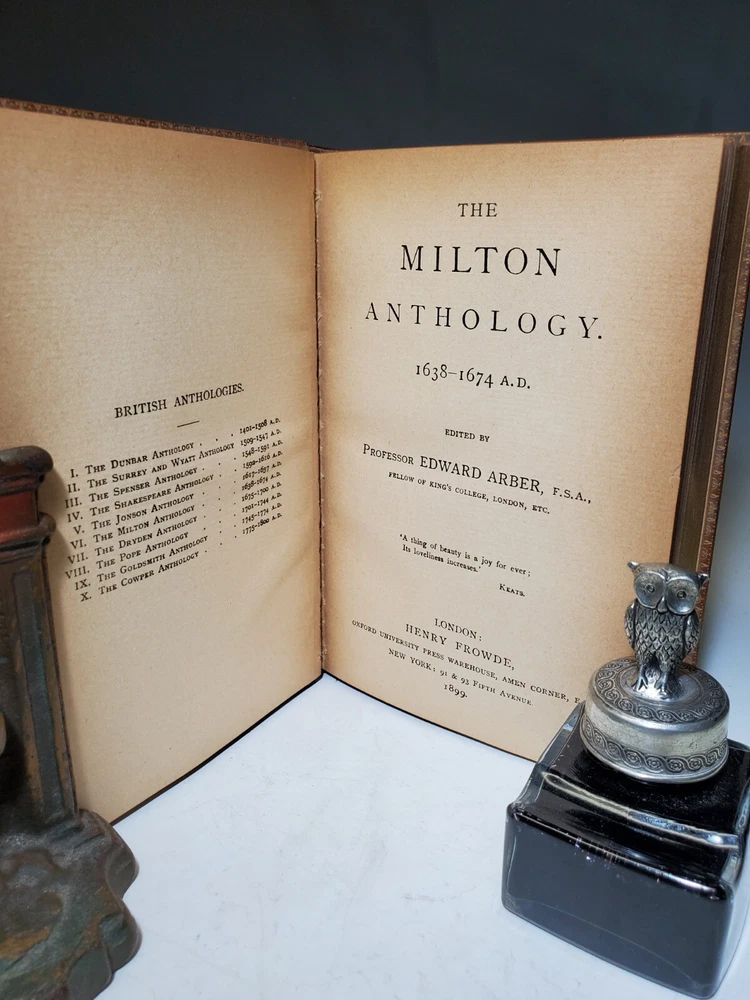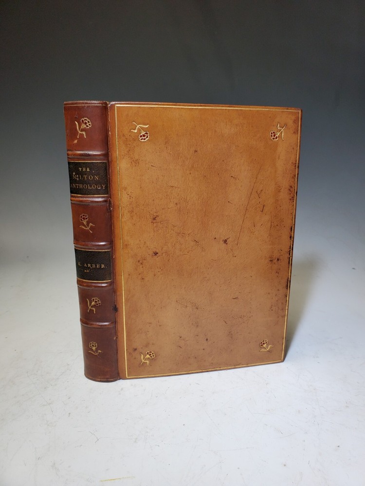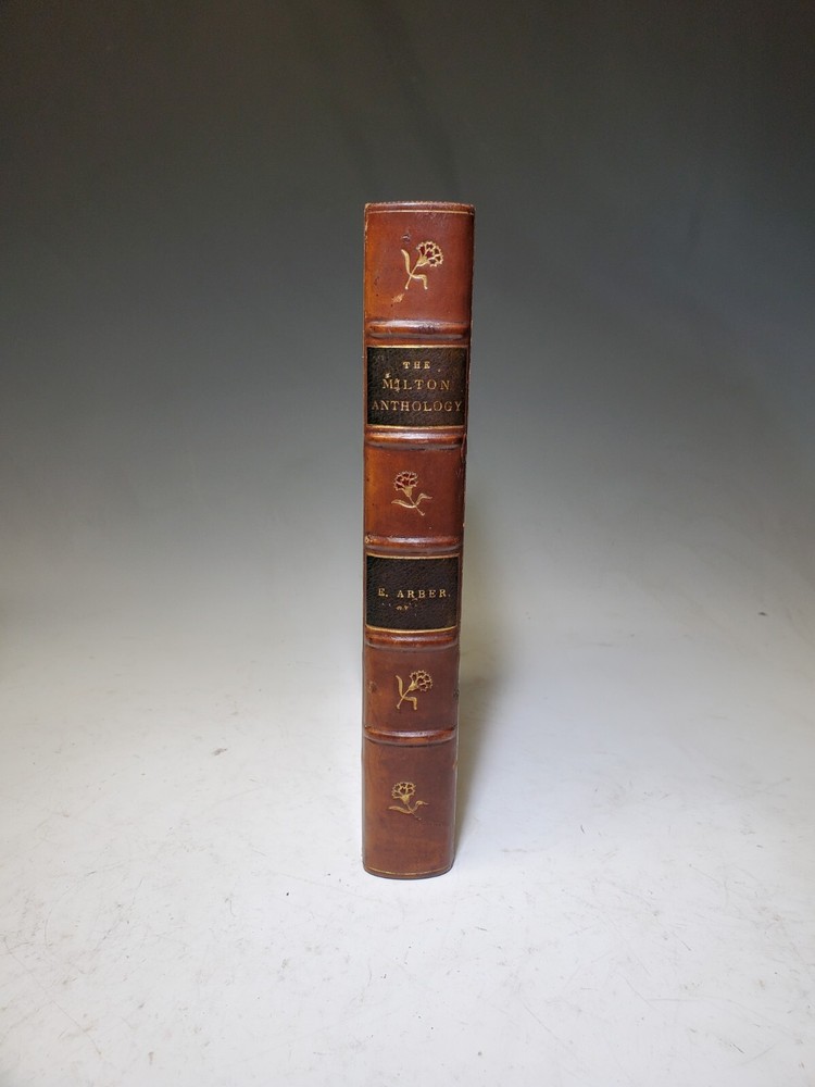 MILTON, John. The Milton Anthology 1638-1674 A.D. Edited by Edward Arber. London: Henry Frowde, 1899. Full polished calf leather binding with gilt decoration and black leather spine labels. All edges gilt. Marbled endpapers. 7.25" x 5.25" x 1.25" A beautifully bound anthology collection of poetry from the time John Milton lived and wrote, including poems by Samuel Butler, Charles I, Charles II, Robert Herrick, Andrew Marvell, and many more. Very minor wear to this beautiful binding. Two small nicks to paper of title page. Small spot of soiling to final page of text that continues on to next page.