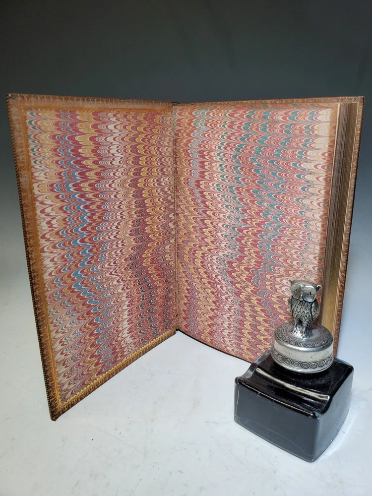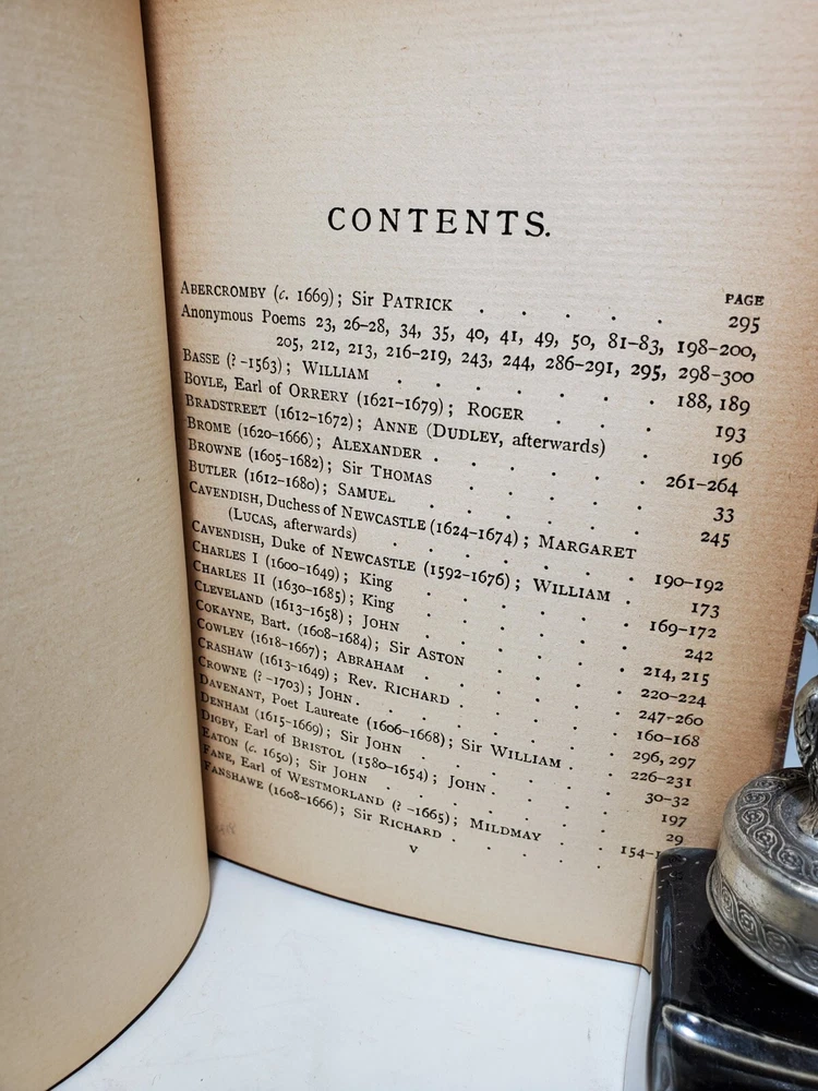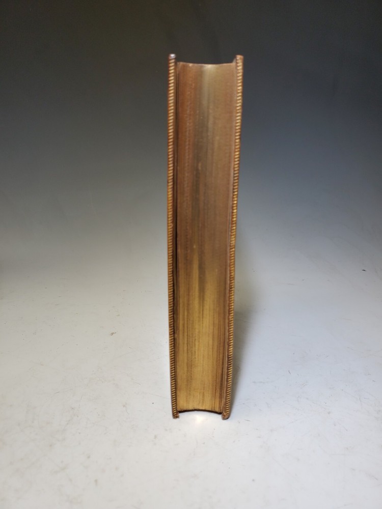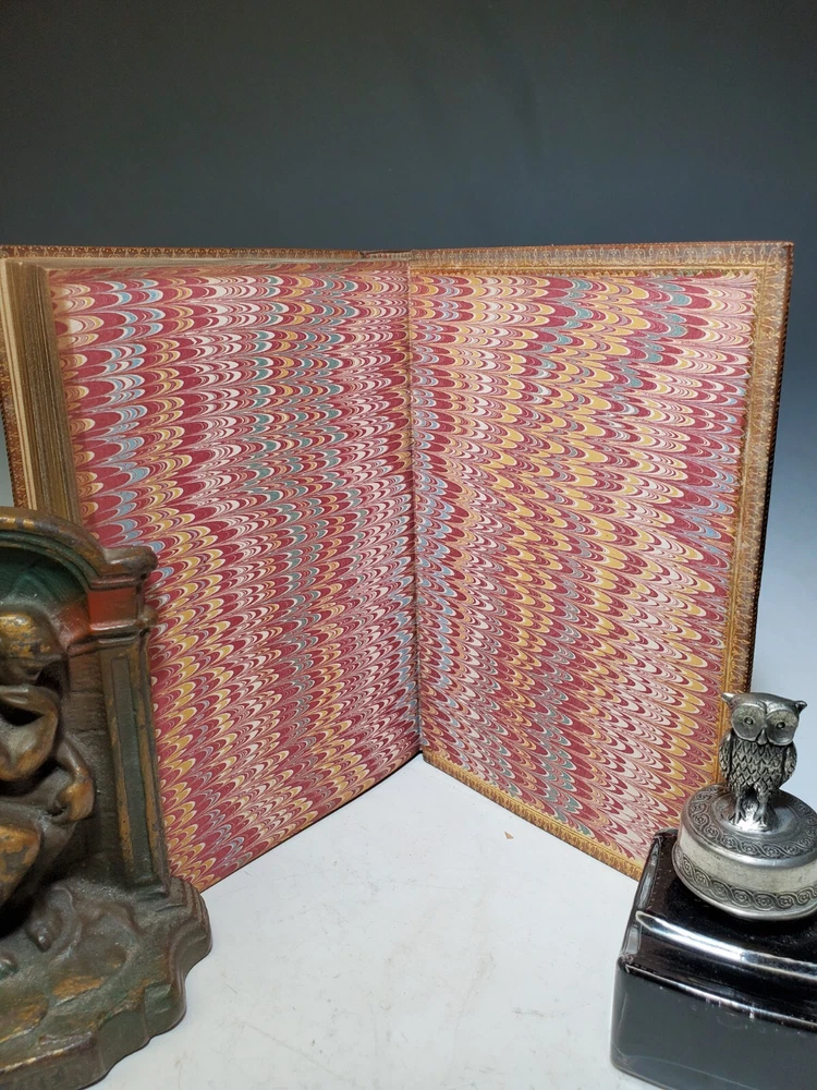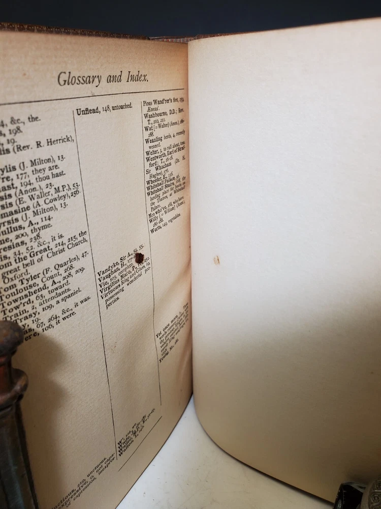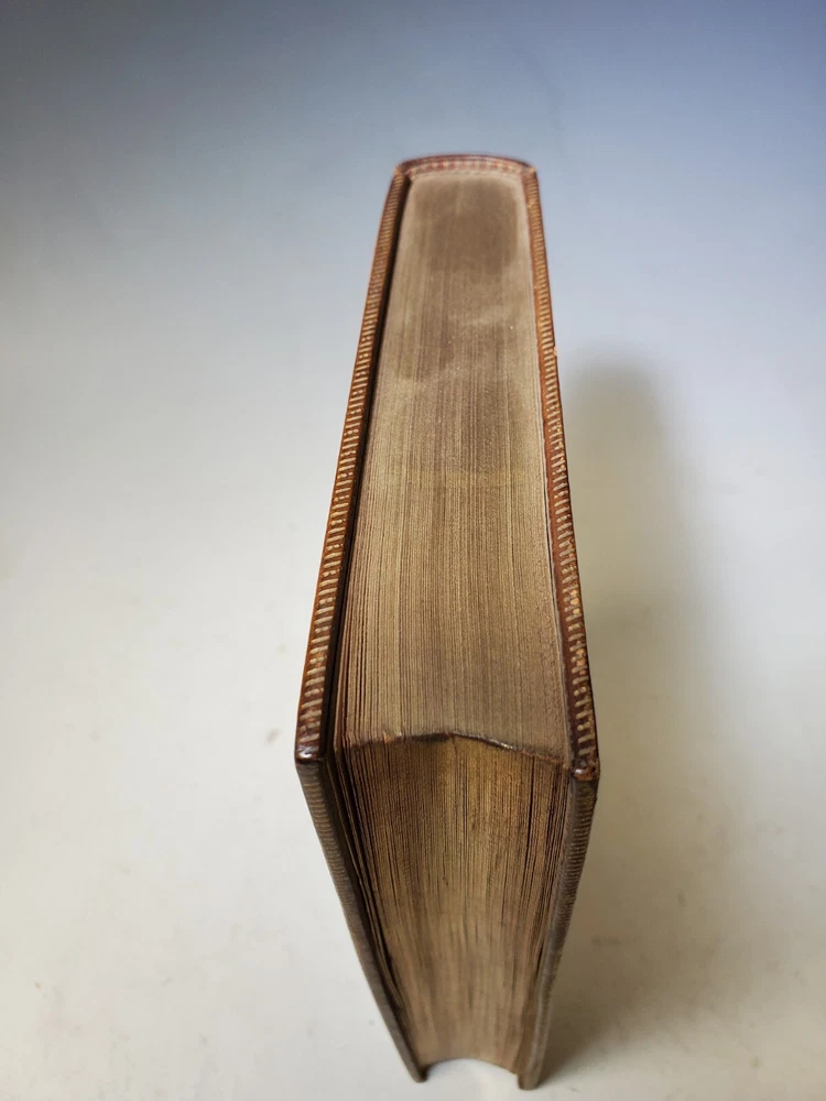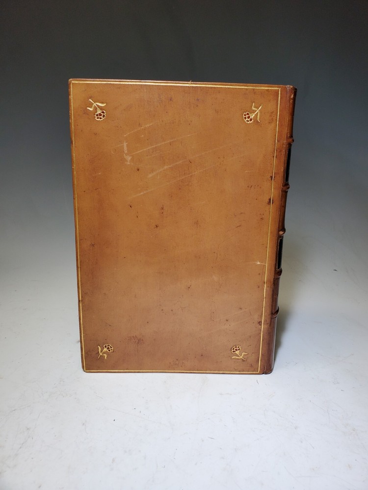 MILTON, John. The Milton Anthology 1638-1674 A.D. Edited by Edward Arber. London: Henry Frowde, 1899. Full polished calf leather binding with gilt decoration and black leather spine labels. All edges gilt. Marbled endpapers. 7.25" x 5.25" x 1.25" A beautifully bound anthology collection of poetry from the time John Milton lived and wrote, including poems by Samuel Butler, Charles I, Charles II, Robert Herrick, Andrew Marvell, and many more. Very minor wear to this beautiful binding. Two small nicks to paper of title page. Small spot of soiling to final page of text that continues on to next page.